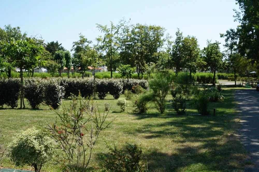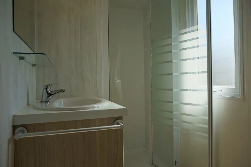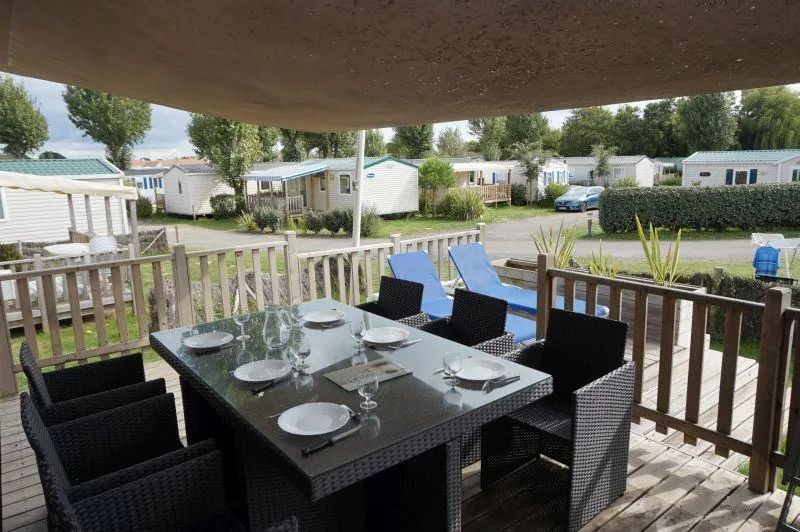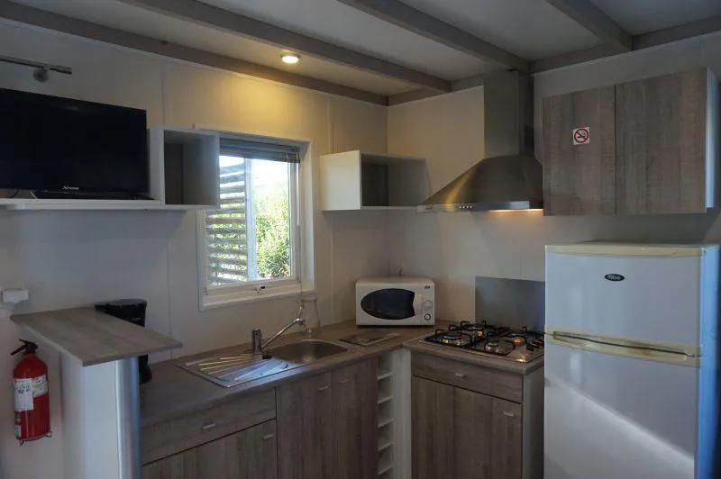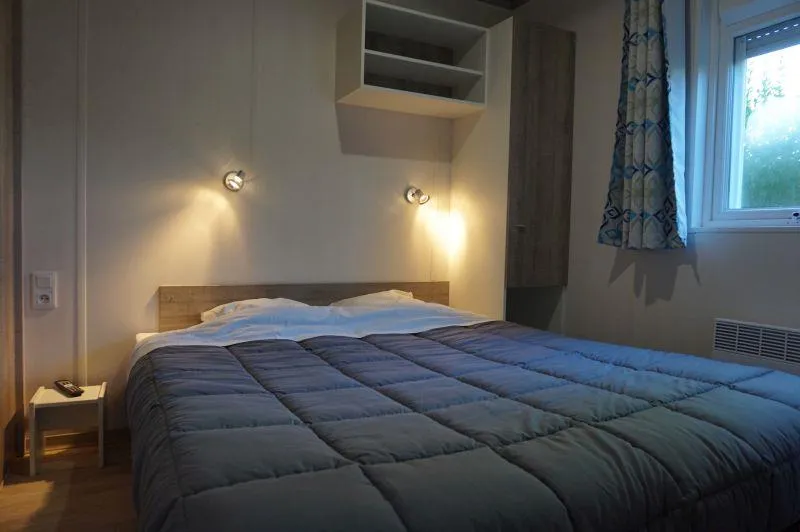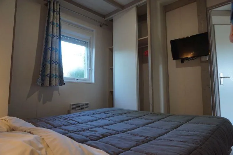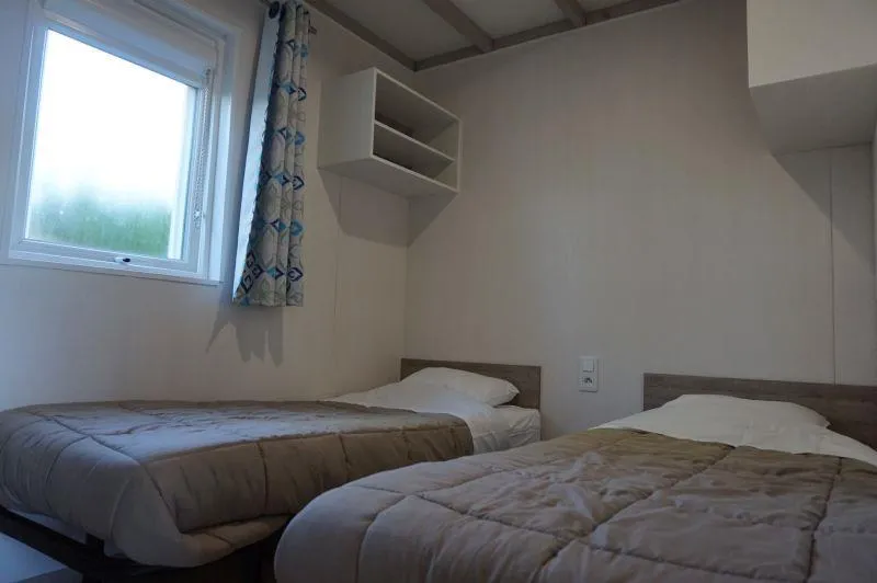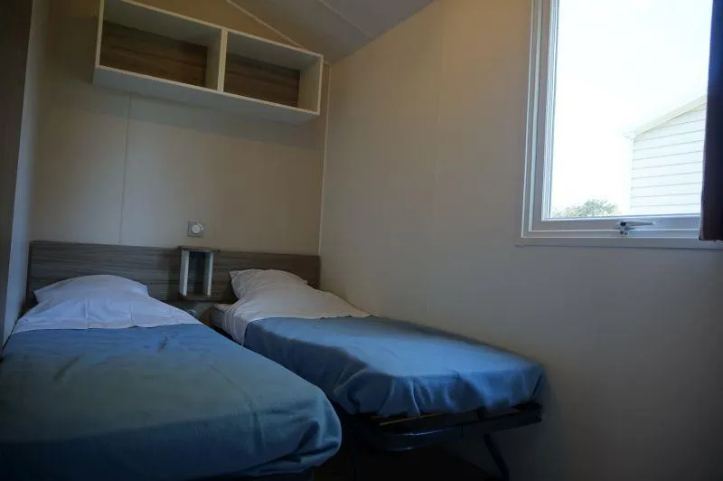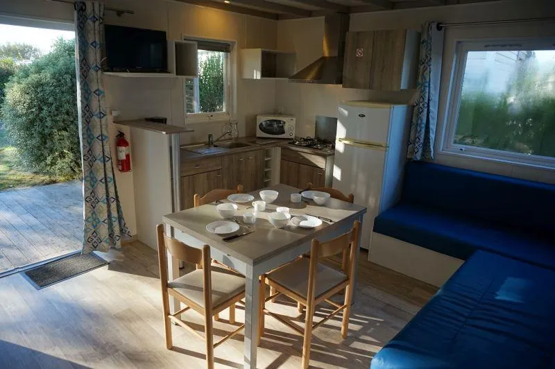 Das Mobilheim verfügt über : 1 Zimmer mit 1 Doppelbett 140X190cm. 1 Zimmer mit 2 Einzelbetten 80X190 cm. 1 Badezimmer mit Dusche, Waschbecken und WC. 1 Küche mit einem Kühlschrank, einem Gasherd mit 4 Kochstellen, einer Mikrowelle und einer Kaffeemaschine. 1 Wohnzimmer mit einem Tisch, Stühlen und einer Schlafcouch für 2 Kinder oder 1 Erwachsenen (120x140 cm). 1 Terrasse mit Gartenmöbeln, Liegestühlen / Chiliennes. Infos: Bettdecken oder Steppdecken, Kopfkissen werden gestellt. Bettwäsche, Handtücher und Reinigungsmittel werden nicht gestellt. Nicht vertragliche Fotos