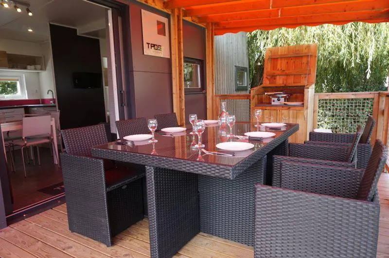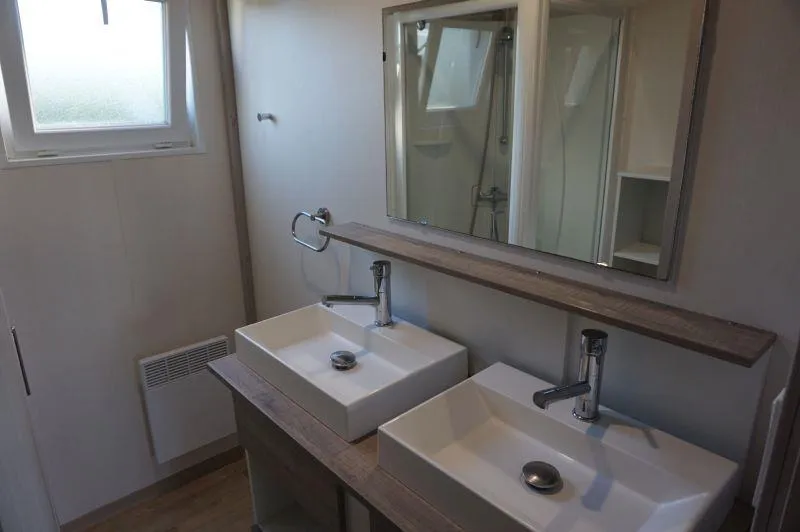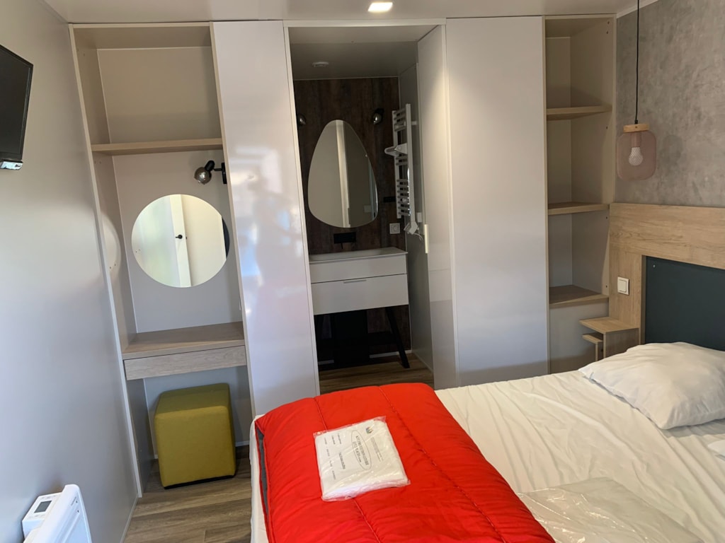 Das Mobilheim verfügt über: 1 Zimmer mit 1 Doppelbett 160X190cm, 1 Fernseher, eine Dusche mit Waschbecken. 1 Zimmer mit 2 Einzelbetten 80X190cm. 1 Zimmer mit Etagenbett 80X190cm. 1 Badezimmer mit Dusche, Waschbecken und WC. 1 separates WC. 1 Küche mit Kühlschrank, Herdplatte, Mikrowelle, Geschirrspüler und Nespresso-Kaffeemaschine. 1 Wohnzimmer mit Tisch, Stühlen, Sitzbank und 1 Fernseher. Klimaanlage 1 Holzterrasse mit Sonnensegel, Gartenmöbeln, Liegestühlen/Sonnenliegen. Eine Plancha oder BBQ. Infos: Bettdecken oder Federbetten und Kopfkissen werden bereitgestellt. Die Bettwäsche wird für den gesamten Aufenthalt bereitgestellt. Der Wechsel der Bettwäsche wird hingegen in Rechnung gestellt. Handtücher und Reinigungsmittel werden nicht gestellt. Nicht vertragliche Fotos