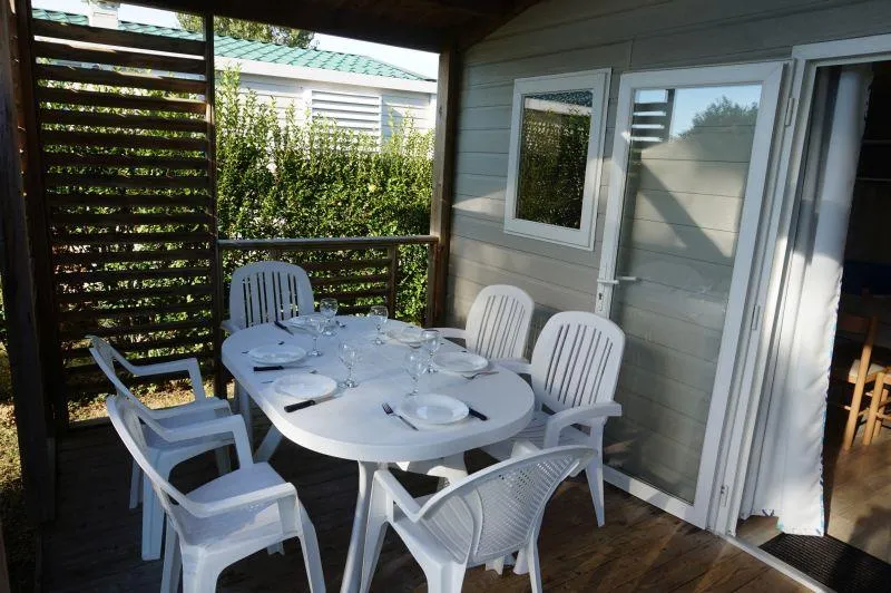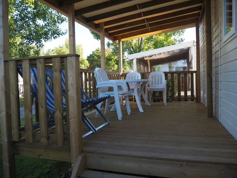 Das Mobilheim verfügt über : 1 Schlafzimmer mit 1 Doppelbett 140X190cm. Ein Badezimmer mit Dusche, Waschbecken und WC. 1 Küche mit Kühlschrank, Gasherd mit 4 Kochstellen, Mikrowelle, Kaffeemaschine. Das Wohnzimmer verfügt über einen Tisch mit Stühlen und eine ausziehbare Bank. Die Terrasse ist aus Holz und überdacht mit Gartenmöbeln, Liegestühlen/Sonnenliegen. Infos: Bettdecken oder Federbetten und Kopfkissen sind vorhanden. Bettwäsche, Handtücher und Reinigungsmittel werden jedoch nicht bereitgestellt. Nicht vertragliche Fotos