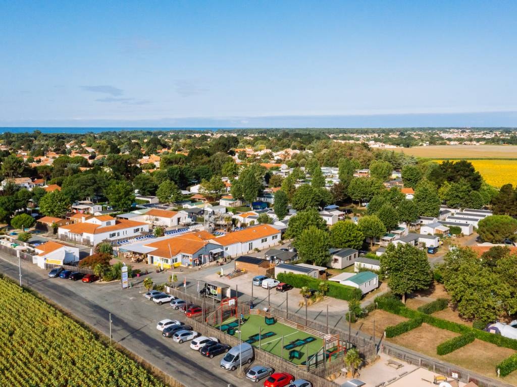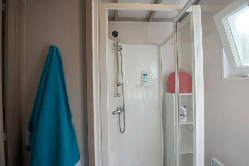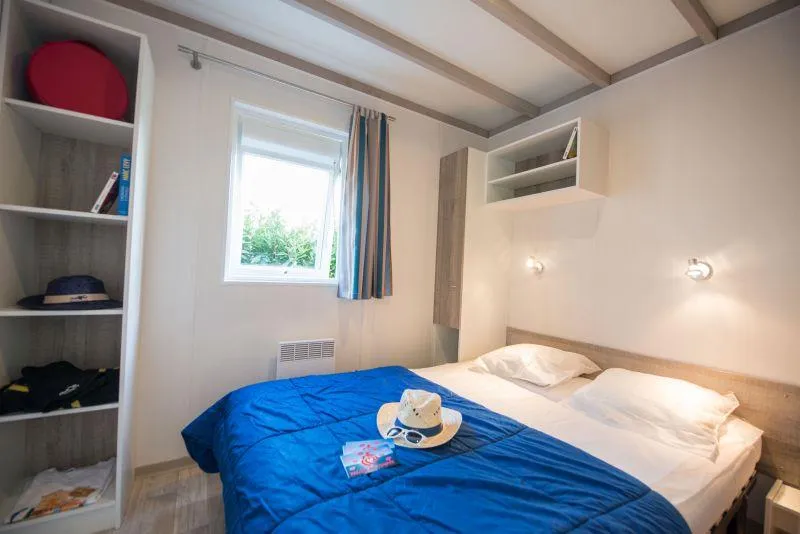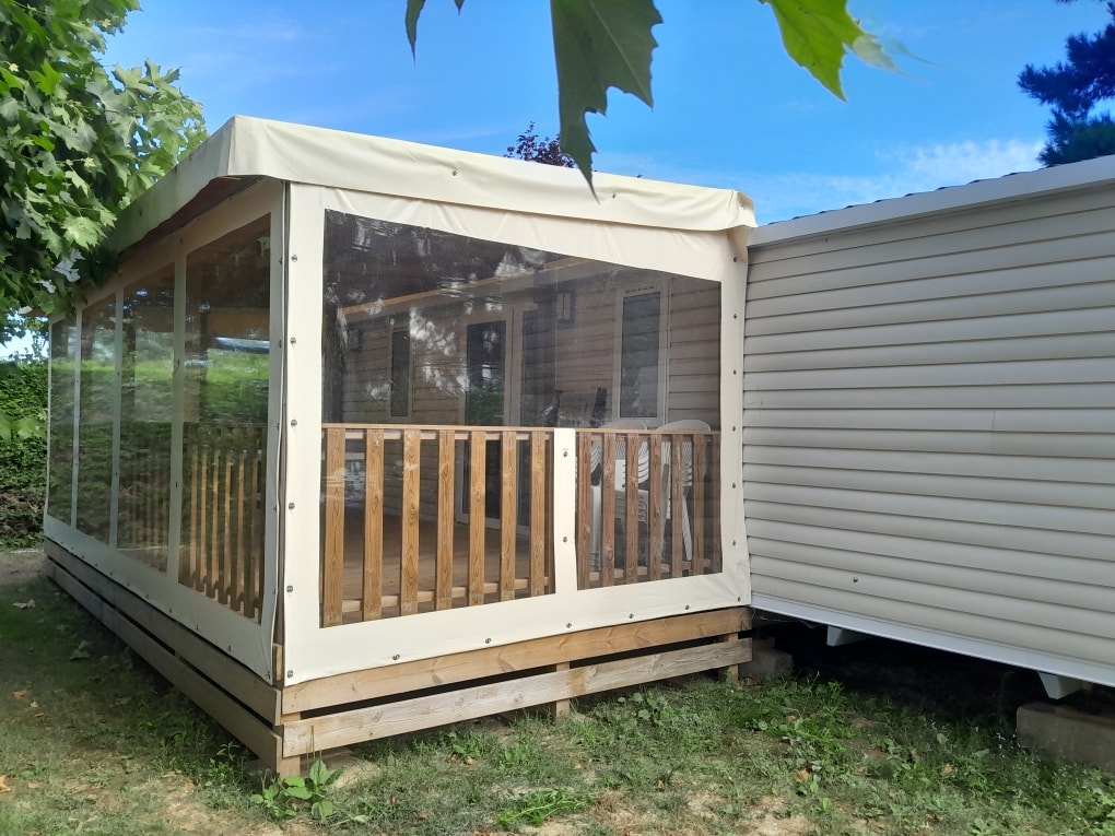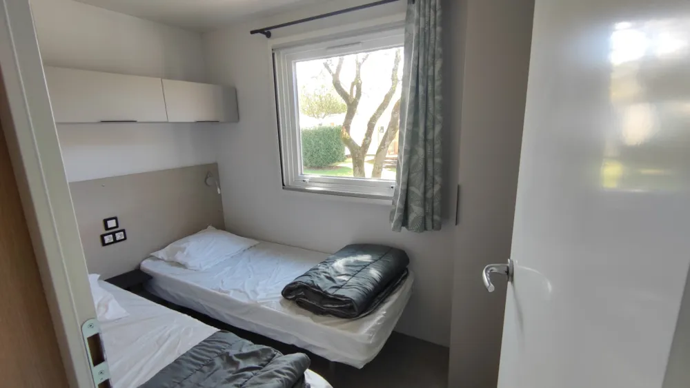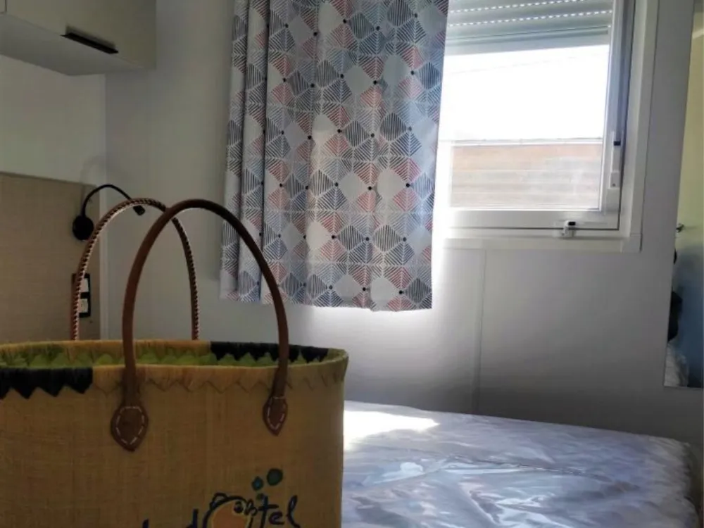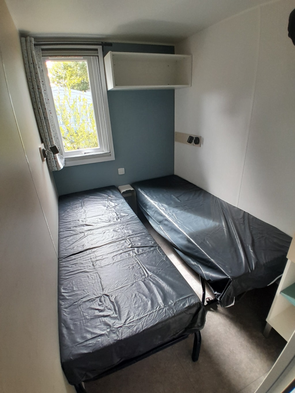MH Quatro - 40m² - 8 persons 4 bedrooms Beds: 2 beds (140x190) + 2 beds (80x190) + trundle bed Equipped kitchenette: hob, fridge, microwave, coffee machine, dishwasher ... 2 Bathroom with shower, washbasin - WC TV Semi-covered wooden terrace
