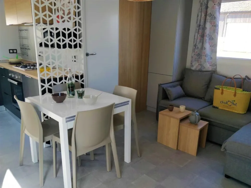 Unser Mobilheim verfügt über: 1 Schlafzimmer mit 1 Doppelbett 140X190cm. 1 Schlafzimmer mit 2 Einzelbetten 80X190cm. 1 Badezimmer mit Dusche, Waschbecken, WC. 1 Küche mit Kühlschrank, Gasherd mit 4 Kochstellen, Mikrowelle, Kaffeemaschine. 1 Wohnzimmer mit Tisch, Stühlen und einer ausziehbaren Bank für 2 Personen 130X190cm. 1 Holzterrasse mit Gartenmöbeln, Liegestühlen/Sonnenliegen. Klimaanlage Infos: Bettdecken oder Federbetten und Kopfkissen werden bereitgestellt. Bettwäsche (gegen Aufpreis und nach vorheriger Reservierung), Handtücher und Reinigungsmittel werden nicht bereitgestellt. Sonnenschirm zur Verfügung, wenn die Terrasse nicht überdacht ist Nicht vertragliche Fotos