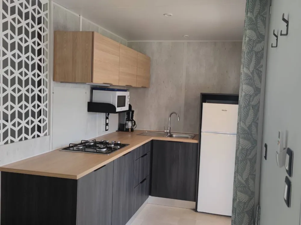 1 Cuisine équipée d'un frigo, plaque de cuison, micro-ondes, Lave-vaisselle, Cafetière Nespresso.