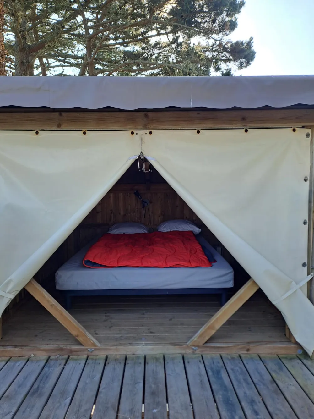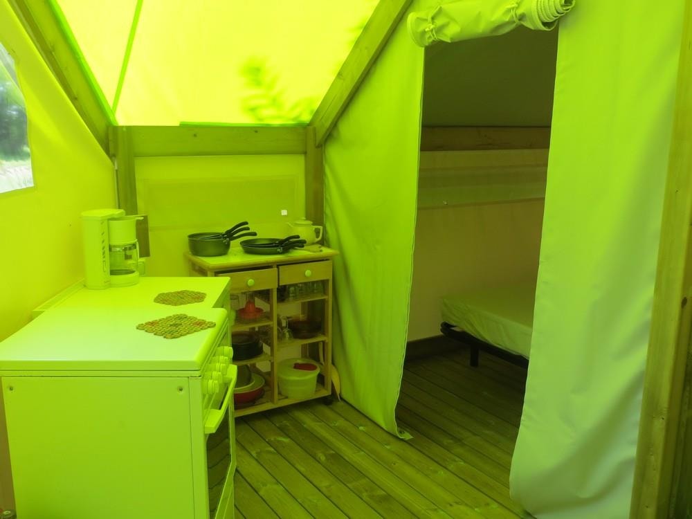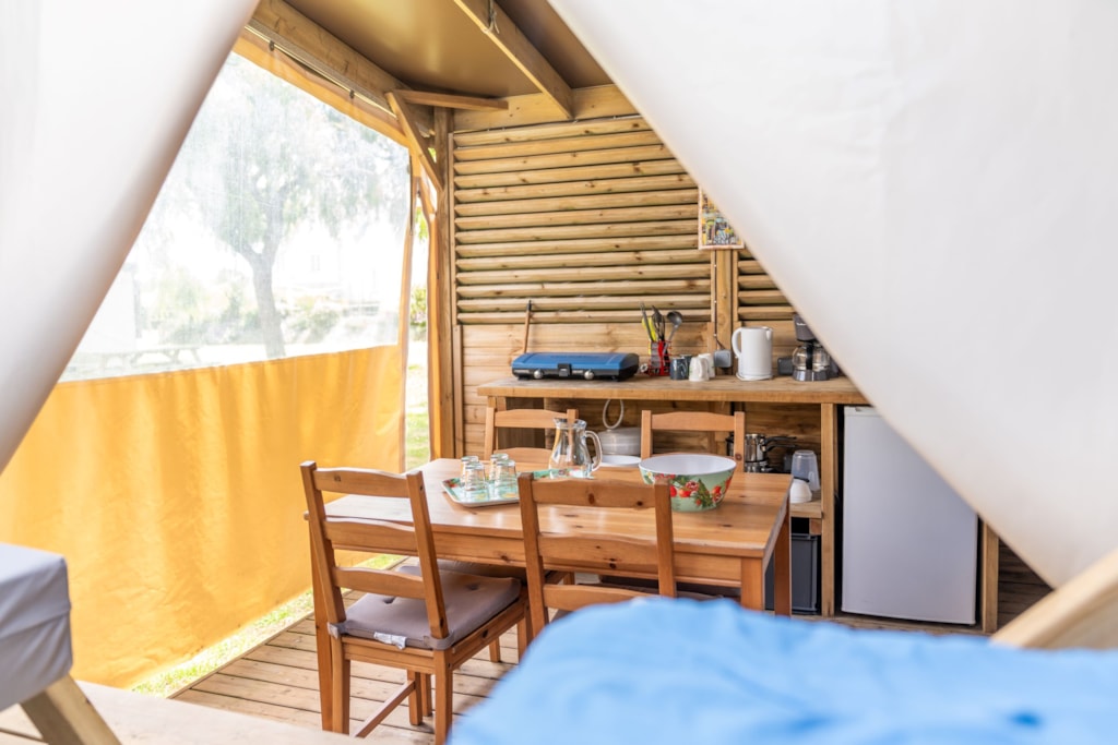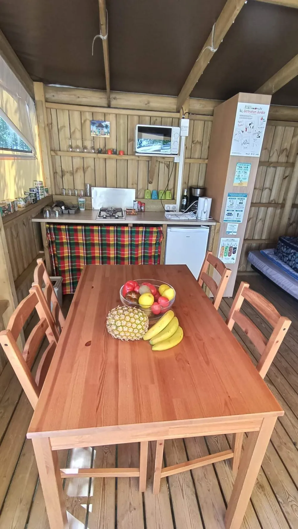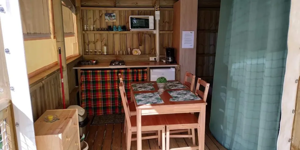 Cabane en bois et toile en hauteur, au coeur de la nature offrant plusieurs espaces de vie : un espace repas spacieux et agréable, un espace rangement pour les vélos et un espace couchage sur toile confortable et en toute sécurité.
