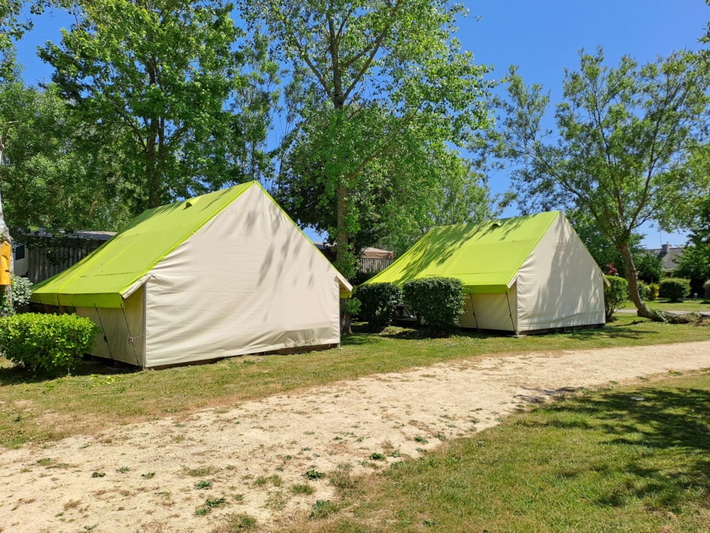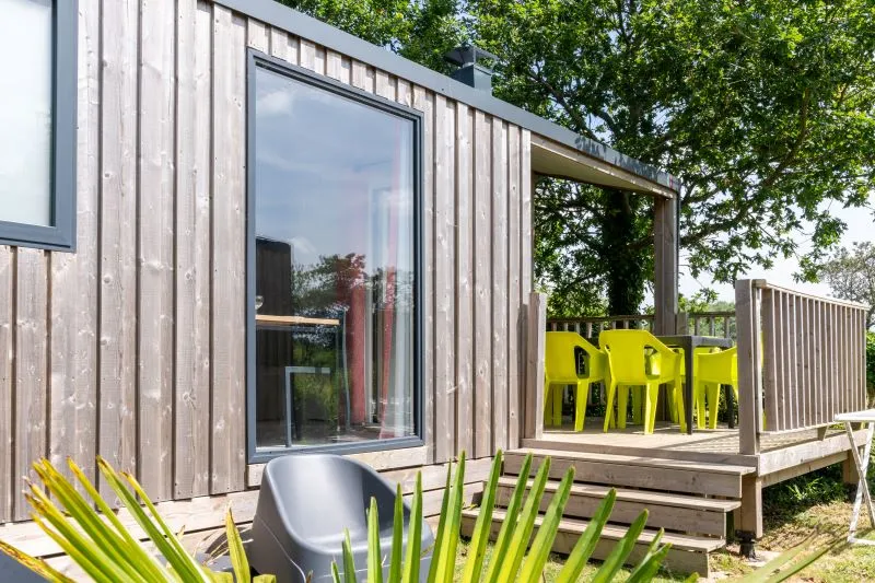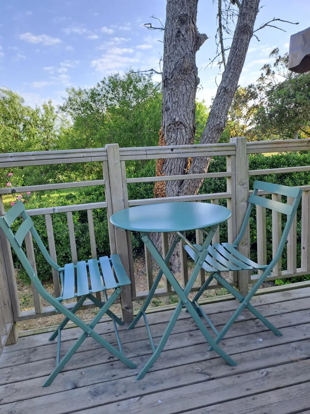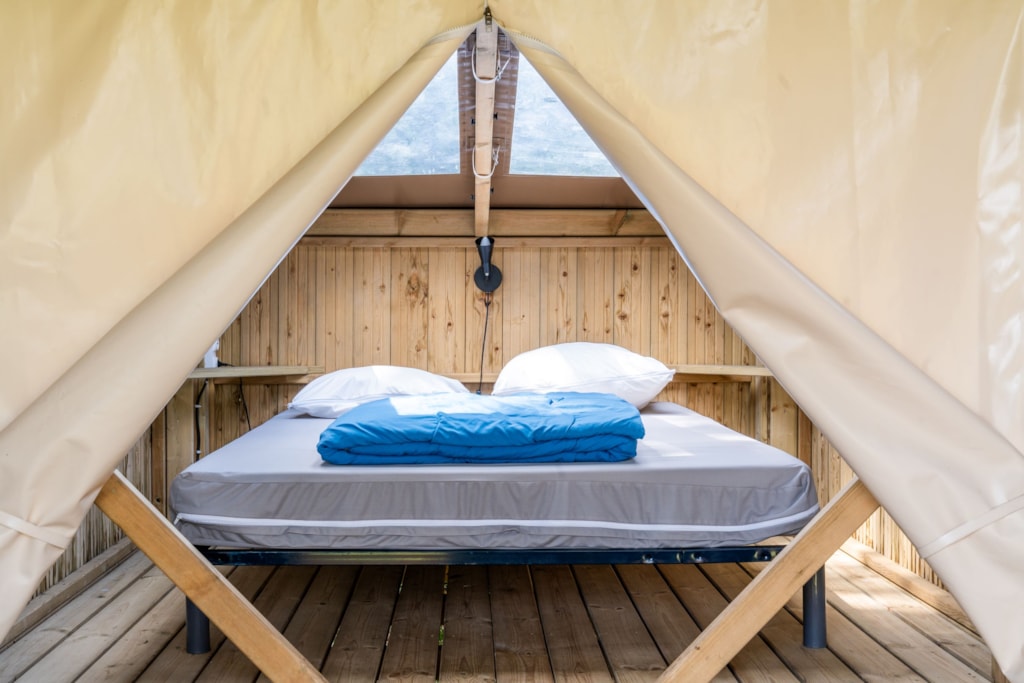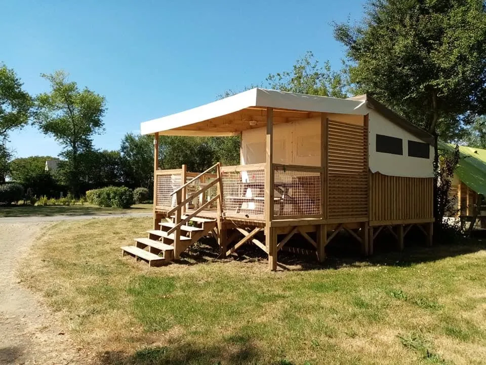 Cabane en bois et toile en hauteur, au coeur de la nature offrant plusieurs espaces de vie : un espace repas spacieux et agréable, un espace rangement pour les vélos et un espace couchage sur toile confortable et en toute sécurité.