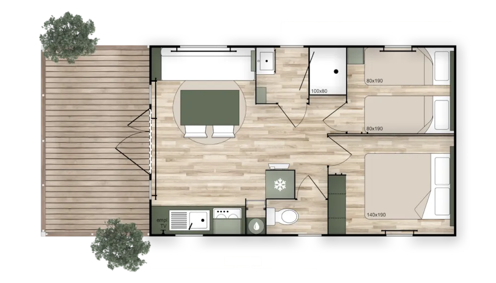 Das Mobilheim ist für 2 Personen völlig ausreichend! Die schöne Veranda haben wir täglich genutzt. Bad und Küche alles sauber bei Anreise !
