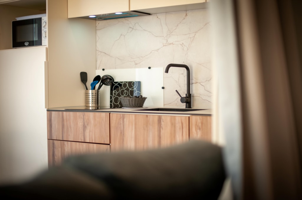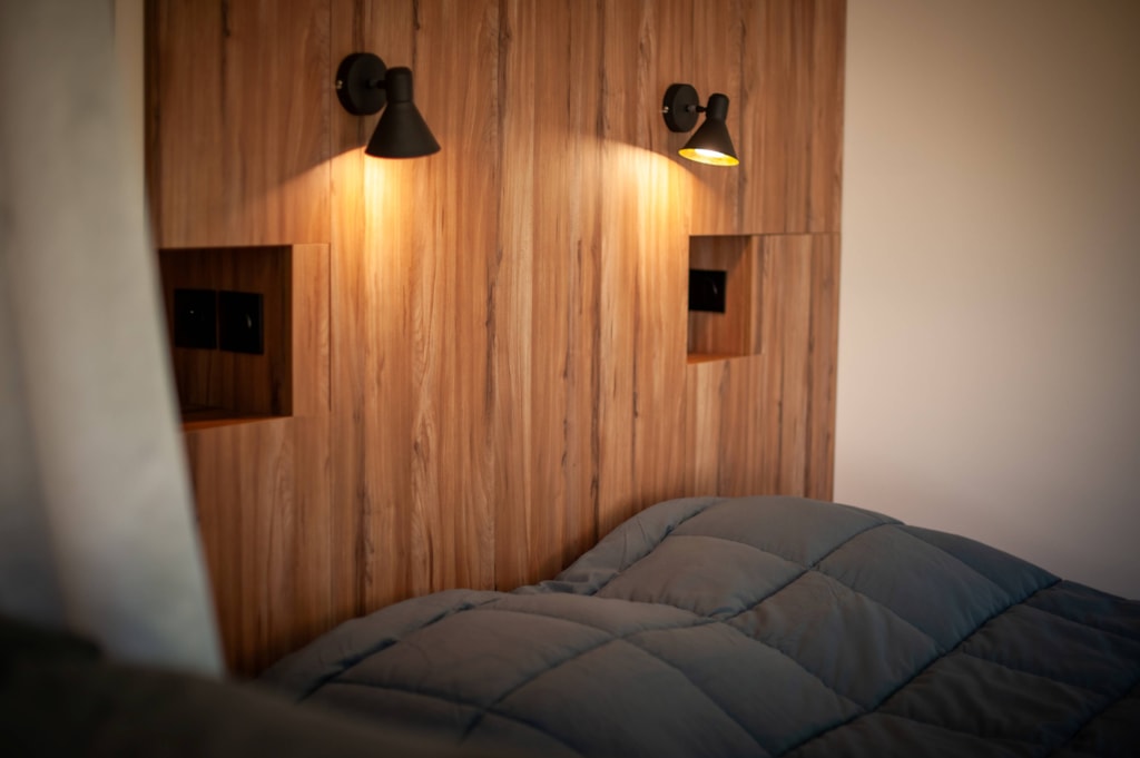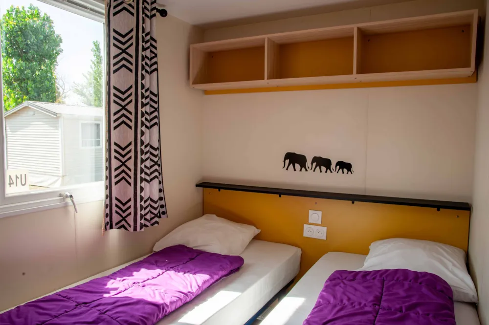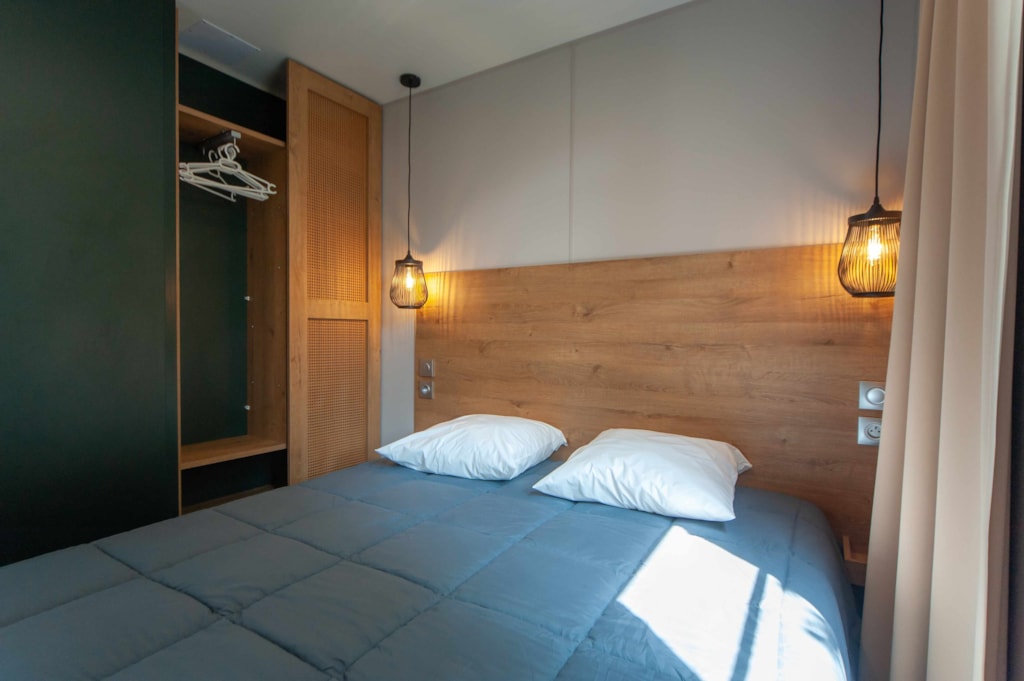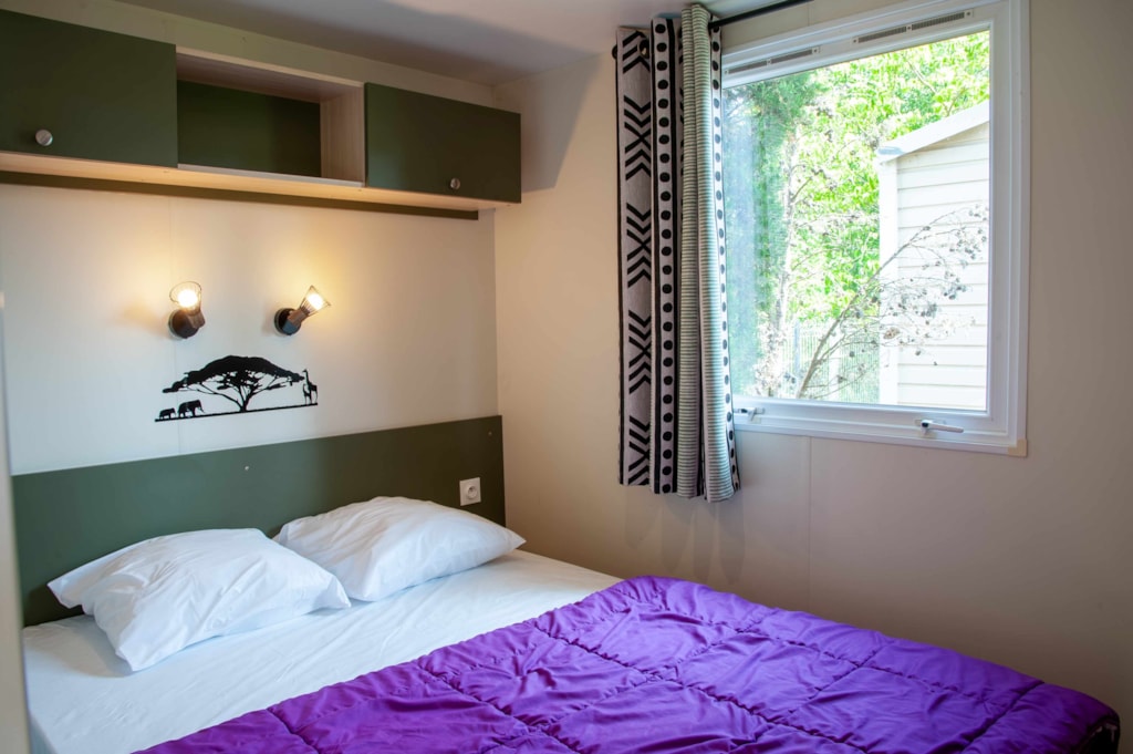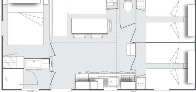 SAVANA + : Environ 32 m² 3 chambres : 1 chambre avec 1 grand lit en 160x190cm, 2 chambres avec 2 lits séparés mobiles (0,80 x 1,90), dans chaque chambre : couettes, oreillers (draps et serviettes non fournis). Salon spacieux, avec cuisine intégrée en ilot central, canapé convertible, nombreux rangements. Douche XXL et WC séparés. Grand réfrigérateur, four, micro-ondes, lave-vaisselle, grille pain, bouilloire, hotte aspirante, vaisselle,TV écran plat, etc. Climatisation air froid / air chaud.
