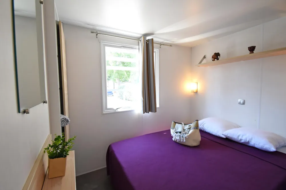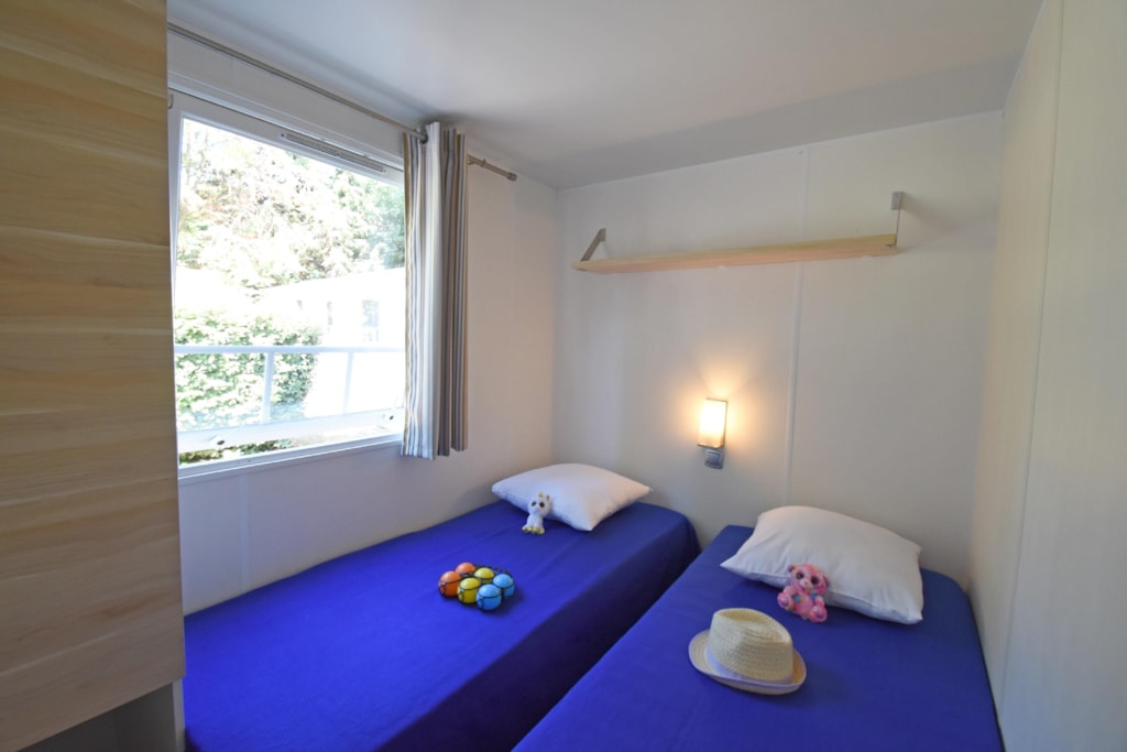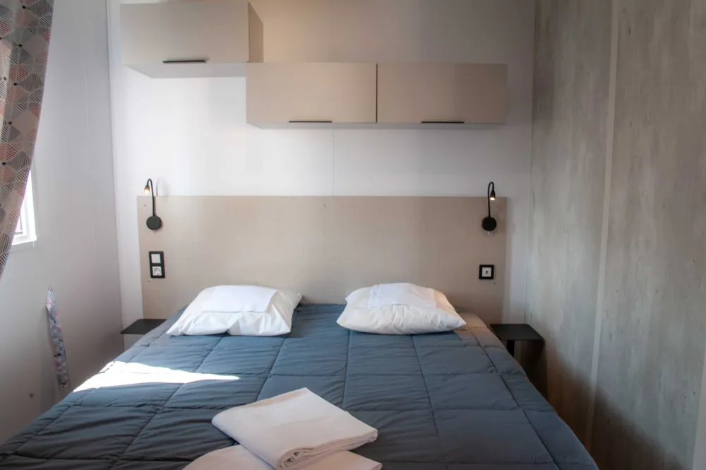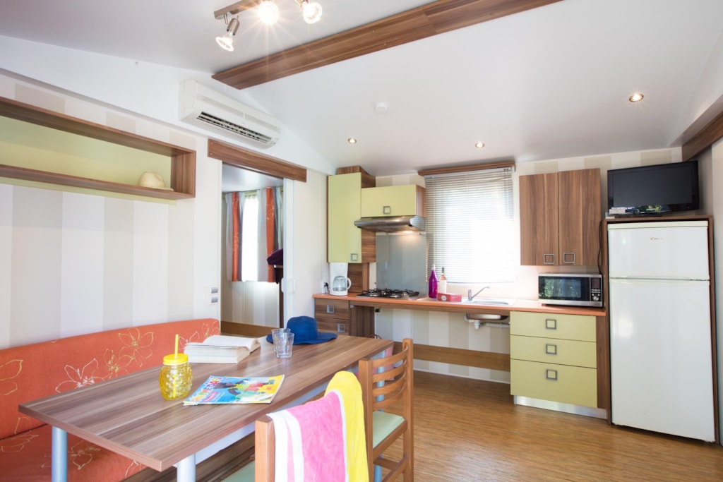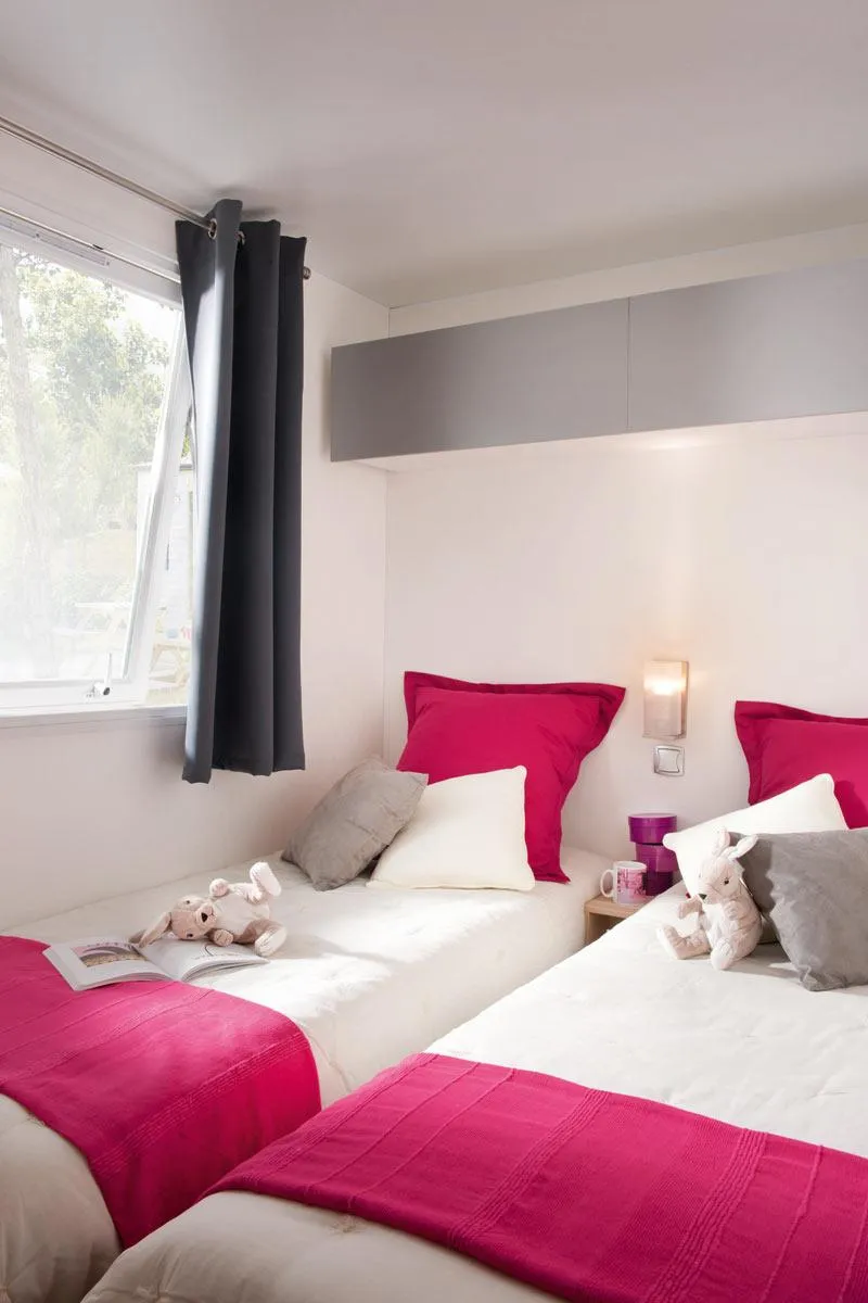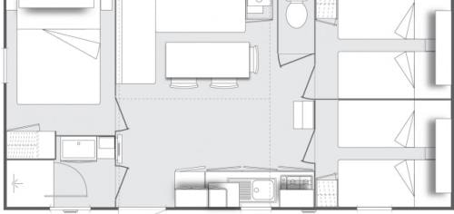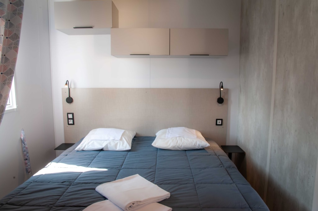 Ca. 34 m², 2 Schlafzimmer: 1 Doppelzimmer mit verschiebbar bett (1,60 x 2,00), 2 Leselampen, zusammenklappbarer Schminktisch, der Platz für ein Kinderbett bietet, und ein eigenes Bad (XL-Dusche-waschbecken-Stauraum-Haartrockner) - separates WC; 1 Schlafzimmer mit 2 verschiebbare Betten (0,80 x 1,90), 2 Leselampen, zusammenklappbarem Schminktisch und eigenem Bad (XL-Dusche-Waschbecken-Stauraum) - Separates WC. In jedem Raum Stauraum, Spiegel, Decken, Kissen, Matratzenschoner, Steckdose, geräumiges zentrales Wohnzimmer, Sofa mit integriertem Schlafbank, TV, diverse Stauräume und hohe Decken. Tisch mit 4 Stühlen. Großer Kühlschrank mit Gefrierfach, Mikrowelle mit Grill, Geschirrspüler, Kaffeemaschine, Wasserkocher, Toaster, Dunstabzugshaube, Spüle, Gasherd mit 4 Flammen, Geschirr. Draußen: Terrasse und Kunstrasen. 1 Plancha, 2 Armstühle, 1 Holztisch mit Bänken unter Schutz, 1 Wäscheständer. Mobilheim isoliert und mit Doppelverglasung an allen Fenstern ausgestattet.Inklusive Klimaanlage kalt / warm. Optional: Bettwäscheverleih, WLAN. Auf Anfrage Hochstuhl und Kinderbett (gegen Aufpreis und nach Verfügbarkeit).