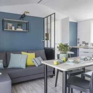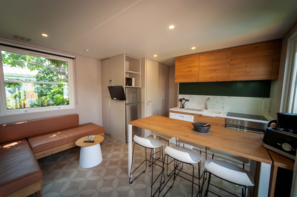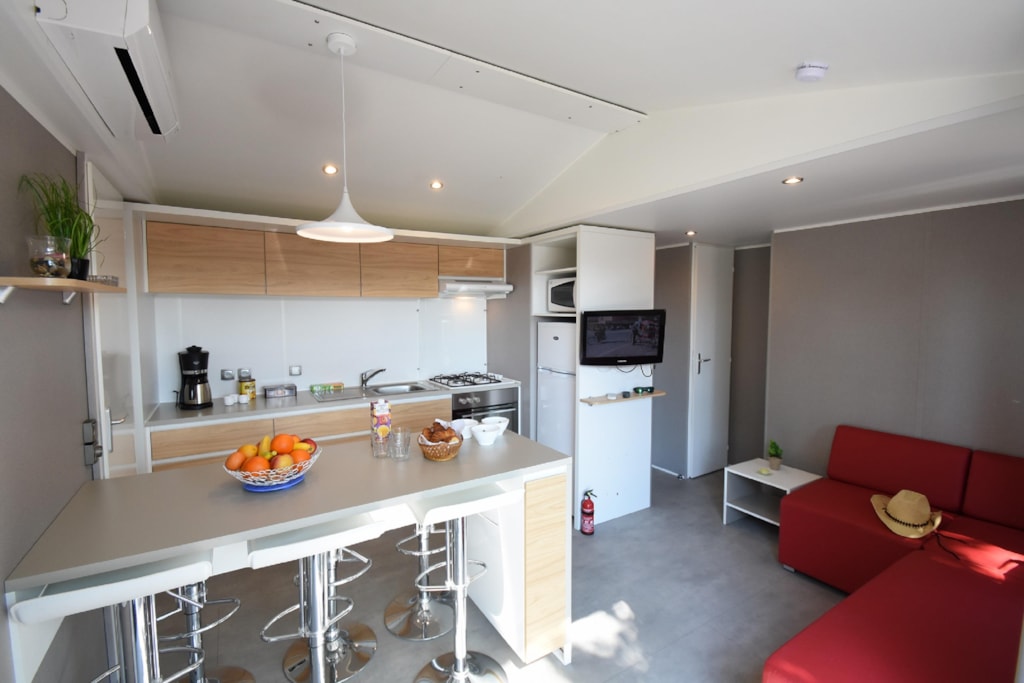 Salon central, banquette avec convertible intégré, TV + Climatisation air froid / air chaud inclus - Cuisine Table haute avec tabourets, réfrigérateur/Congélateur, micro-onde, plaque 2 feux et hotte aspirante intégrée, grille pain, bouilloire, cafetière expresso, vaisselle, etc -