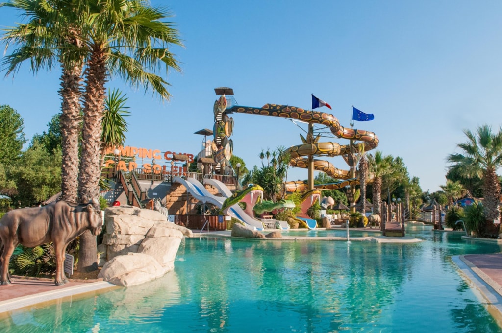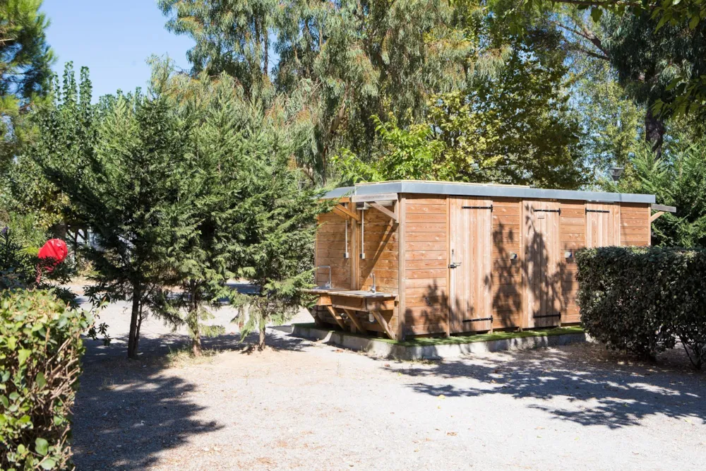 Stellplatz mit einer abschließbaren privaten Kabine, bestehend aus einem Waschbecken, einer Toilette und einer Dusche. Außenbecken.