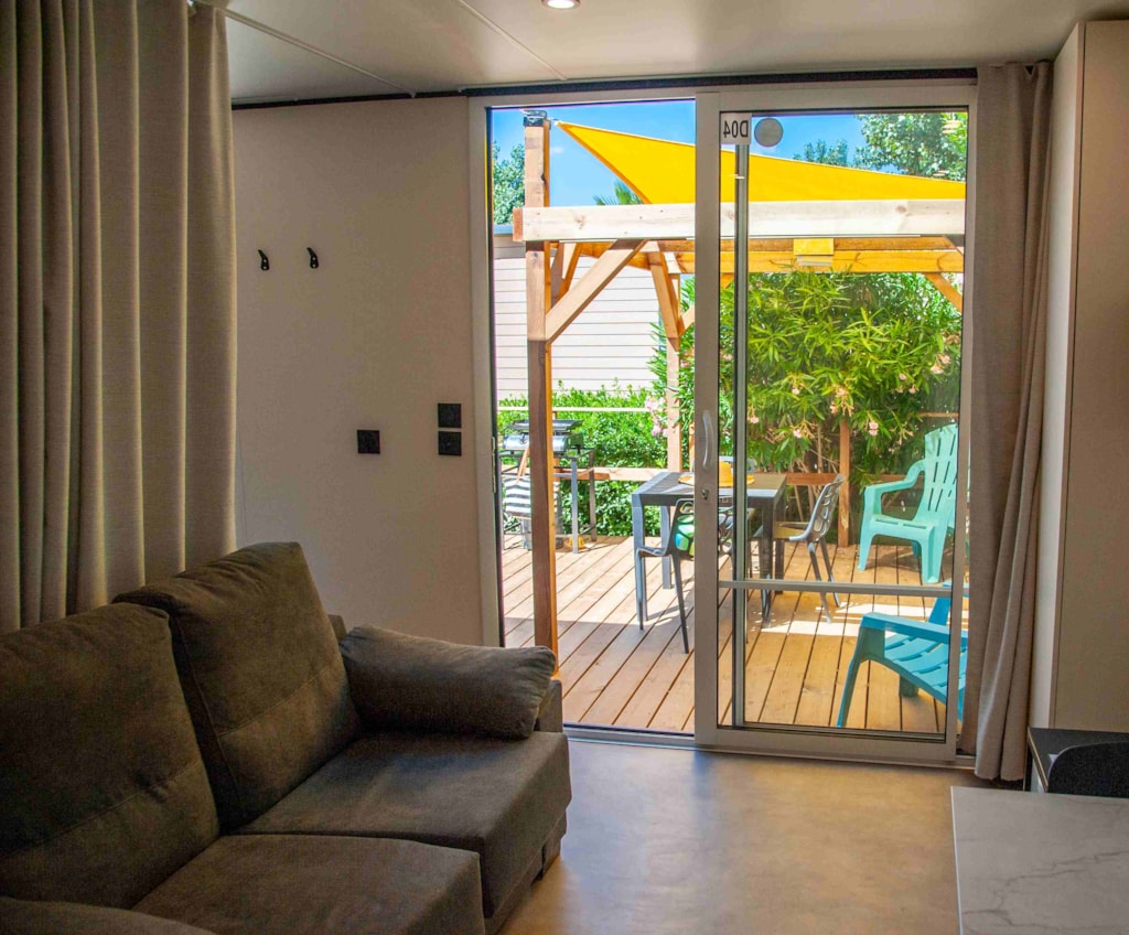 ca. 37 m2. 3 Schlafzimmer: 1 großes Schlafzimmer mit 1 x beweglichem Bett (1,60 x 2,00) und einem privaten Badezimmer (Waschbecken-Dusche-WC-Fön-Lagerung), 2 Schlafzimmer mit 2 beweglichen Betten (0,80 x 1,90 ). In jedem Zimmer Stauraum, Spiegel, Bettdecken, Kissen, Matratzenschutzfolien, Stecker. 2. Badezimmer mit Waschbecken-Dusche-Haartrockner Lagerung. Separate Toilette. Geräumiges zentrales Wohnzimmer, Ecksofa mit integriertem Klappbett, Couchtisch, TV, diverse Ablageflächen und Deckenhöhe. Hochtisch mit 6 Stühlen. Großer Kühlschrank mit Gefrierfach, Backofen, Mikrowelle, Geschirrspüler, Kaffeemaschine, Wasserkocher, Toaster, Dunstabzugshaube, Spüle, Gasherd (4 Flammen), Geschirr. Draußen, Terrasse und Kunstrasen. 1 Plancha, 2 Liegestuhle, Gartenmöbel aus exotischem Holz und ein Tisch mit 6 Stühlen beide unter Schutz Pergola, 1 Wäscheständer. Mobilheim isoliert und mit Doppelverglasung an jedem Fenster ausgestattet. Inklusive kalt / warm Klimaanlage, Bettwäsche und Wifi. Auf Anfrage, Hochstuhl und Kinderbett (mit Zuschlag und je nach Verfügbarkeit).