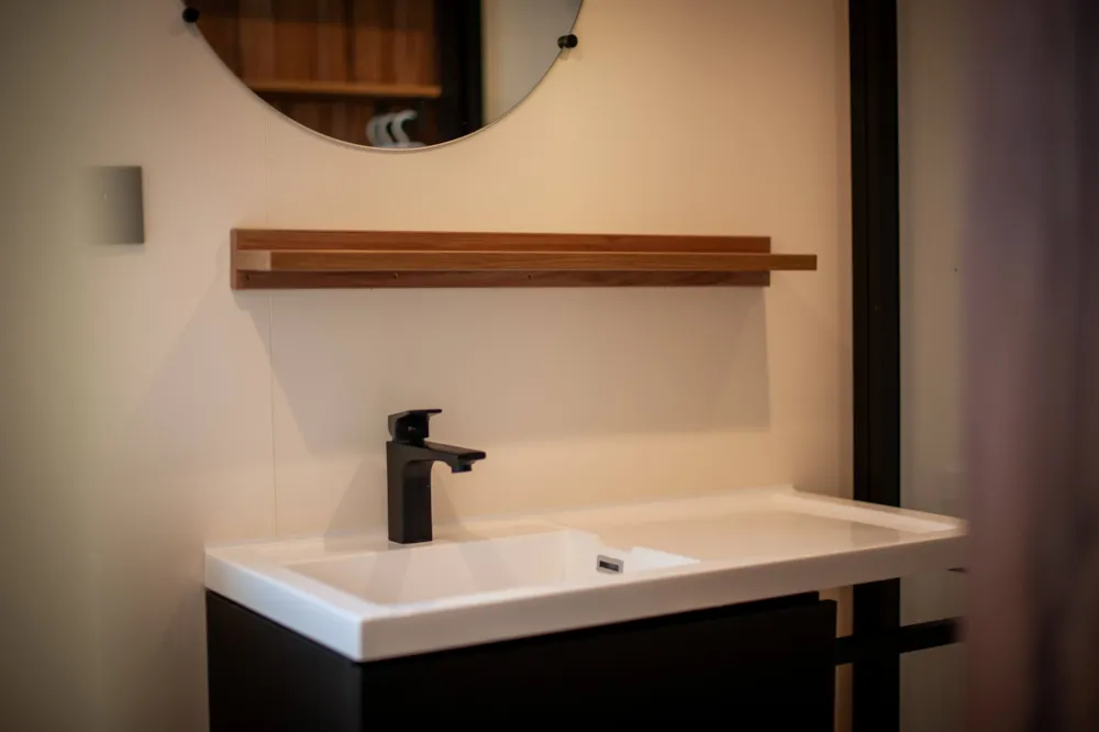 COCO DUO : Environ 25 m² : 1 chambre avec 1 grand lit (160 x 190) , placard de rangement intégré, Salle de bain attenante avec douche XL, Meuble vasque suspendu avec rangements, porte servicettes intégrés, WC suspendu.
