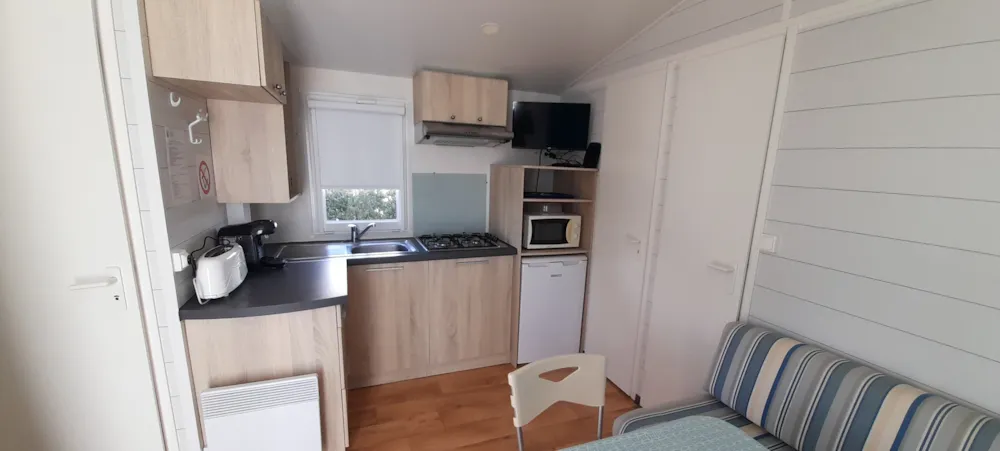 Cuisine équipée, micro-ondes, four à gaz, cafetière, vaisselle, ...