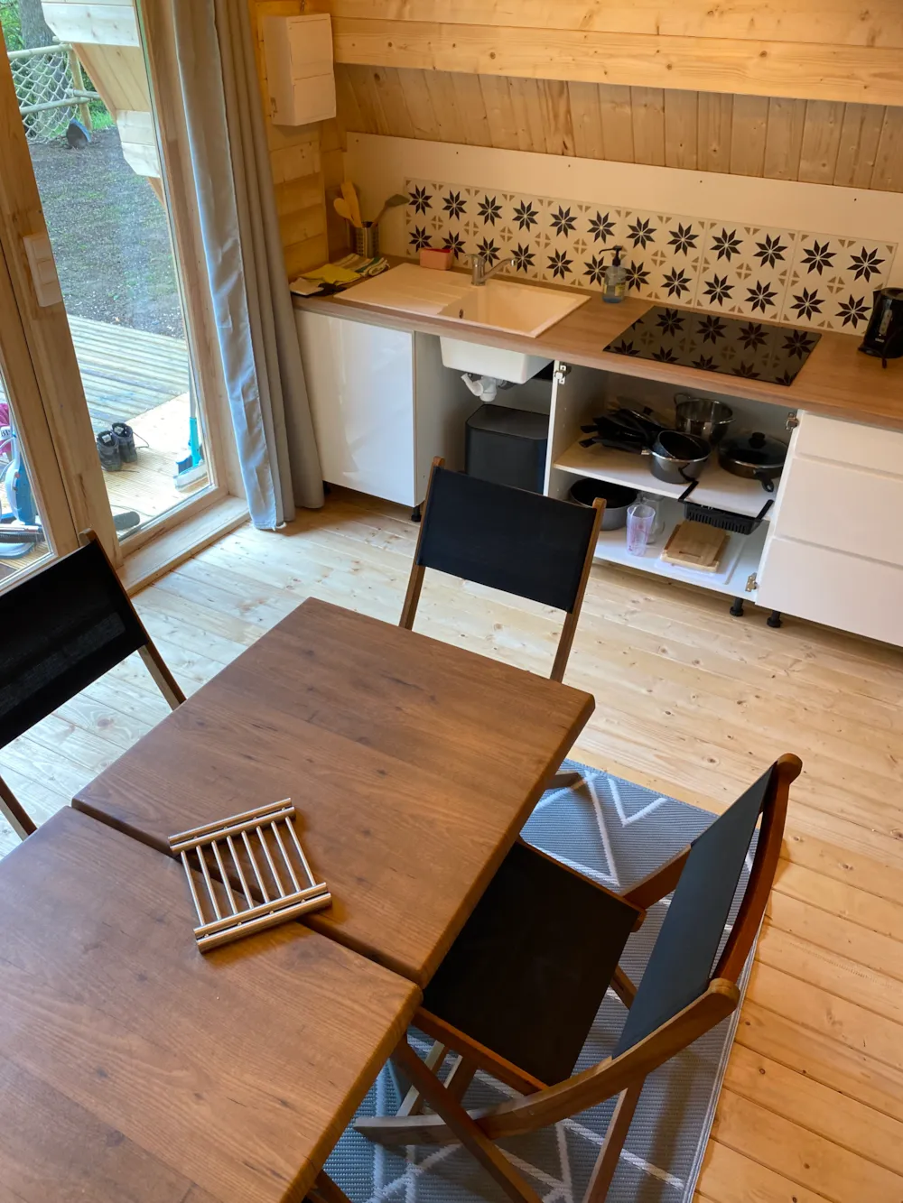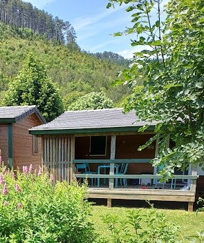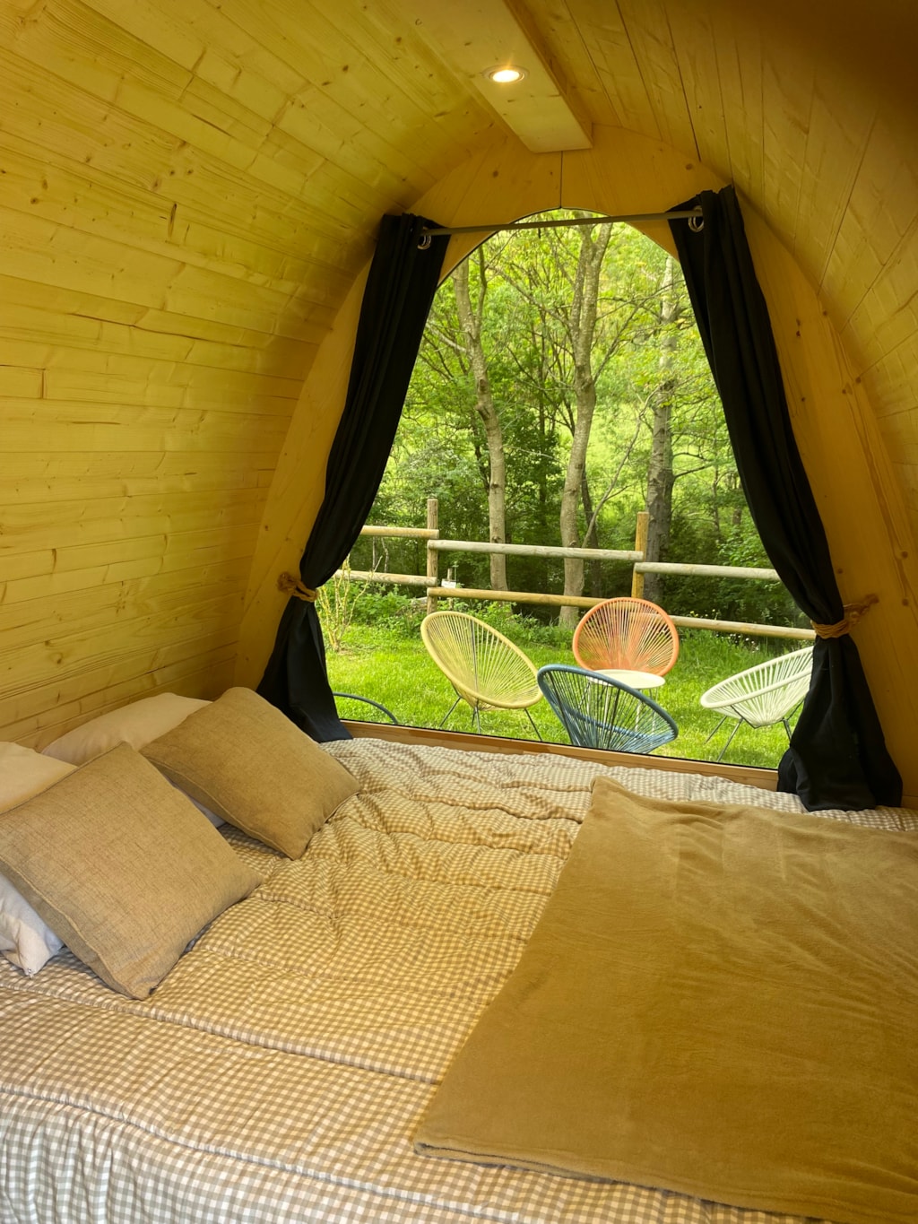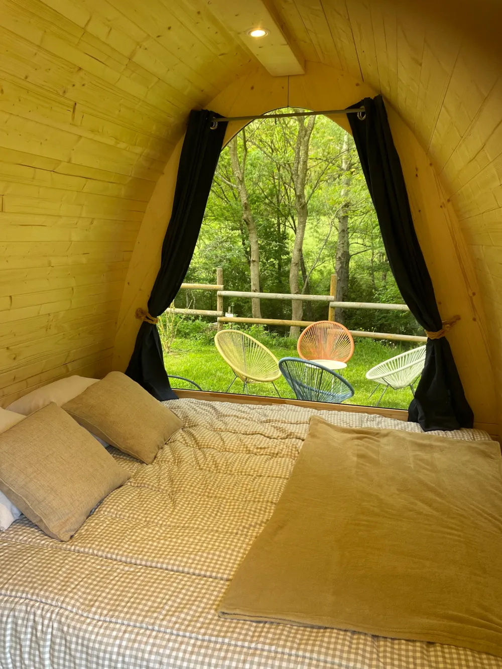 cabane POD tous en bois douillet et insolite avec une immence vitre panoramique sur la riviere et la montagne. Petite cuisine avec frigo et paque cuisson. Une grande terrasse bois avec salon de jardin.