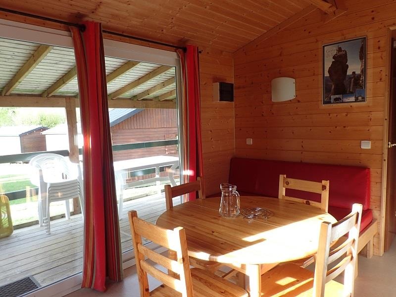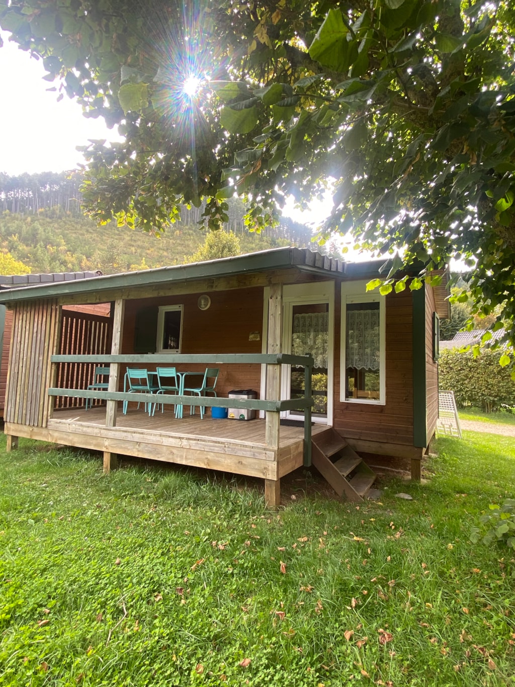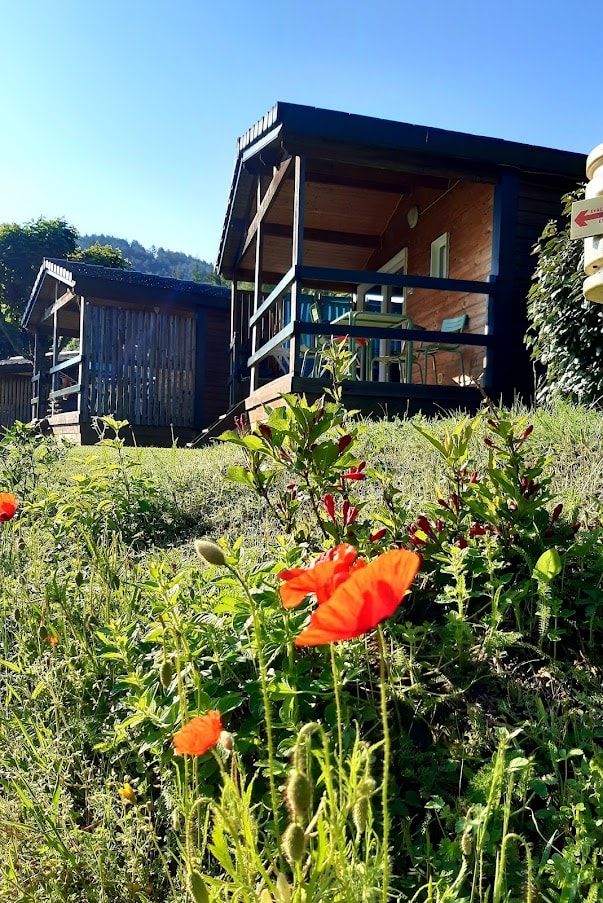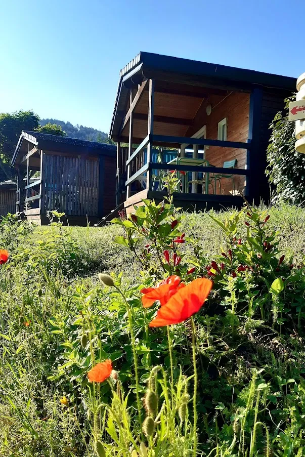 cabane POD tous en bois douillet et insolite avec une immence vitre panoramique sur la riviere et la montagne. Petite cuisine avec frigo et paque cuisson. Une grande terrasse bois avec salon de jardin.