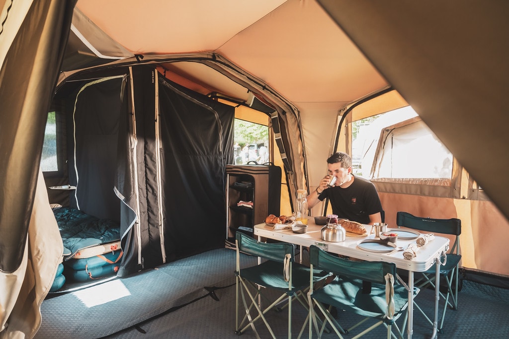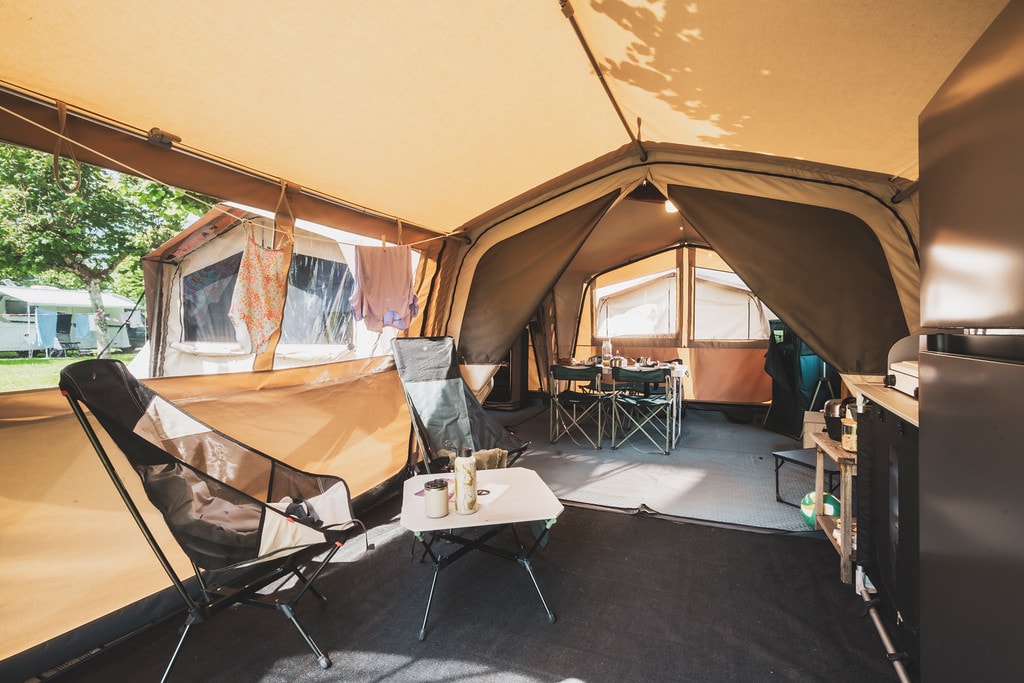 Fläche von mehr als 25m2. Zwei Schlafzimmer mit Doppelbett. Ausgestattete Küche. Perfekt für Glamping
