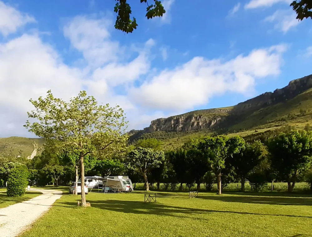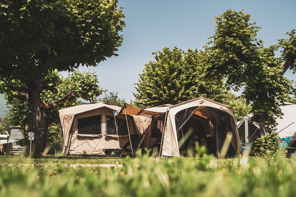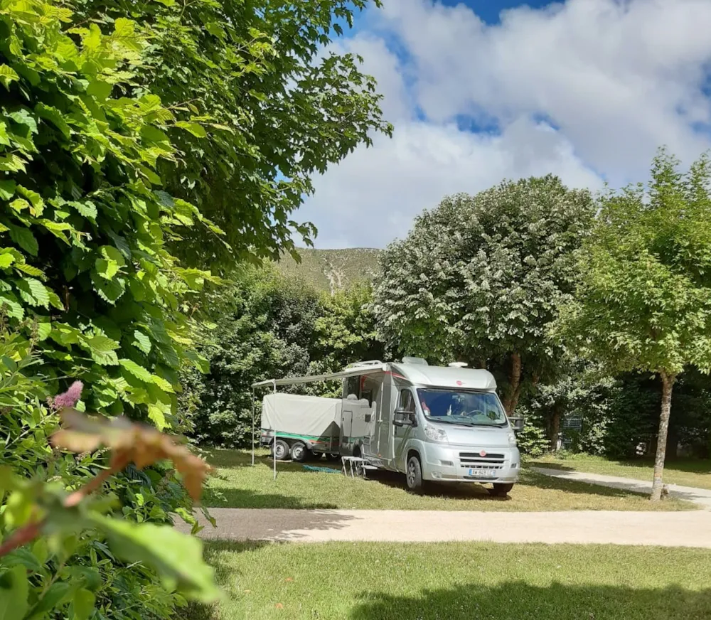 Stellplatz mit Bäumen wodurch man immer die Möglichkeit hat zwichen Sonne und Schatten zu wechseln.