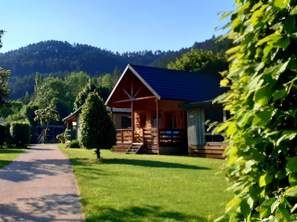 Chalet en bois avec une mezzanine a l étage , 3 lits dune personne.
