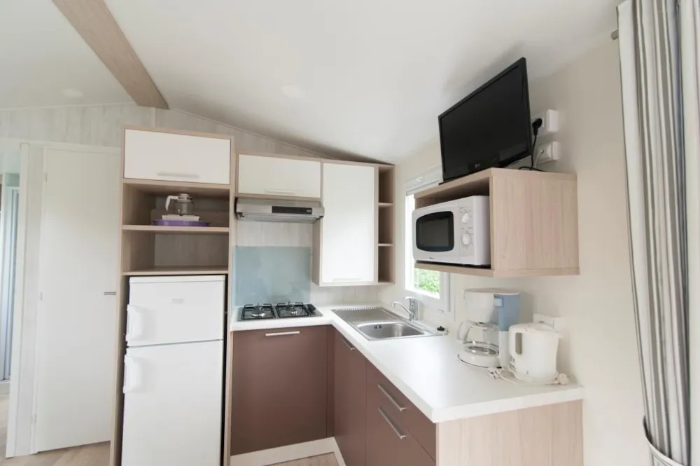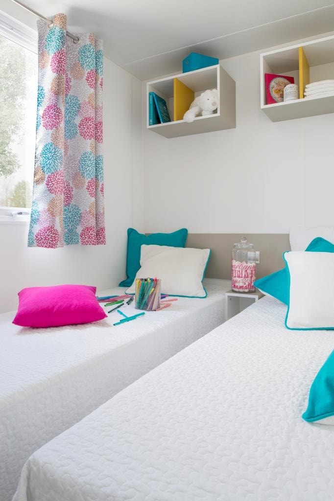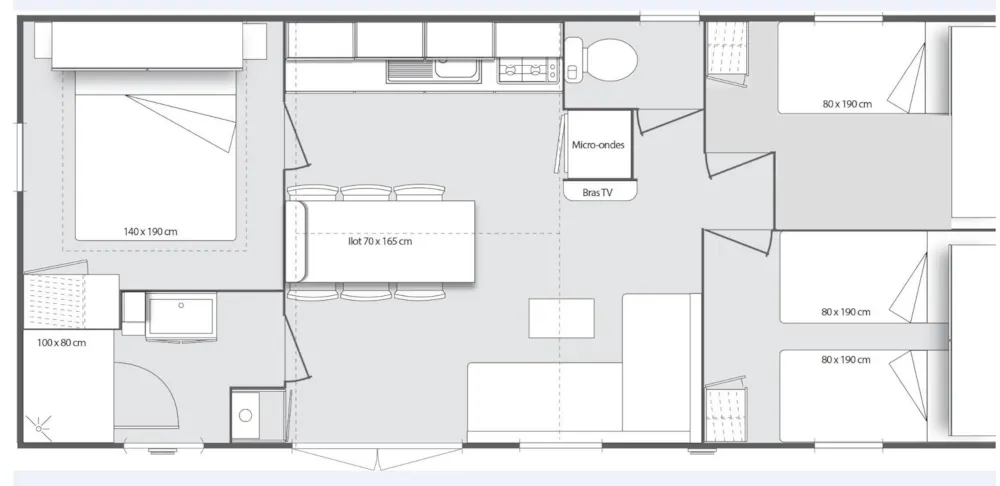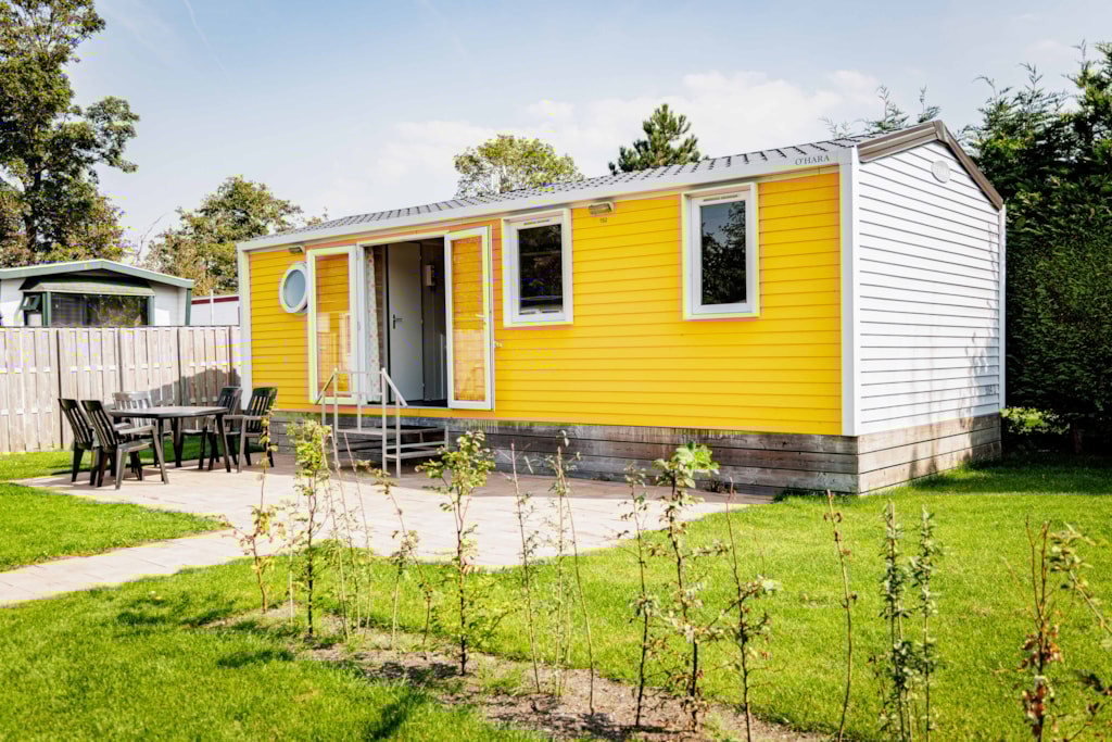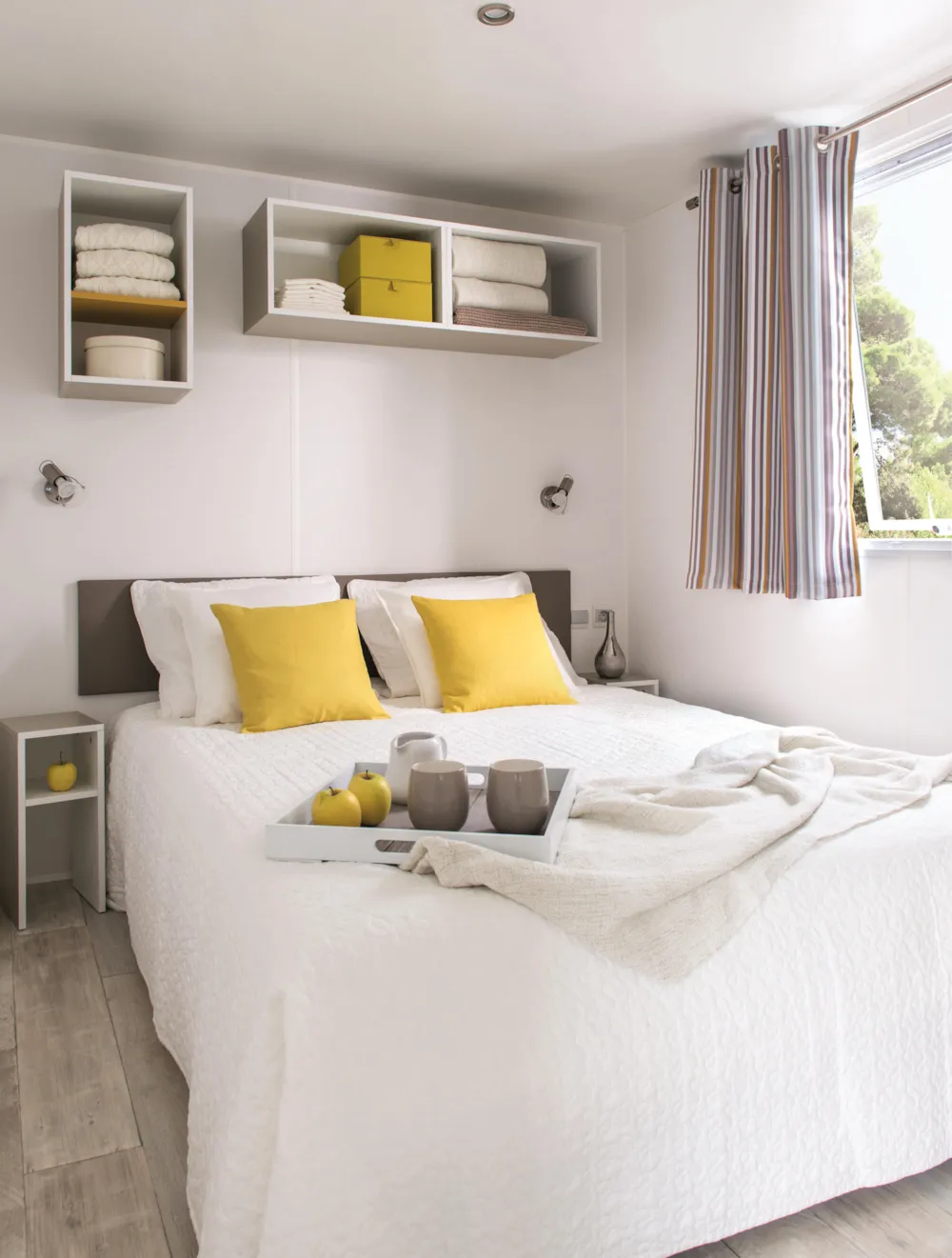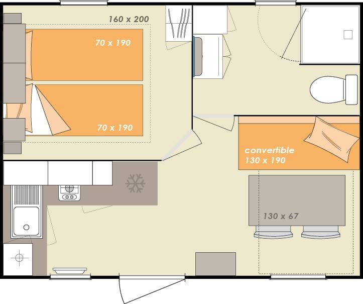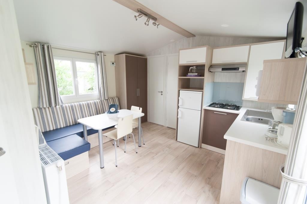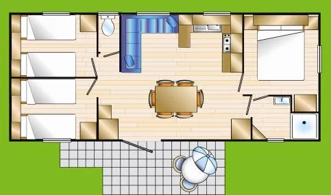 Dies ist ein größeres Mobile Home mit mehr luxus als der ‘standard’ Sunhome 6. Der Wohnzimmer hat eine Sitzecke mit Sofa und separater Essbereich. Die Küche ist völlig ausgestattet inklusiv Geschirrspüler. Für mehr Komfort gibt es ein Badezimmer mit Dusche und Toilette und zusätzlich eine extra Dusche und zweite Toilette. Der Sunhome 6L hat drei Schlafzimmer. Zwei Schlafzimmer haben jeder zwei Einzelbetten und eine Schlafzimmer hat eine Doppelbett von 160x200cm. Bettdecken und Kopfkissen sind vorhanden. Mindestalter für die Buchung: 25 Jahre.
