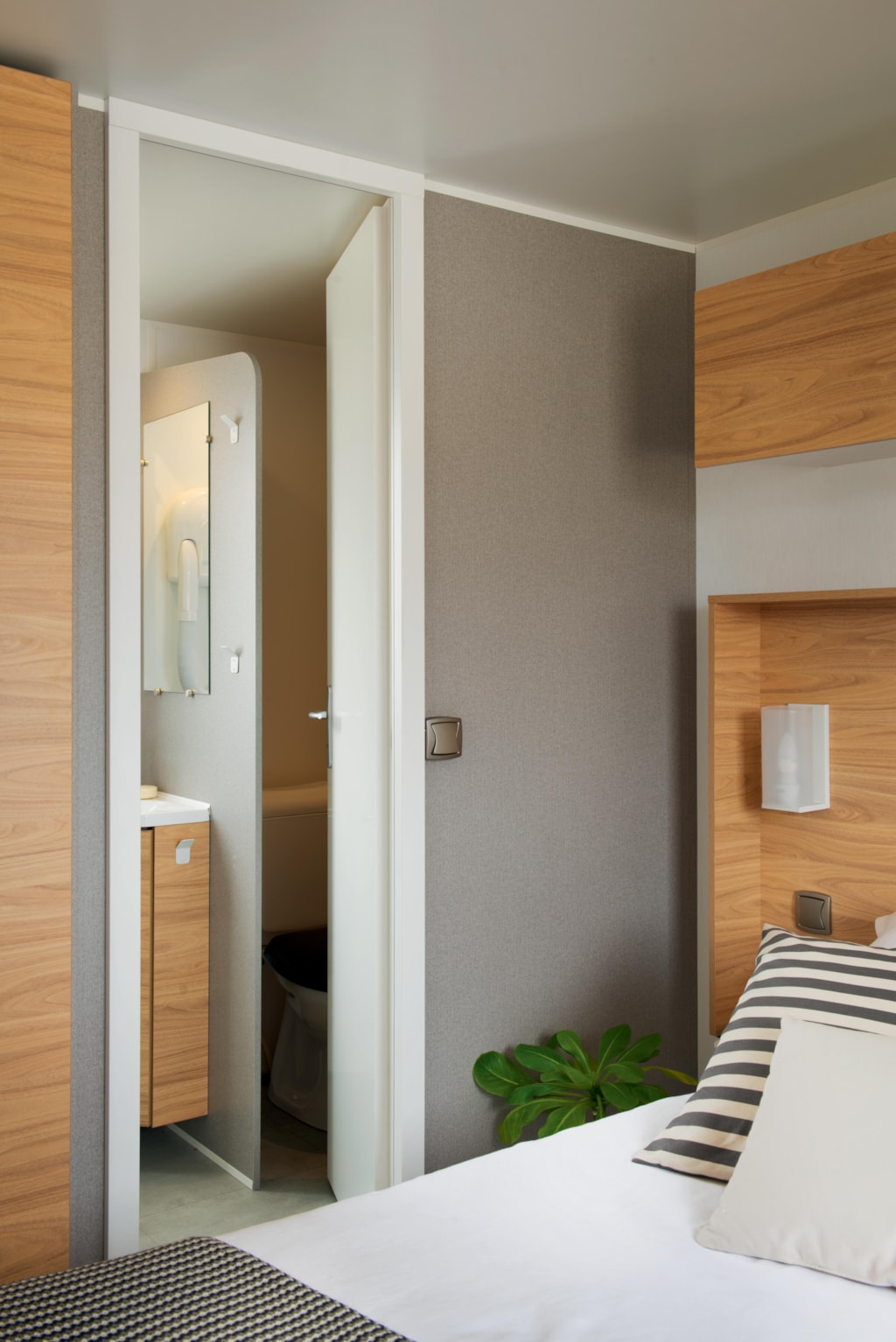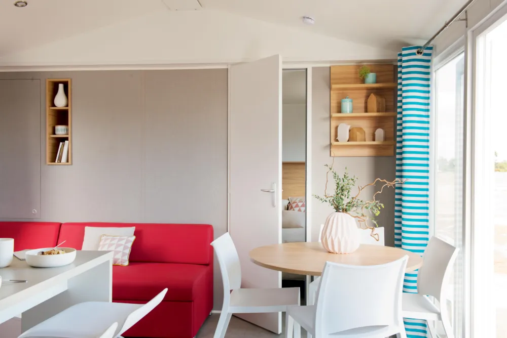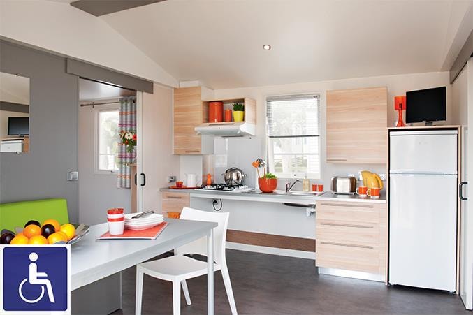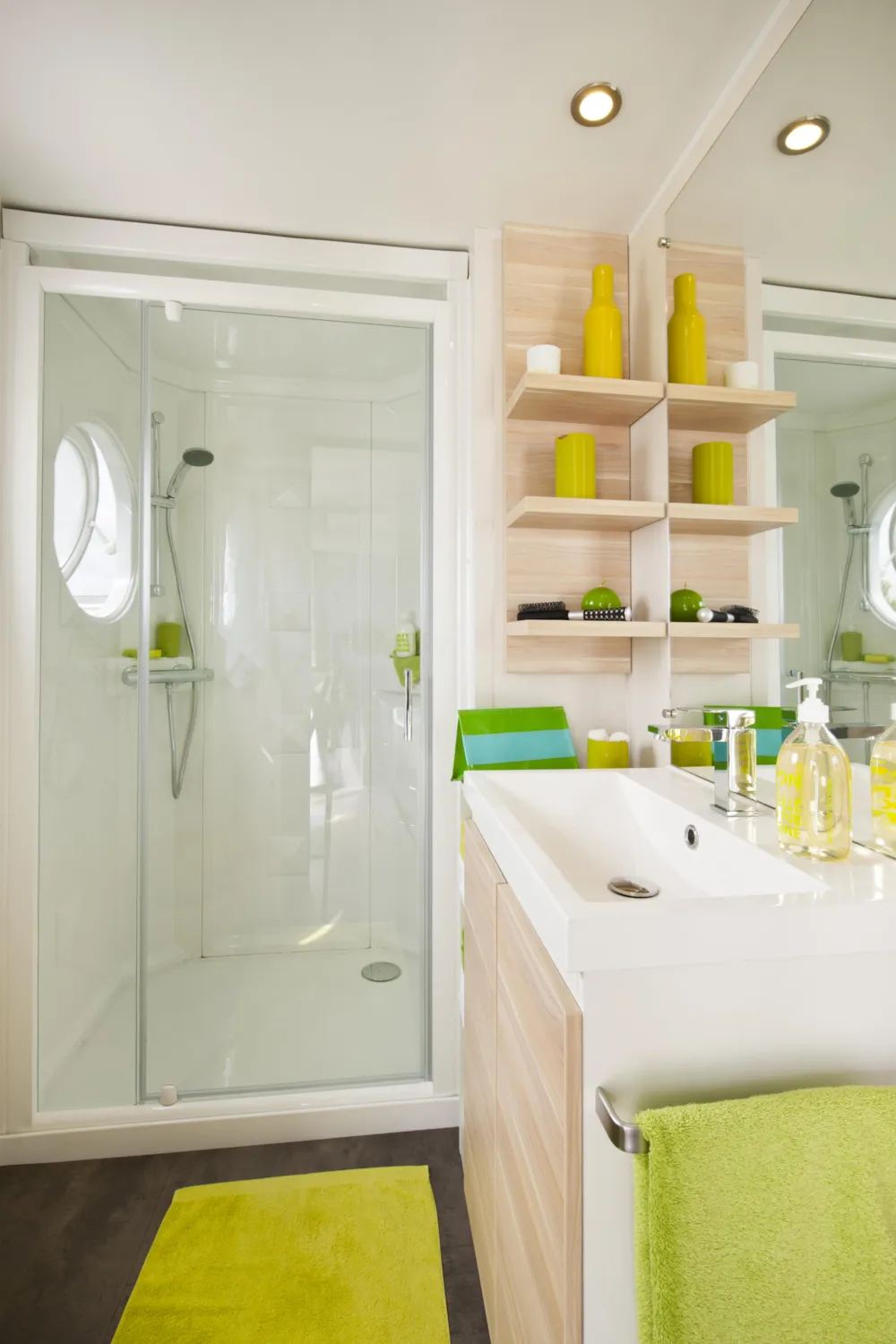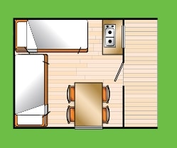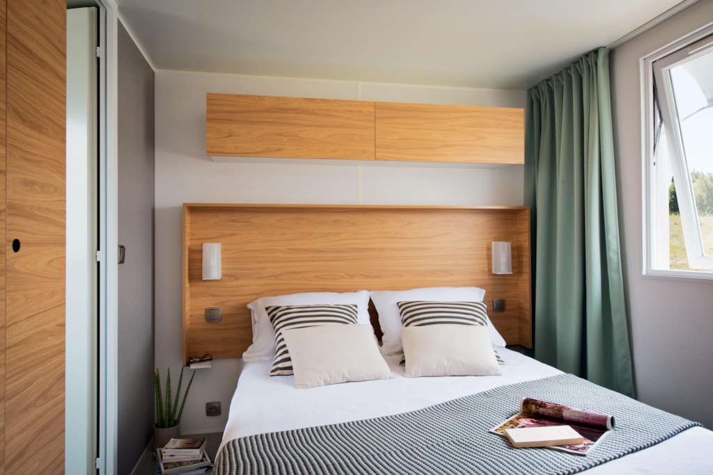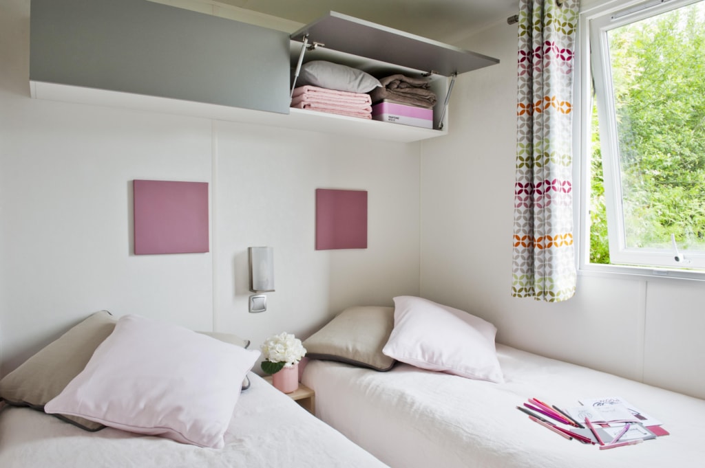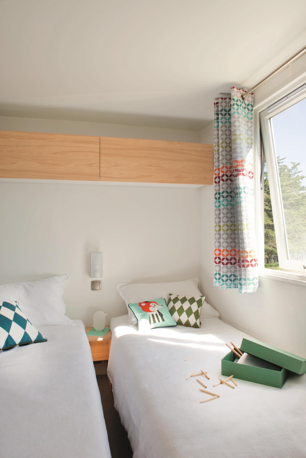 Dies ist ein größeres Mobile Home mit mehr luxus als der ‘standard’ Sunhome 6. Der Wohnzimmer hat eine Sitzecke mit Sofa und separater Essbereich. Die Küche ist völlig ausgestattet inklusiv Geschirrspüler. Für mehr Komfort gibt es ein Badezimmer mit Dusche und Toilette und zusätzlich eine extra Dusche und zweite Toilette. Der Sunhome 6L hat drei Schlafzimmer. Zwei Schlafzimmer haben jeder zwei Einzelbetten und eine Schlafzimmer hat eine Doppelbett von 160x200cm. Bettdecken und Kopfkissen sind vorhanden. Mindestalter für die Buchung: 25 Jahre.
