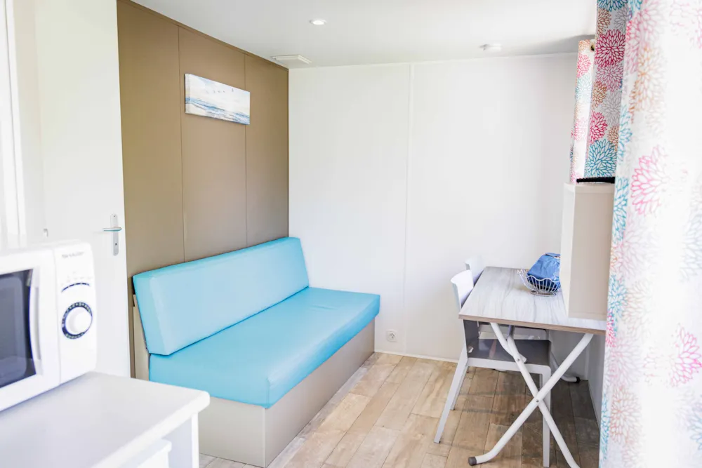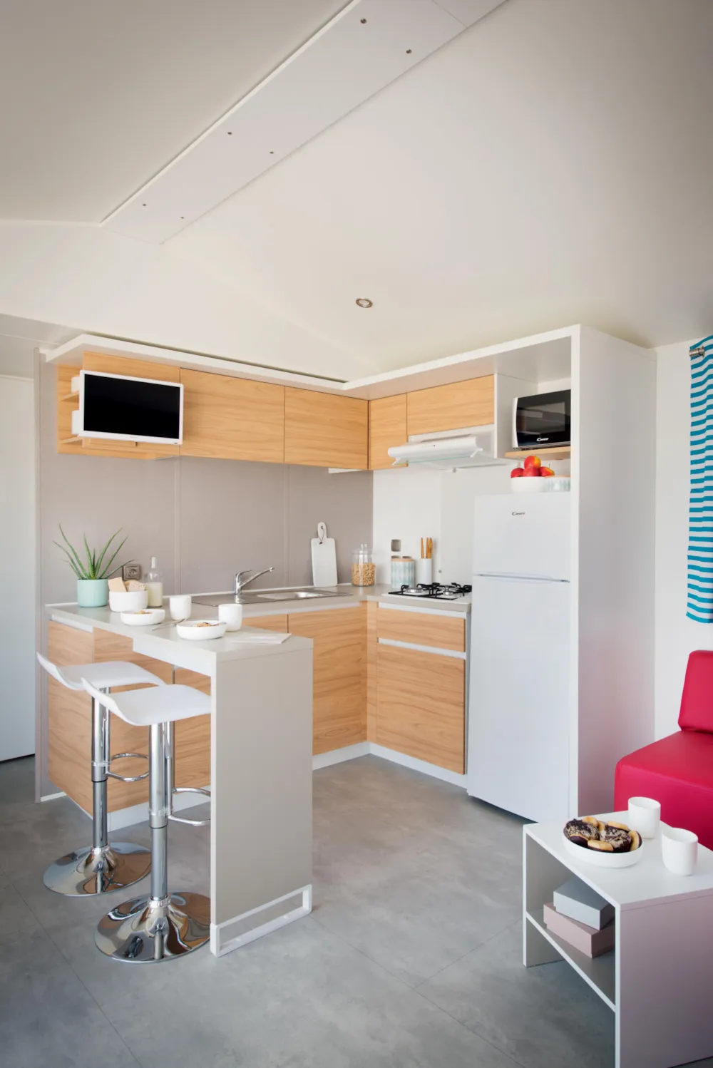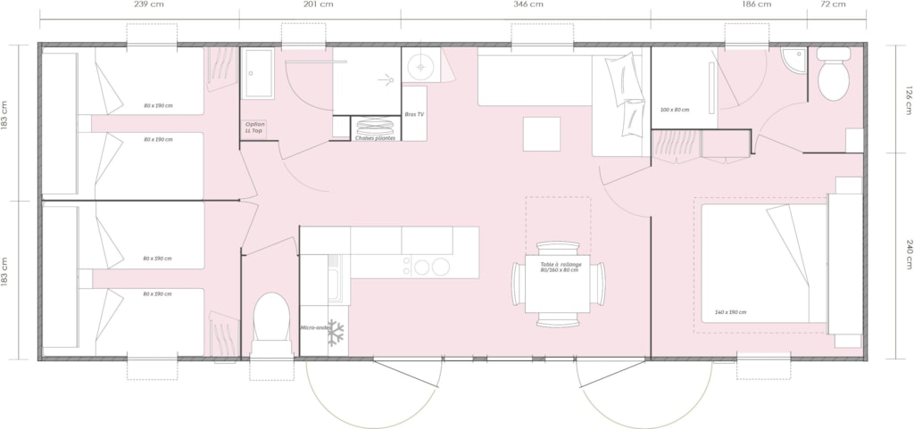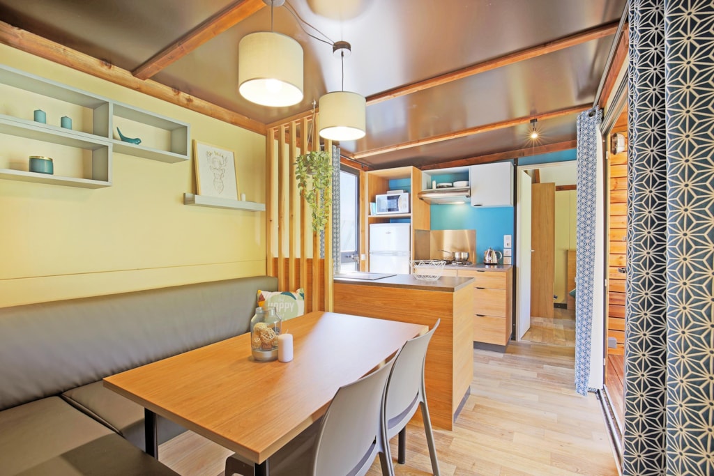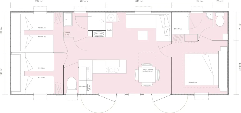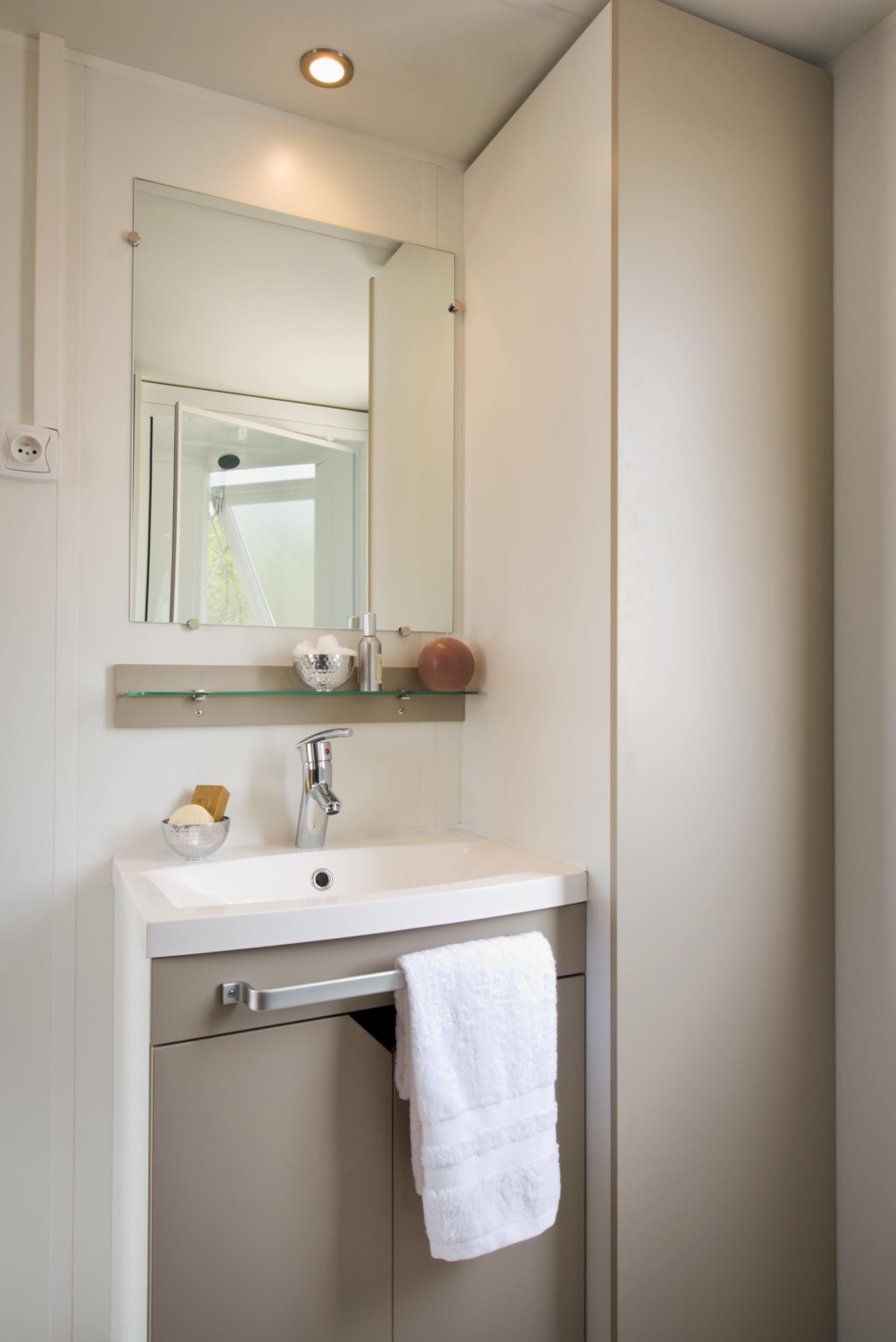 Dies ist ein größeres Mobile Home mit mehr luxus als der ‘standard’ Sunhome 6. Der Wohnzimmer hat eine Sitzecke mit Sofa und separater Essbereich. Die Küche ist völlig ausgestattet inklusiv Geschirrspüler. Für mehr Komfort gibt es ein Badezimmer mit Dusche und Toilette und zusätzlich eine extra Dusche und zweite Toilette. Der Sunhome 6L hat drei Schlafzimmer. Zwei Schlafzimmer haben jeder zwei Einzelbetten und eine Schlafzimmer hat eine Doppelbett von 160x200cm. Bettdecken und Kopfkissen sind vorhanden. Mindestalter für die Buchung: 25 Jahre.