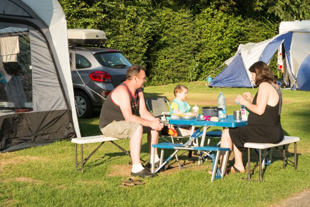Fester Stellplatz mit Wiese für Tisch und Stühle, sehr ordentlich und gepflegt