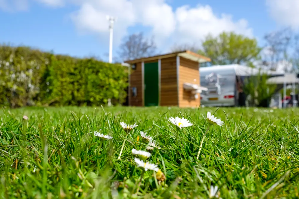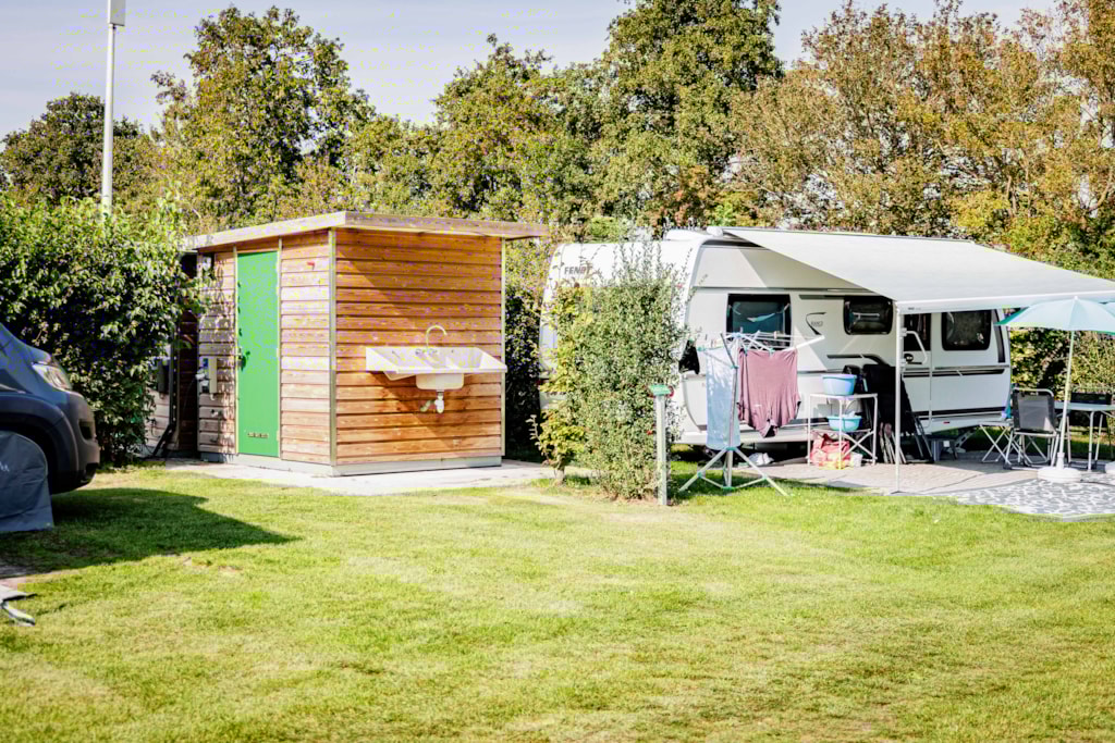 Unsere Komfortplätze deluxe sind geräumige Stellplätze von 100 m2 mit privaten sanitären Einrichtungen und von viel Grün umgeben. Die Verwendung von Wasser (eigener Wasseranschluß), Kanalisationsanschluss vor Ort, 10 Ampere Strom, digitaler Kabelfernsehenanschluß und WLAN (2 GB pro Nacht) sind im Preis enthalten. Fernseher muß über einen DVB-C-Tuner verfügen um Kanäle empfangen zu können. Die privaten sanitären Einrichtungen sind ein isoliertes Badehäuschen – Doppelhaushälfte – kompakt ausgestattet mit Dusche, Toilette, Waschbecken und Haartrockner. Die Duschkabine ist mit Duschstange ausgestattet. Es gibt auch eine Rasiersteckdose und praktische Haken zum Aufhängen von Handtüchern. Auf der Außenseite befindet sich ein Waschbereich, der mit Ihren Nachbarn geteilt wird. Neben dem Stromanschluss für Ihre Wohnwagen oder Wohnmobil gibt es auch eine Außensteckdose zum Aufladen des Elektrofahrrads. Die privaten Sanitäranlagen werden von einem Lüfterheitzung erhitzt. Ideal für die kalten Abende im Frühling oder Herbst. Der Mindestaufenthalt für einen Komfortplatz deluxe mit privaten sanitären Einrichtungen beträgt drei Nächte. Haustiere sind leider bei den Stellplätzen mit privaten sanitären Einrichtungen nicht erlaubt. Für die privaten Sanitäranlagen wird eine Kaution von 25 € erhoben (nicht inklusive die Totalpreis). Als Gast zahlen Sie für den Strom, den Sie während Ihres Aufenthalts auf Ihrem Stellplatz verbrauchen. Sie zahlen eine Vorauszahlung für den Strom.