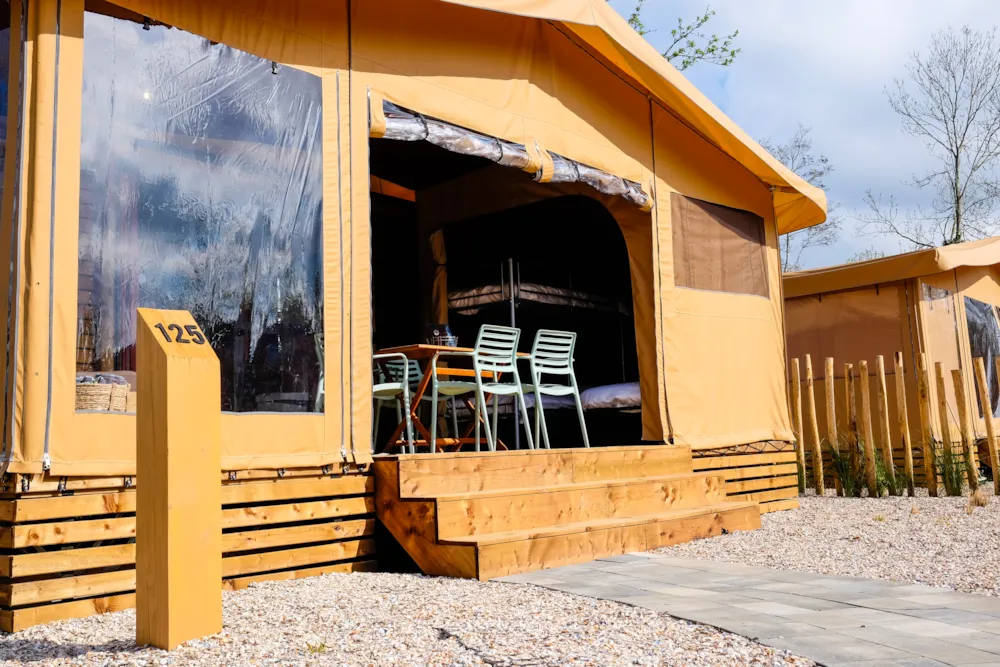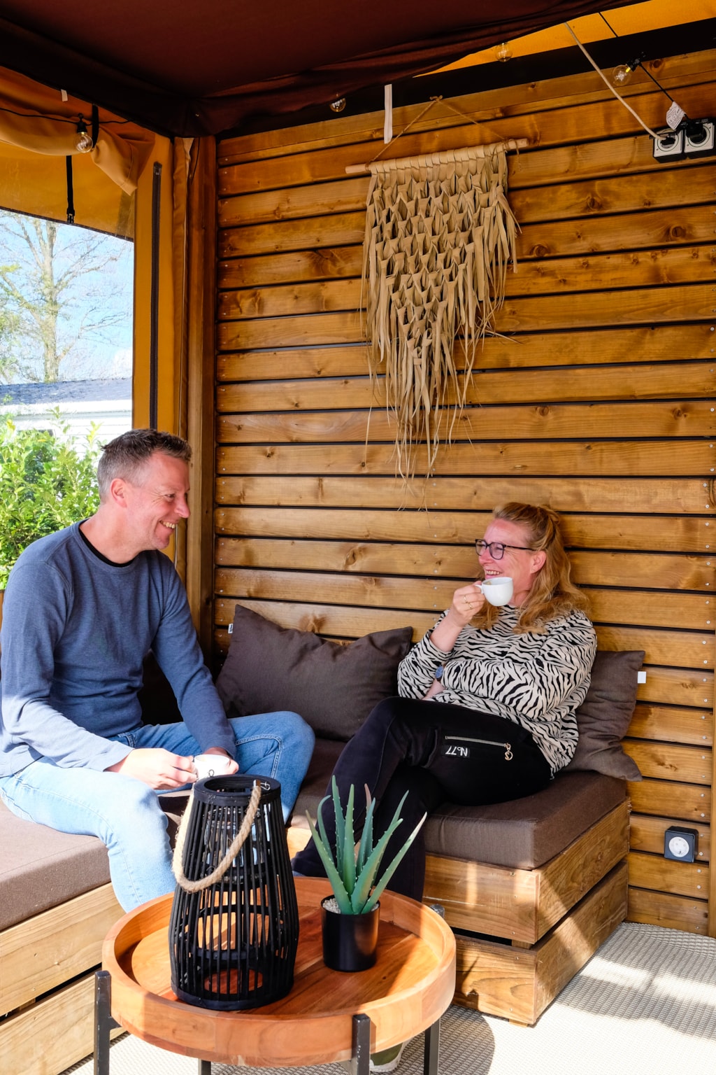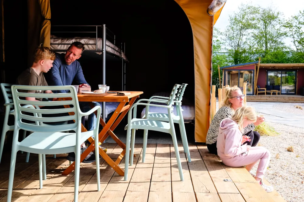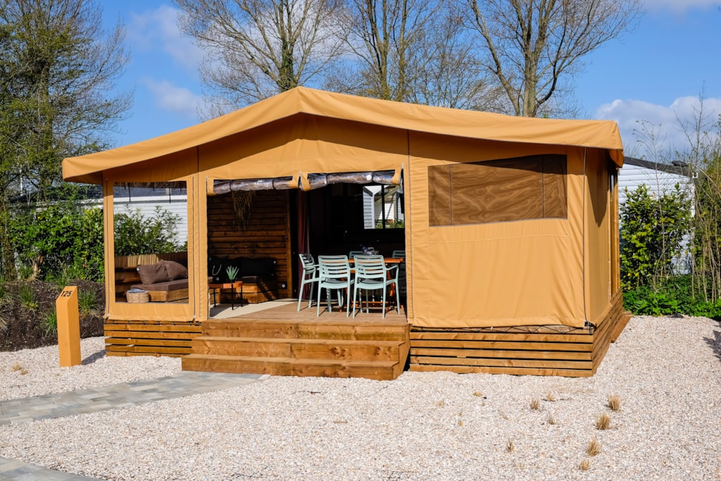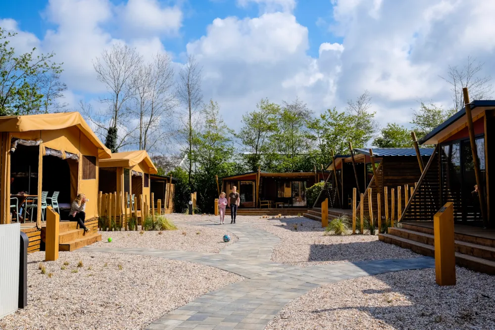 Diese coole Safari Lodge für fünf Personen besteht aus einem isolierten Innenraum und einer schönen Veranda, die mit Segeltuch verschlossen ist. Der Innenraum verfügt über eine voll ausgestattete Küche mit Nespresso-Kaffeemaschine (Cups), ein Badezimmer mit Dusche und Toilette sowie ein Schlafzimmer mit zwei Einzelbetten. Die offene Küche hat einen Esstisch mit Stühlen. Die überdachte Veranda verfügt über eine gemütliche Sitzecke mit Loungesofa. Entspannen Sie nach einem tollen Urlaubstag auf dieser schönen Veranda! Hier befindet sich auch der Schlafbereich mit einem Etagenbett und Enkelbett für die 3 anderen Personen. Erleben Sie das ultimative Campinggefühl, wenn Sie unter Segeltuch schlafen, genau wie in einem Wohnwagenzelt. Bettdecken und Kissen sind in den Schlafzimmern bereit. Bitte beachten Sie, daß alle Unterkünfte rauchfrei sind und Haustiere nicht erlaubt sind.