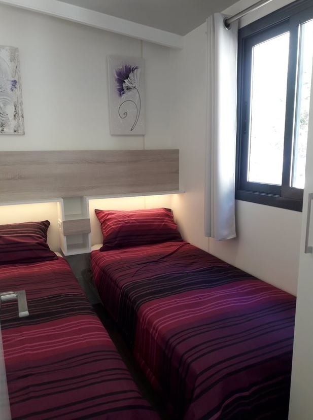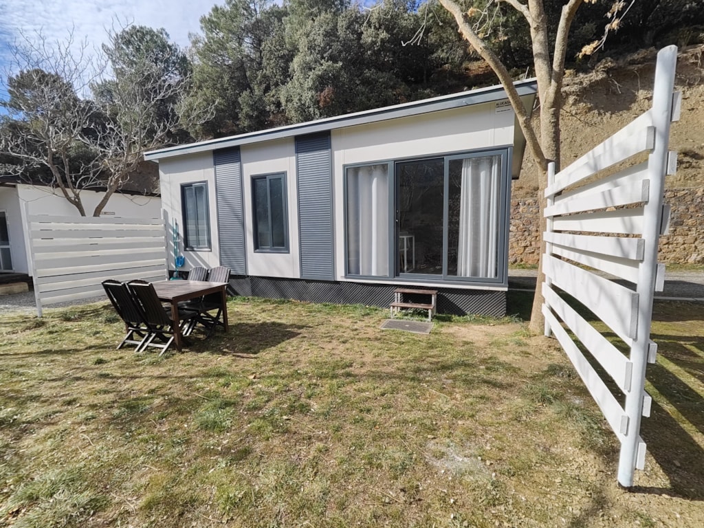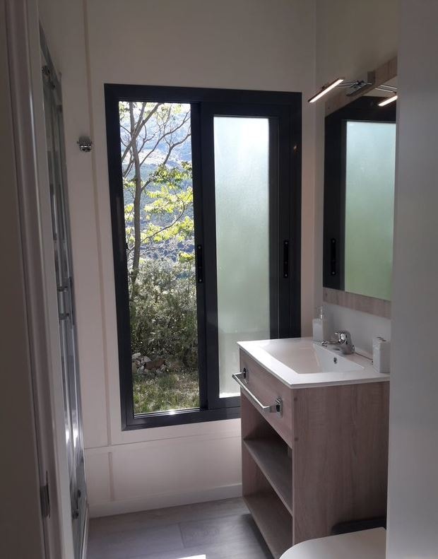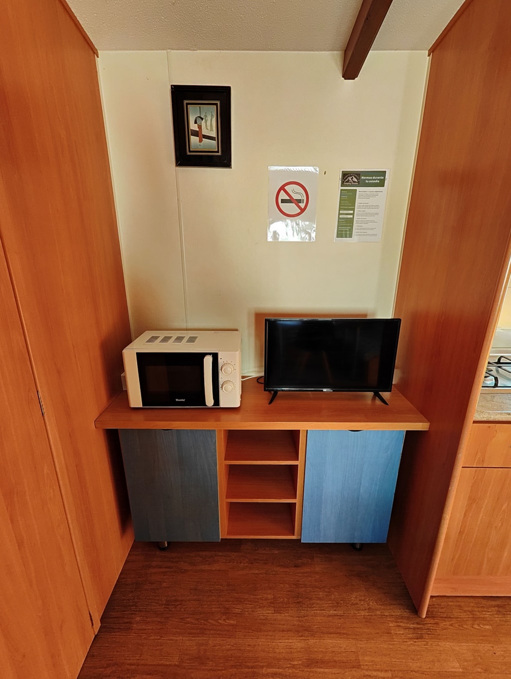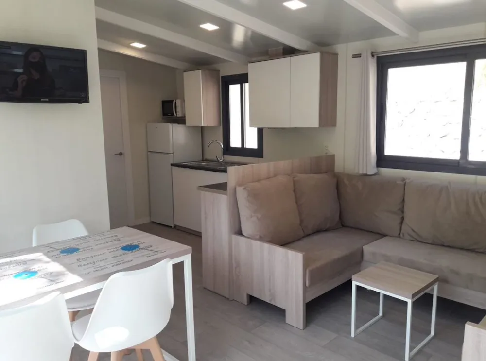 Dieses unglaubliche Modell im modernen Stil hat einen grandiosen Eingang, der aus sehr hohen Fenstern besteht, die in derselben Umgebung das Innere des Mobilheims mit dem Äußeren und dem spektakulären Blick auf die Berge auf 2500 Metern Höhe verbinden. Es zeichnet sich durch eine große Küche, ein bequemes U-förmiges Sofa, ein geräumiges Badezimmer und zwei Schlafzimmer aus.