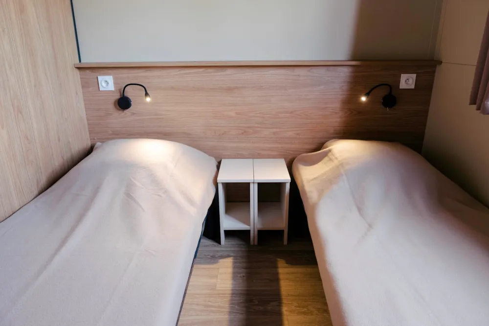 Zwei durch einen Flur getrennte Schlafzimmer: Eines direkt neben dem Wohnzimmer mit Doppelbett (140 × 200), eines im Flur des Wohnzimmers, getrennt durch eine Holzwand und mit drei Einzelbetten (80 × 190 cm), davon ein Etagenbett.