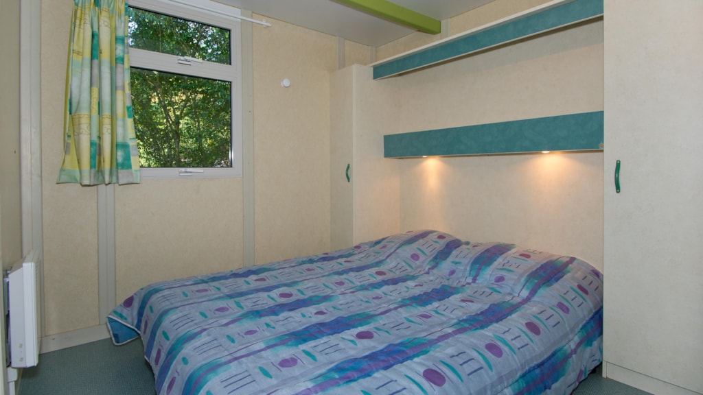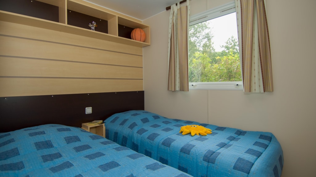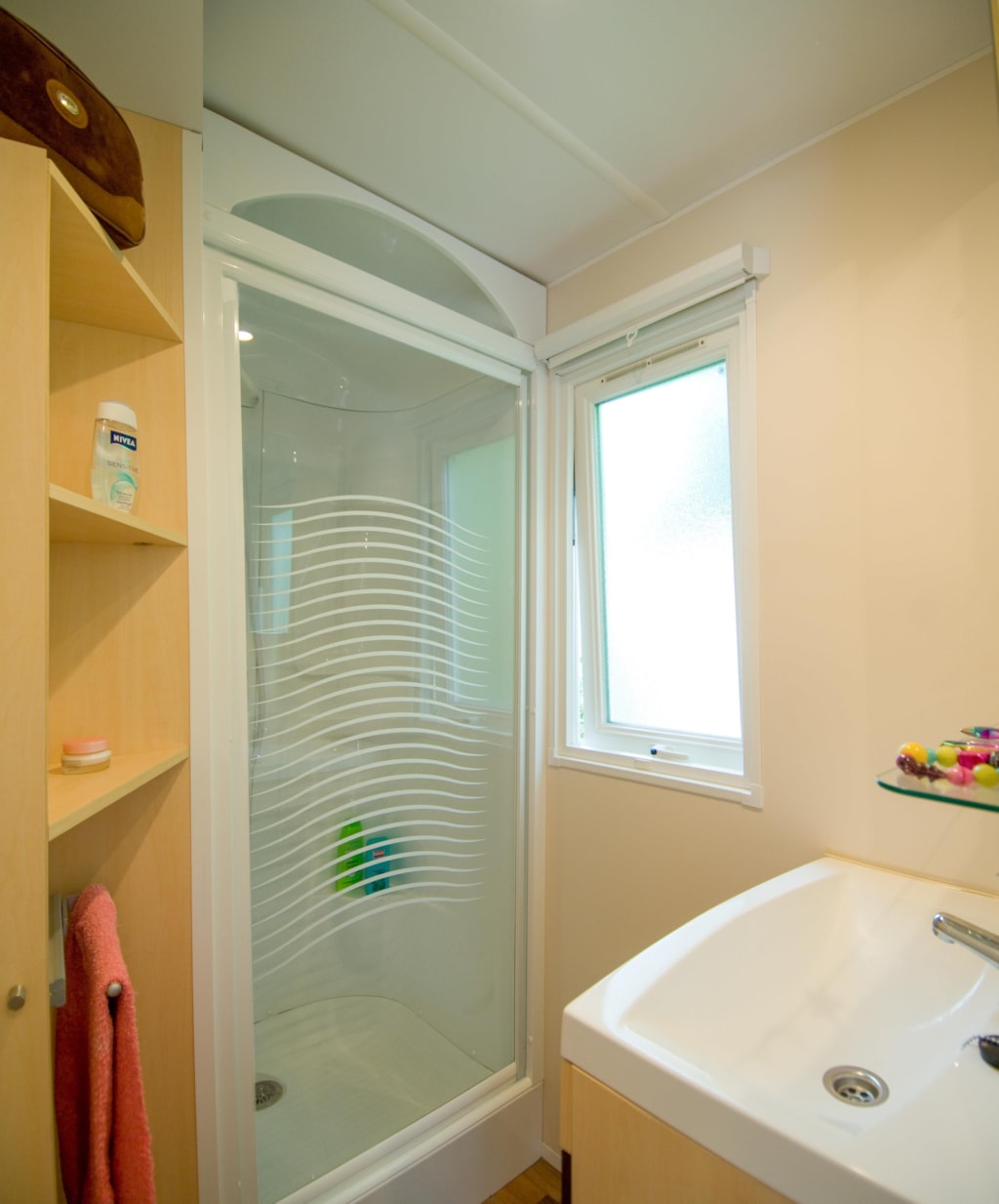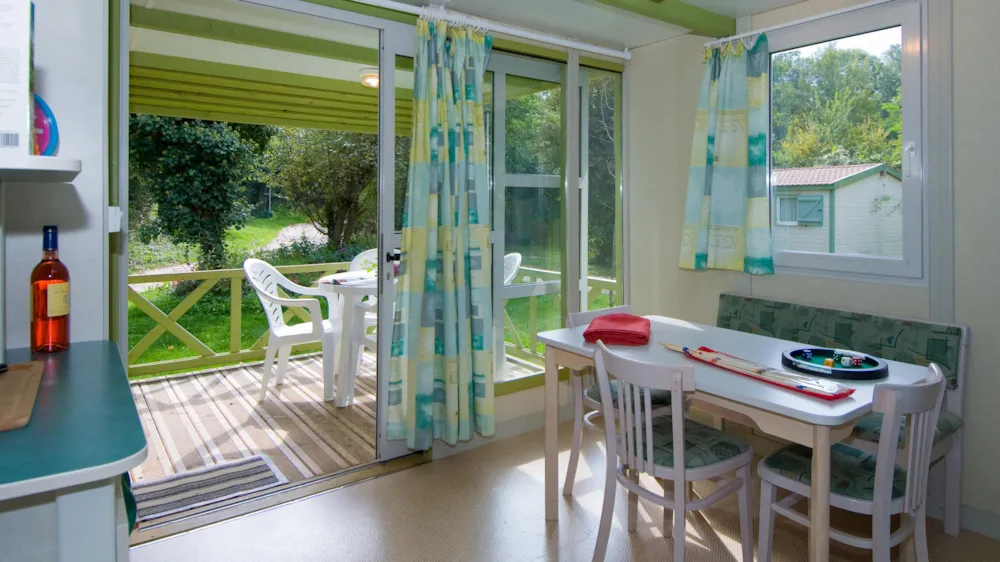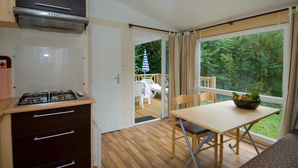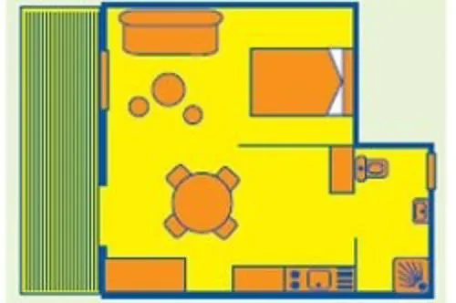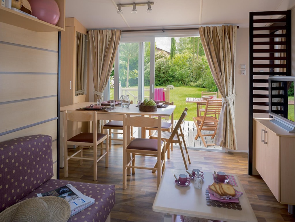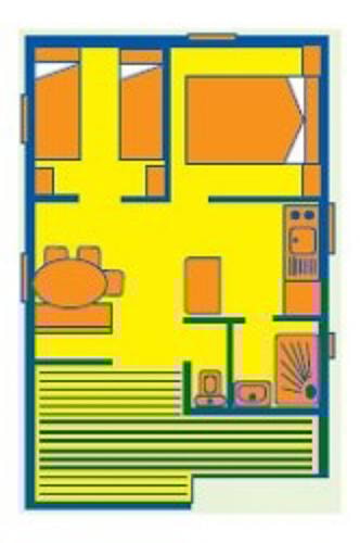 +/- 34 m² + überdachte Terrasse de 15 m² - 6/8 Pers. Ideal gelegen, mit Blickauf den Fluss. Küche und Wohnzimmer haben grosse Fensterfronten, die auf die Terrasse gehen. So können Sie die Sonne 100% geniessen. 1 Zimmer mit einem Doppelbett (160 x 200) mit Vollkomfortmatratze, 1 Zimmer mit 2 nebeneinander stehenden Betten (80 x 200), 1 Zimmer mit Etagenbett (2 Bette 70x200), 1 Essecke, Wohnzimmer mit Schlafcouch (130 x 210), Bad (mit Dusche, Waschbecken, Spiegel), getrenntes WC, 1 Kochecke (Spüle, Kühlschrank, Mikrowelle, Kaffeemaschine, Geschirr), Warmwasser, Gartenmöbel, Sonnenliege und Sonnenschirm. Baujahr : 2009 - 2010