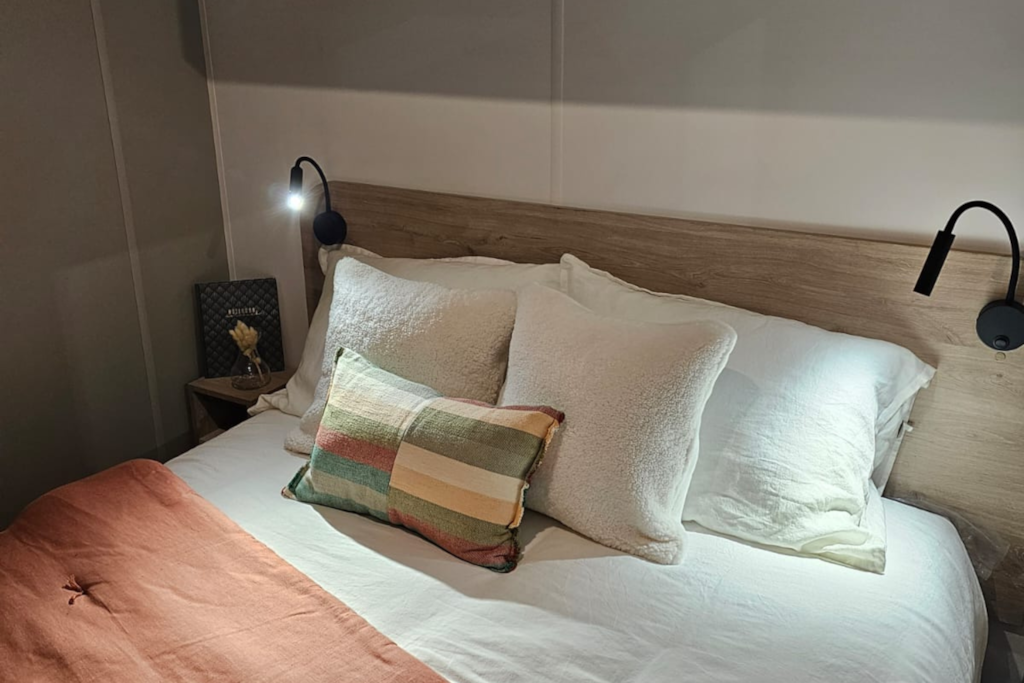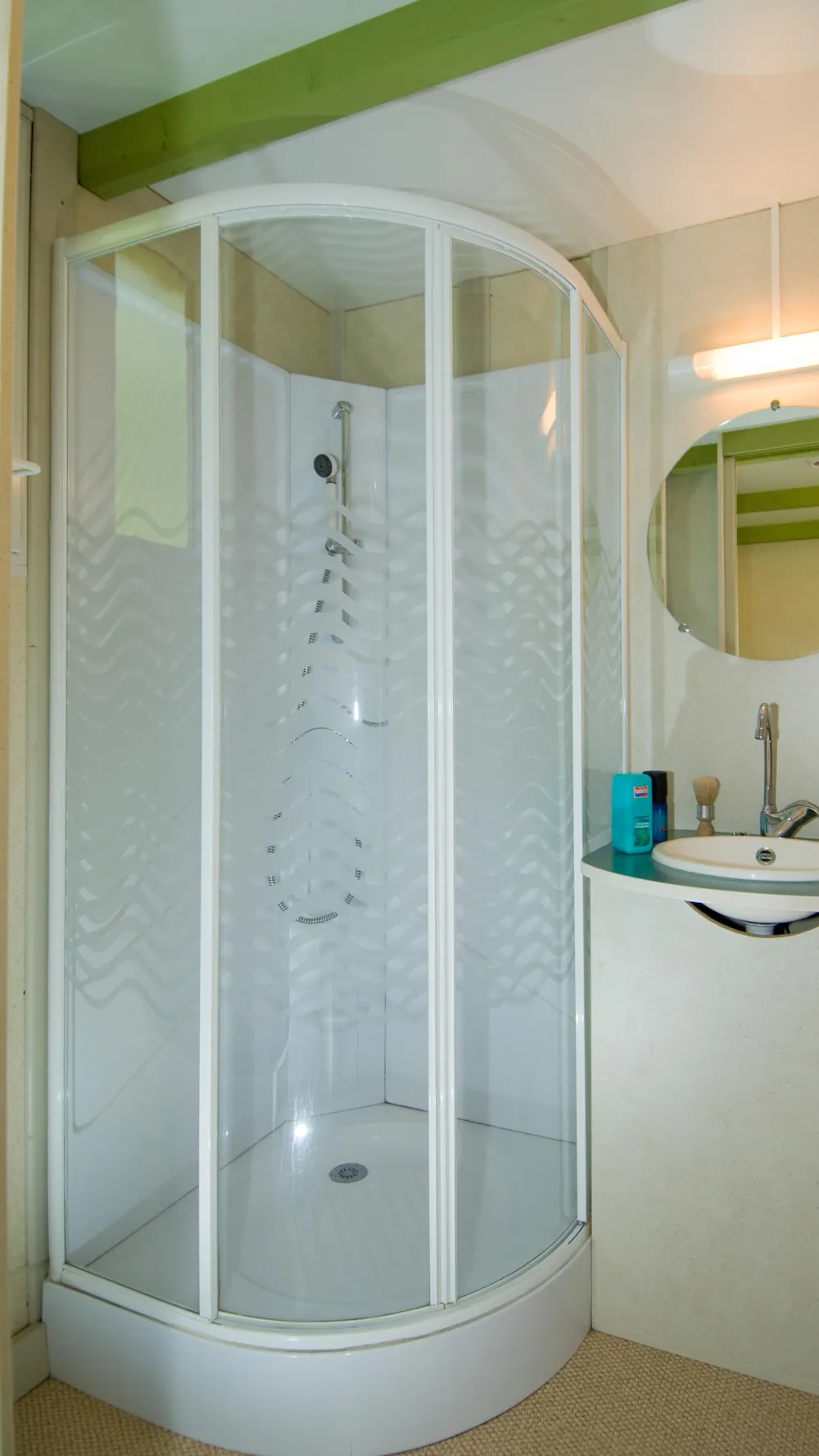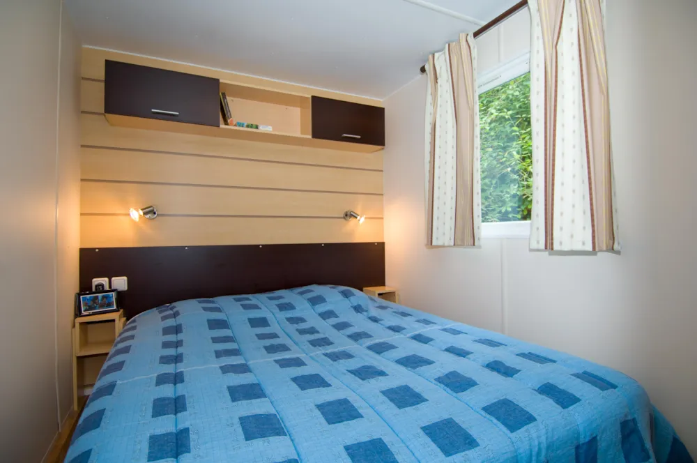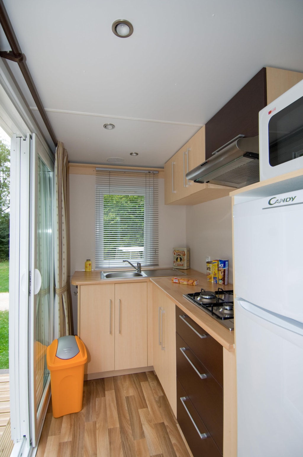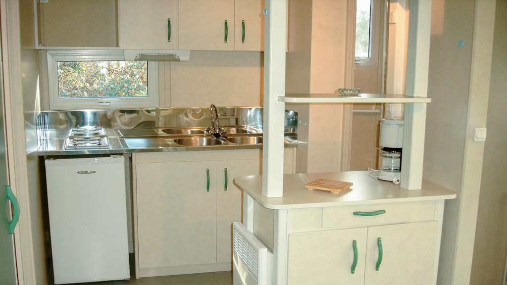 +/- 34 m² + überdachte Terrasse de 15 m² - 6/8 Pers. Ideal gelegen, mit Blickauf den Fluss. Küche und Wohnzimmer haben grosse Fensterfronten, die auf die Terrasse gehen. So können Sie die Sonne 100% geniessen. 1 Zimmer mit einem Doppelbett (160 x 200) mit Vollkomfortmatratze, 1 Zimmer mit 2 nebeneinander stehenden Betten (80 x 200), 1 Zimmer mit Etagenbett (2 Bette 70x200), 1 Essecke, Wohnzimmer mit Schlafcouch (130 x 210), Bad (mit Dusche, Waschbecken, Spiegel), getrenntes WC, 1 Kochecke (Spüle, Kühlschrank, Mikrowelle, Kaffeemaschine, Geschirr), Warmwasser, Gartenmöbel, Sonnenliege und Sonnenschirm. Baujahr : 2009 - 2010