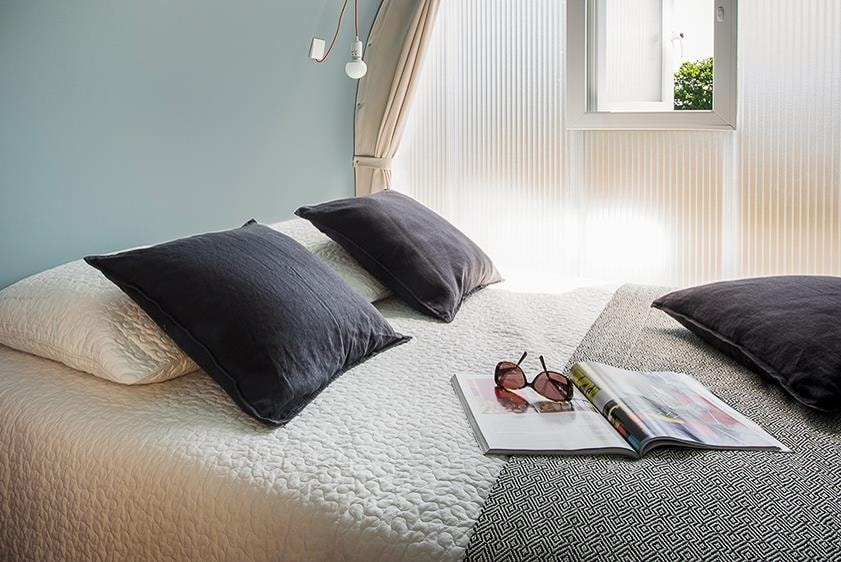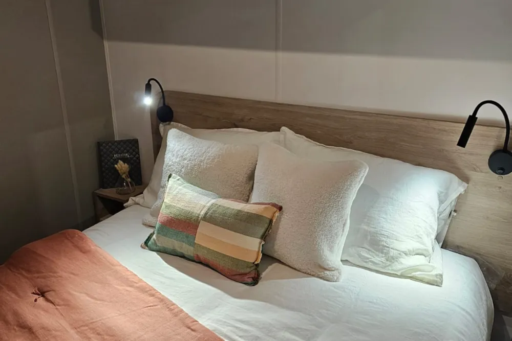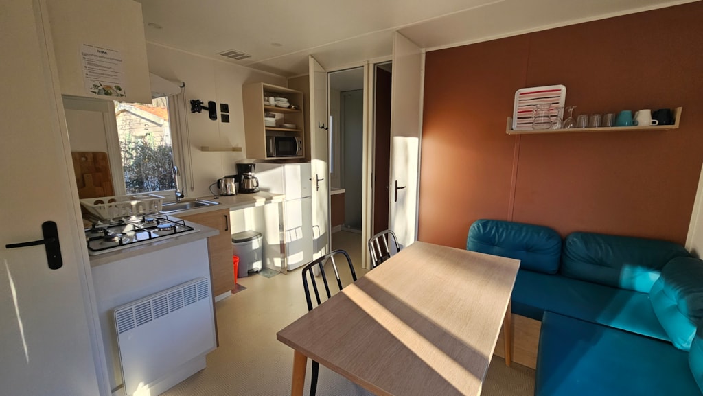 2/3 Menschen. Die Glastüren des Wohnzimmers und der Küche öffnen sich direkt auf die eingebaute Terrasse und blicken auf einen wunderschönen privaten Raum. 1 Schlafzimmer mit 1 Bett 160x200, sehr bequeme Matratze, 1 Schlafzimmer mit 2 Betten 80x200, 1 Essbereich mit Ausziehbett 130x190, 1 Badezimmer (Dusche, Waschbecken, Spiegel), separates WC, 1 Küchenzeile (Spüle, Kühlschrank, Mikrowelle, Kaffeemaschine, Pfannen, Geschirr), Warmwasser, Gartenmöbel, Liegestühle und Sonnenschirm.