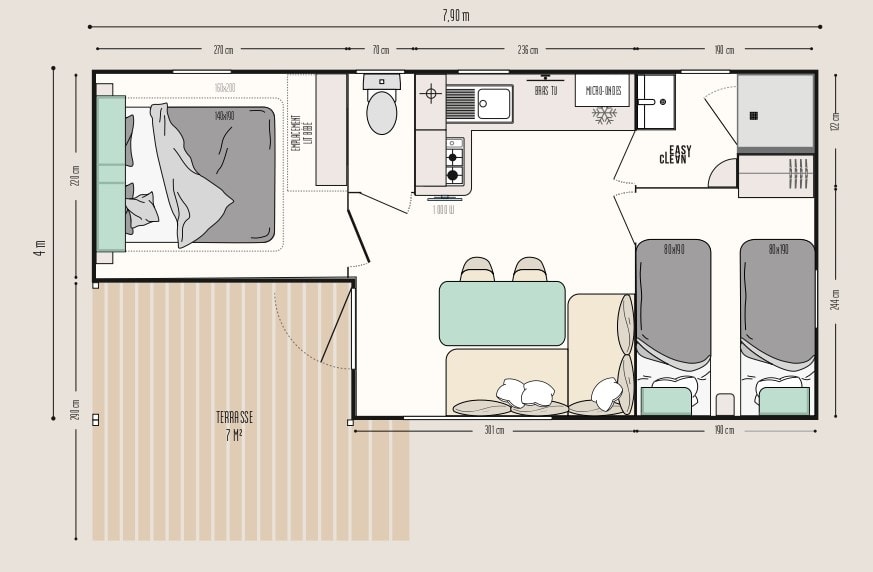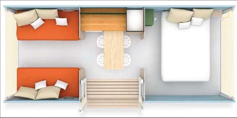 +/- 38 m² + überdachte Terrasse 10 m² für, 5 Pers. Das Wohnzimmer ist sehr hell und geht direkt auf die Terrasse. Zimmer 1: Doppelbett (160 x 200 cm), Regale und Garderobe. Zimmer 2: (3 Betten) 2 Betten nebeneinander (80 x 200 cm), 1 Bett darüber (80 x 200 cm), Wandschrank und Garderobe. Kochecke (Spüle, Kühlschrank, Geschirr, Mikrowelle). Wohnzimmer: Couch, Tisch mit 3 Stühlen. Badezimmer (mit Waschtisch, Spiegel, Dusche), WC (separat), Warmwasser, Terrasse mit Gartenmöbeln, Sonnenschirm. Dienstalter: weniger als 7 Jahre.
