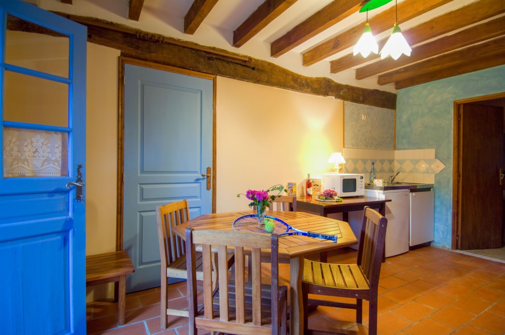 +/- 34 m² + überdachte Terrasse de 9 m² - 3 Pers. Landesübliche, gemauerte Konstruktion Lage : auf einer kleinen Anhöhe oberhalb des Campingplatzes nahe des alten Bauernhofs. 1 Wohnzimmer mit Massivholzmöbeln, 4 Stühlen, 1 Tisch, 1 Couch und 1 Sessel oder mit Klappcouch. Regale und Garderobe, gut ausgestattete Kochecke, 1 Schlafabteil mit 1 Bett 160 cm und 1 Bett 80 cm. Bad mit WC, Dusch, Waschbecken und Spiegel, Warmwasser. Gartenmöbel und 1 Sonnenschirm. Erneuert im Jahre 2008. Gîtes sind nicht Teil der Klassifizierung.
