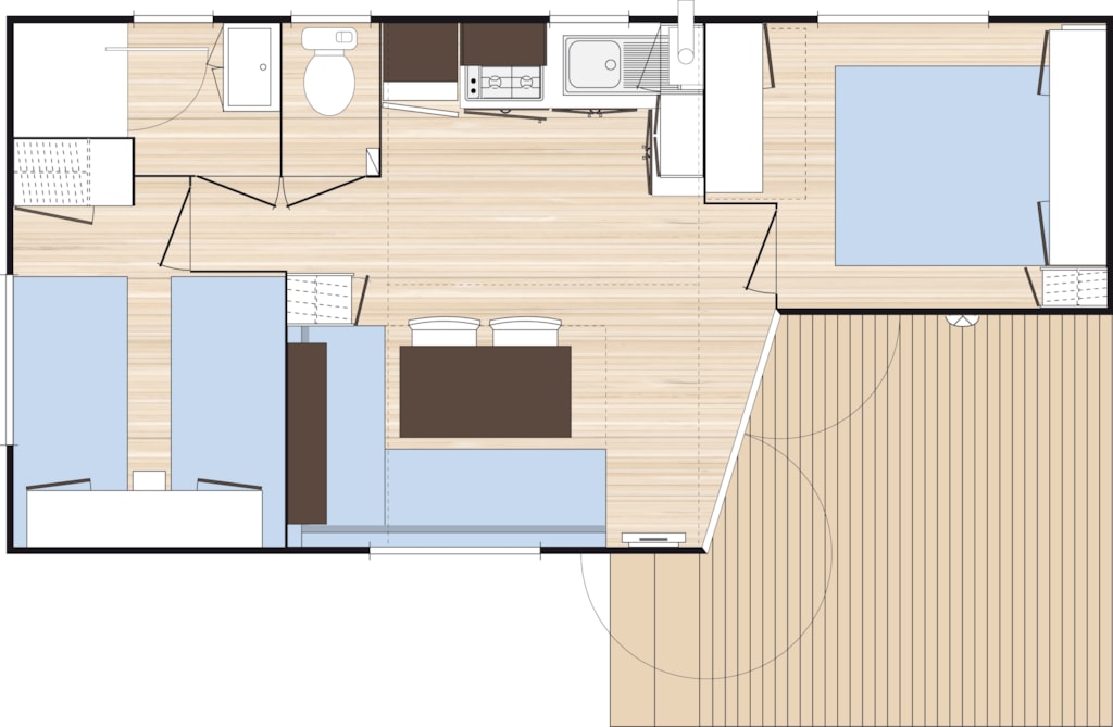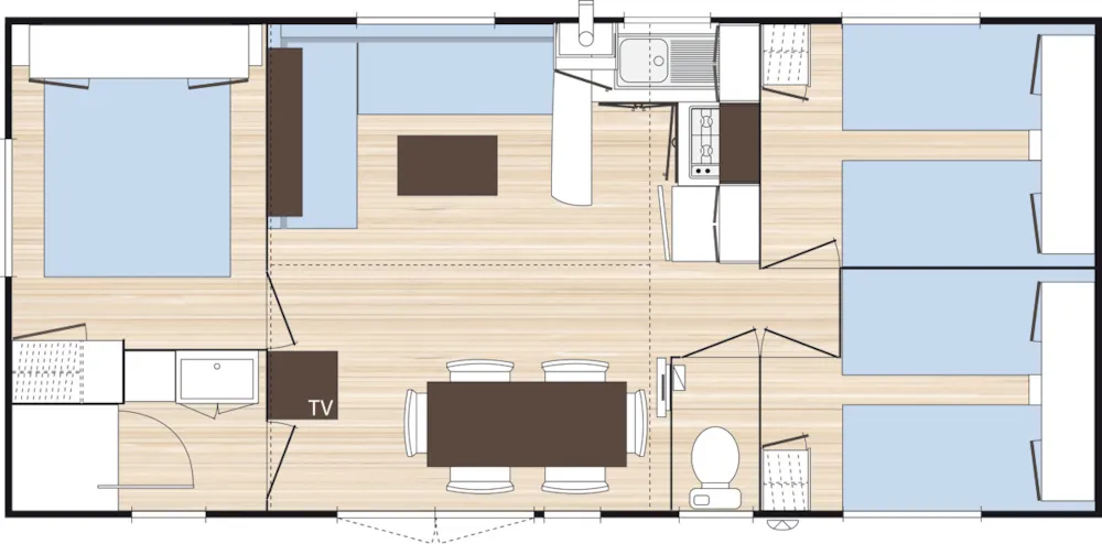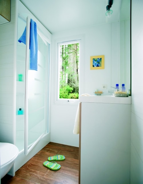 Gönnen Sie sich einen Aufenthalt mit allem Komfort in diesem 29 m² großen Mobilheim HomeFlower Premium mit modernem und gemütlichem Design. Es ist ideal für einen Urlaub mit der Familie oder mit Freunden, bietet Platz für bis zu 4 Personen und umfasst: