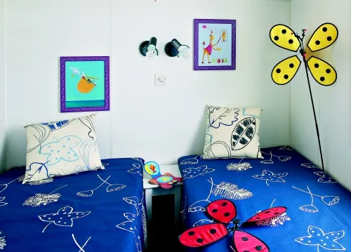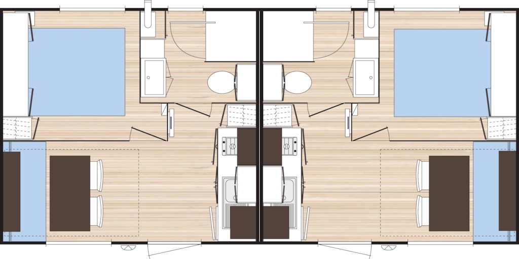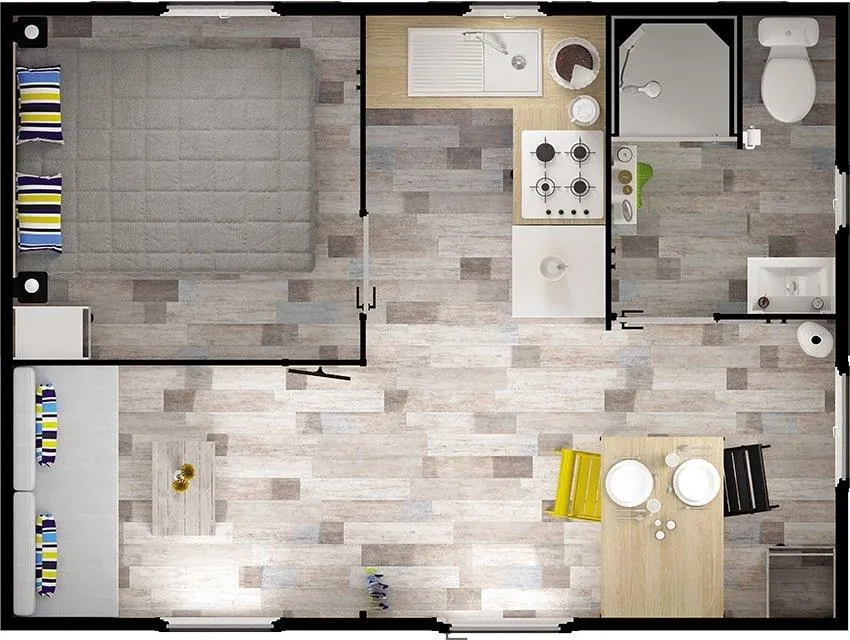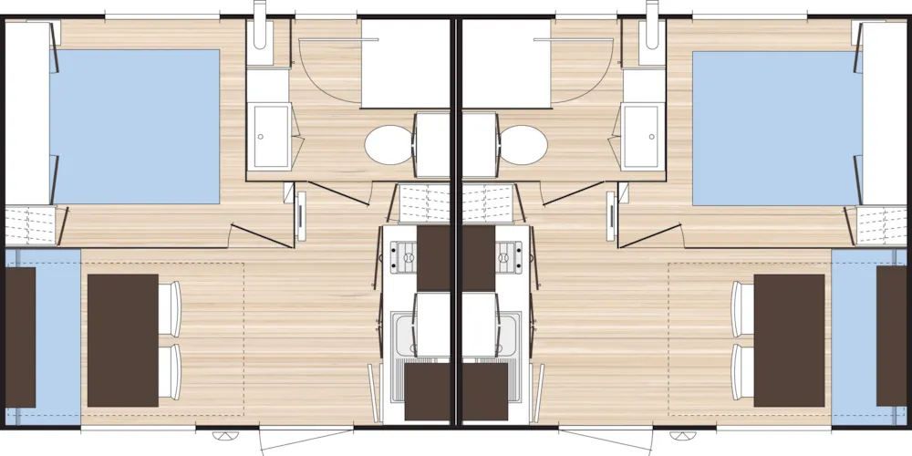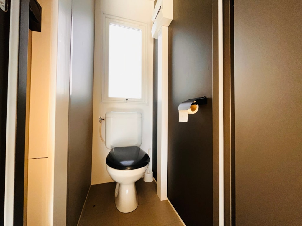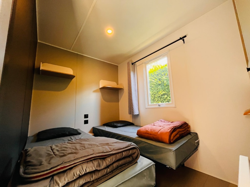 Gönnen Sie sich einen Aufenthalt mit allem Komfort in diesem 35 m² großen HomeFlower Premium mit modernem und gemütlichem Design. Es ist ideal für einen Urlaub mit der Familie oder mit Freunden, bietet Platz für bis zu 6 Personen und umfasst: