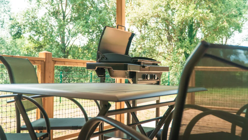 Im Außenbereich erwartet Sie eine 18 m² große, halb überdachte Terrasse in Südlage mit Blick auf die Loire. Gartenmöbel und eine Gas-Plancha stehen für Ihre Mahlzeiten im Freien zur Verfügung. Parkplätze für Fahrzeuge befinden sich in der Nähe des Mobilheims.