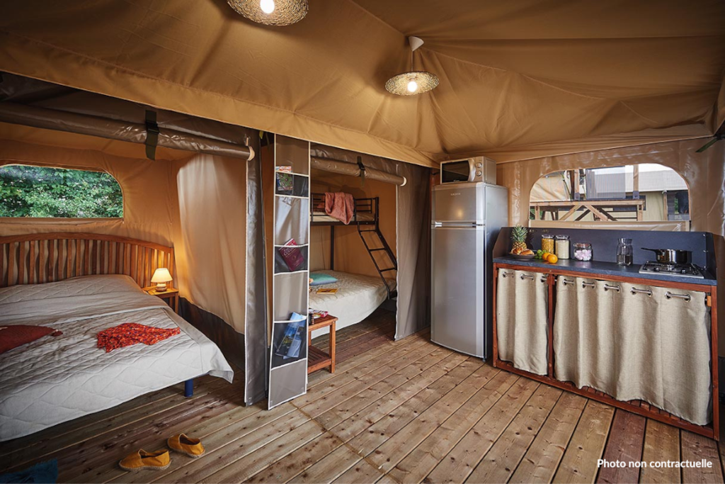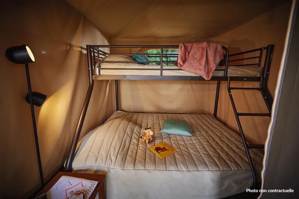 Einen komfortablen Schlafbereich aus Segeltuch, ausgestattet mit zwei Einzelmatratzen,