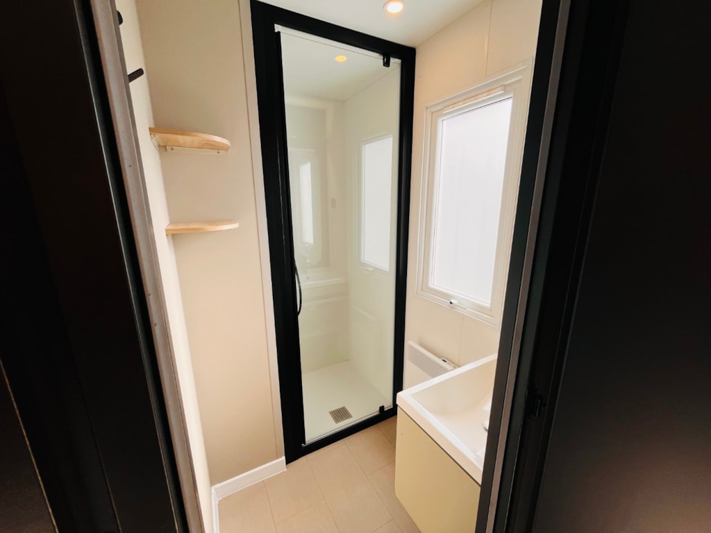 Ein modernes Badezimmer mit geräumiger Dusche und separatem WC