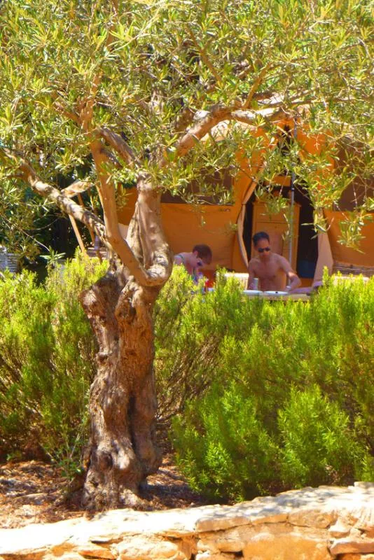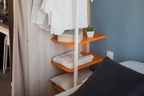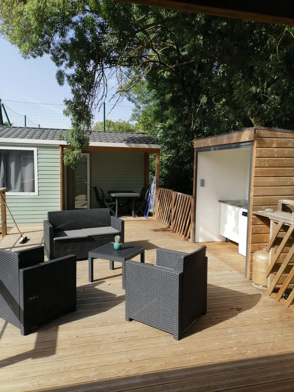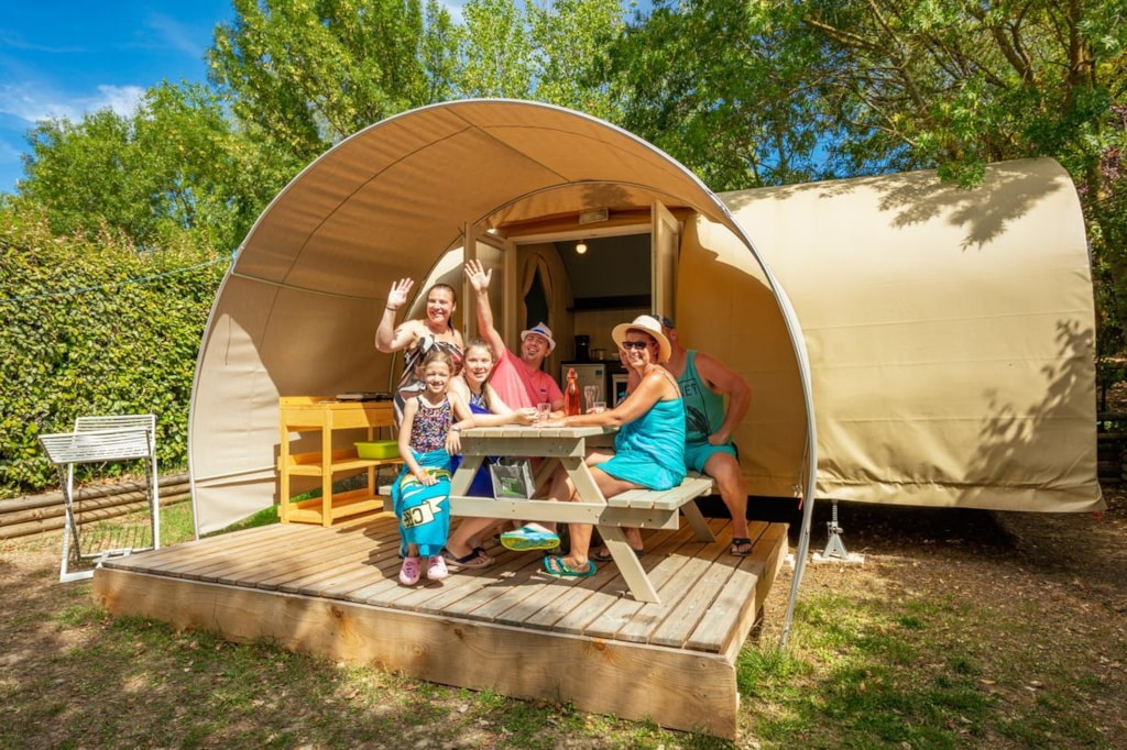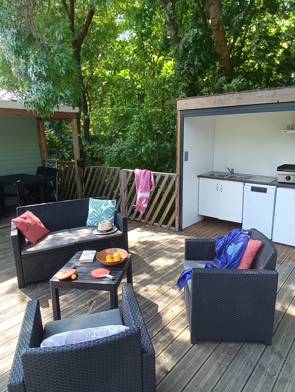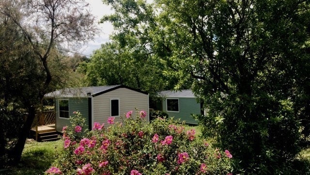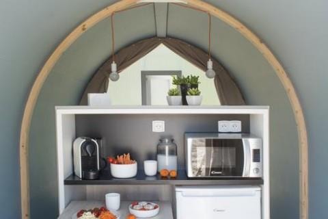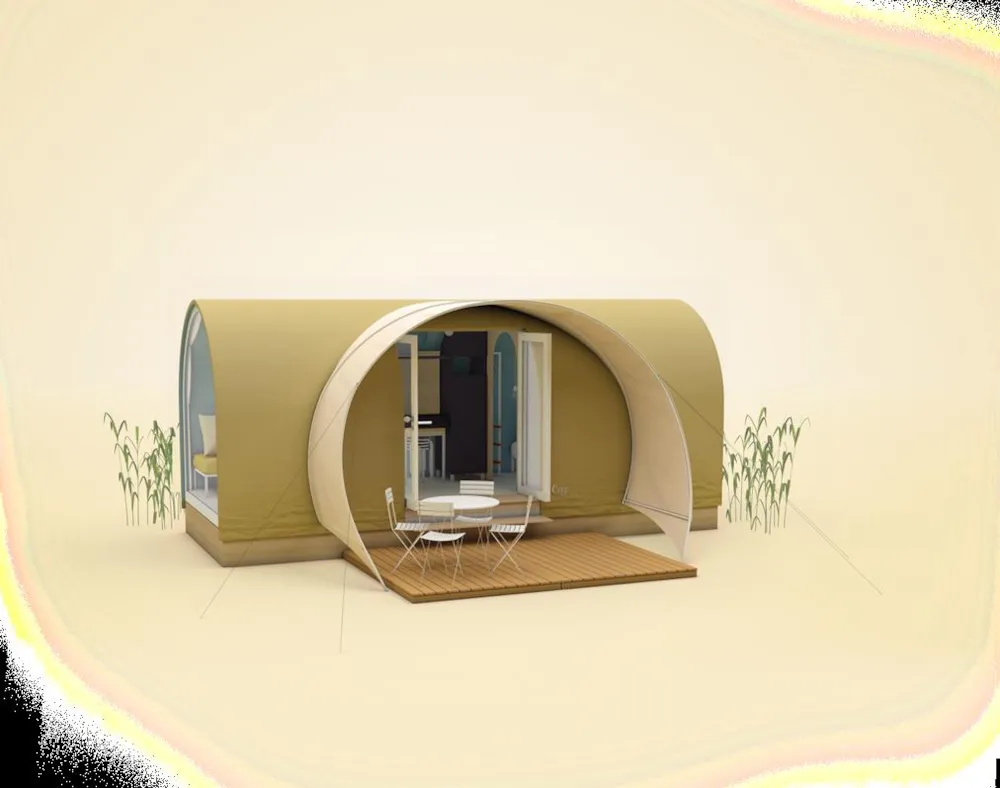 Das Coco Sweet ist eine Mischung aus Zelt und Mobilheim und bietet eine einzigartige Kombination aus Originalität und Komfort inmitten der Natur. Ohne Wasseranschluss (ein Wasserhahn befindet sich außerhalb auf dem Grundstück), ohne Heizung und ohne Sanitäranlagen (die Gemeinschaftssanitäranlagen befinden sich ganz in der Nähe und sind bequem zu erreichen). Fläche 17 m² + überdachte Terrasse.