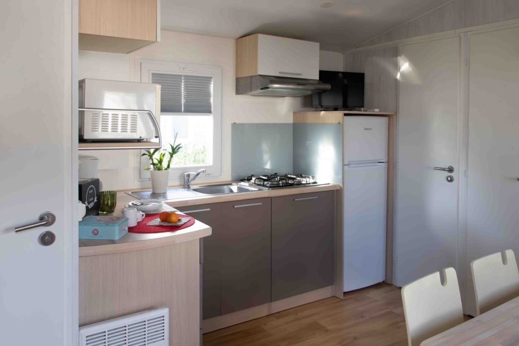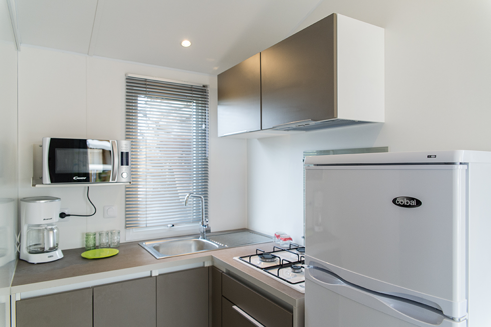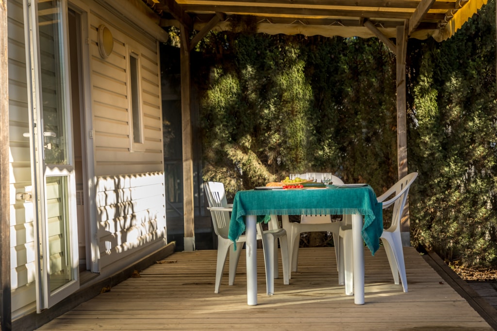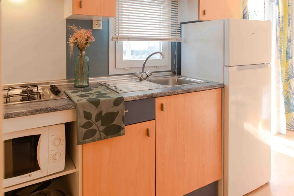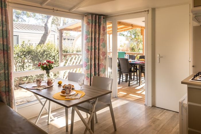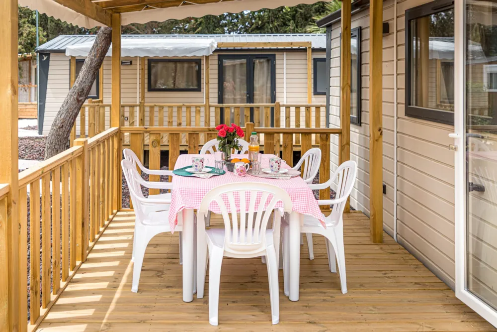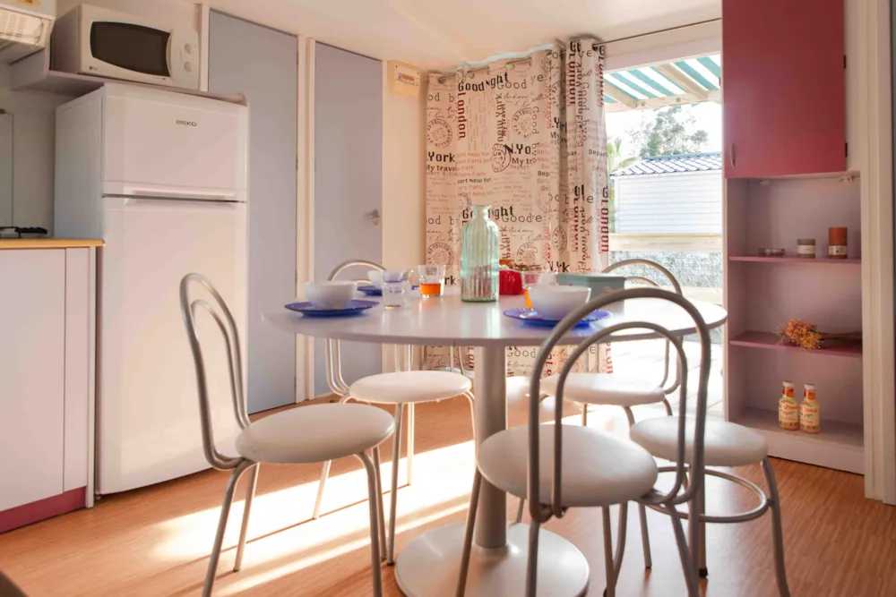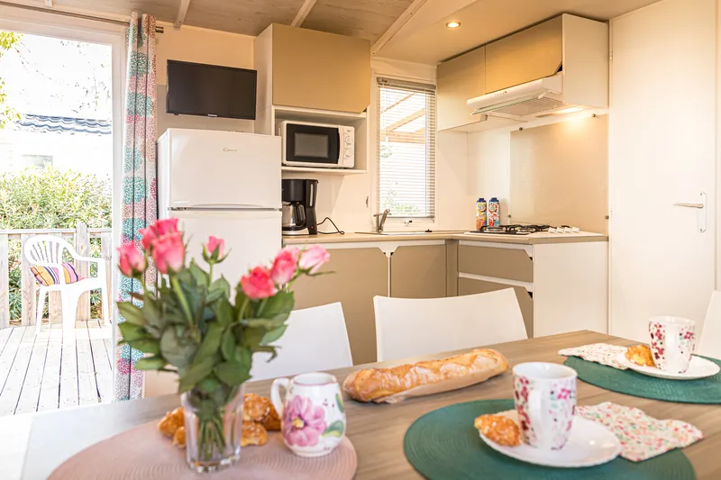 Surface : 25m². 1 chambre avec 1 grand lit, 1 chambre avec 2 lits jumeaux. Toilettes. Salle de bain comprenant: 1 cabine de douche, 1 lavabo. Coin séjour cuisine comprenant: 1 table + 2 tabourets+ banquette, 1 grand réfrigérateur congélateur, 1 plaque de cuisson, 1 cafetière électrique, , micro-onde, 1 évier eau chaude. Terrasse couverte incorporée avec salon de jardin.
