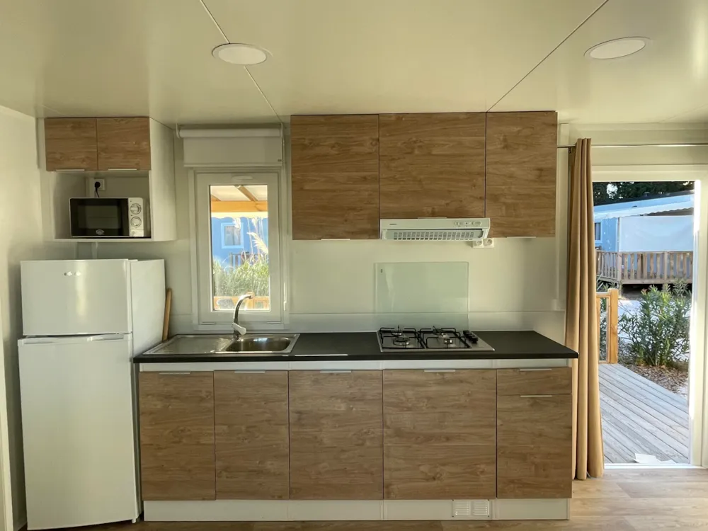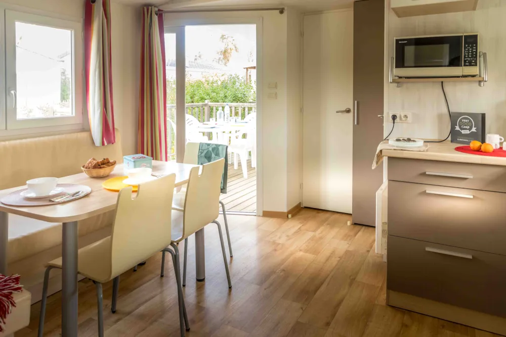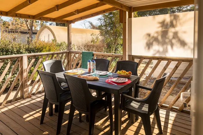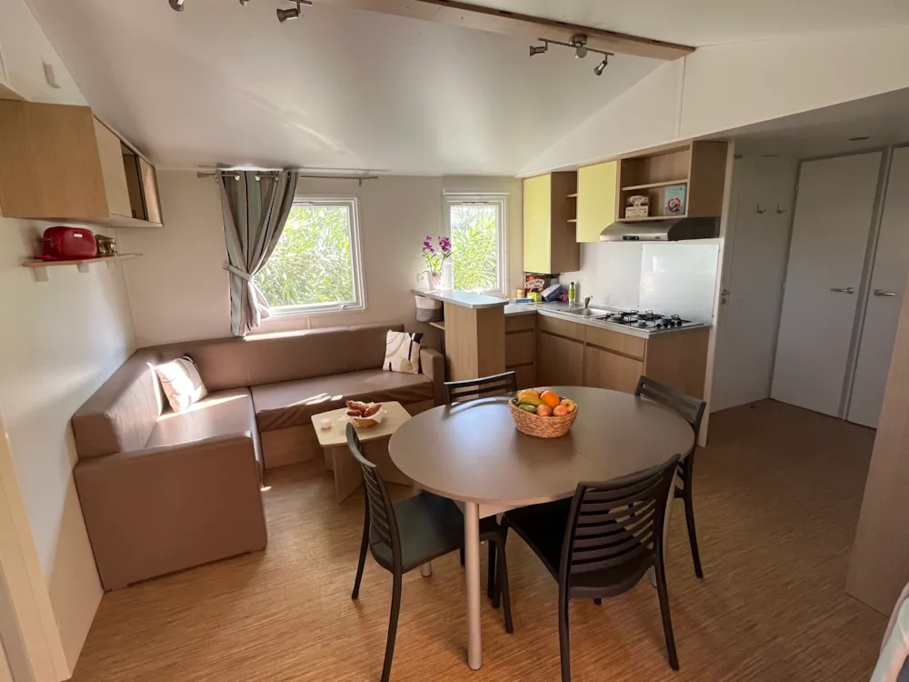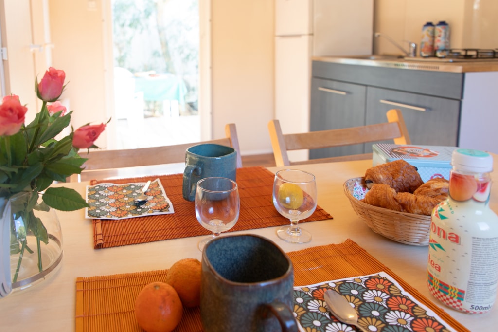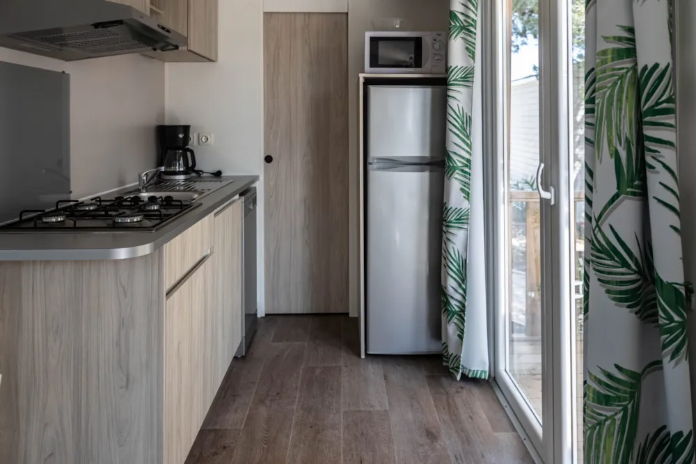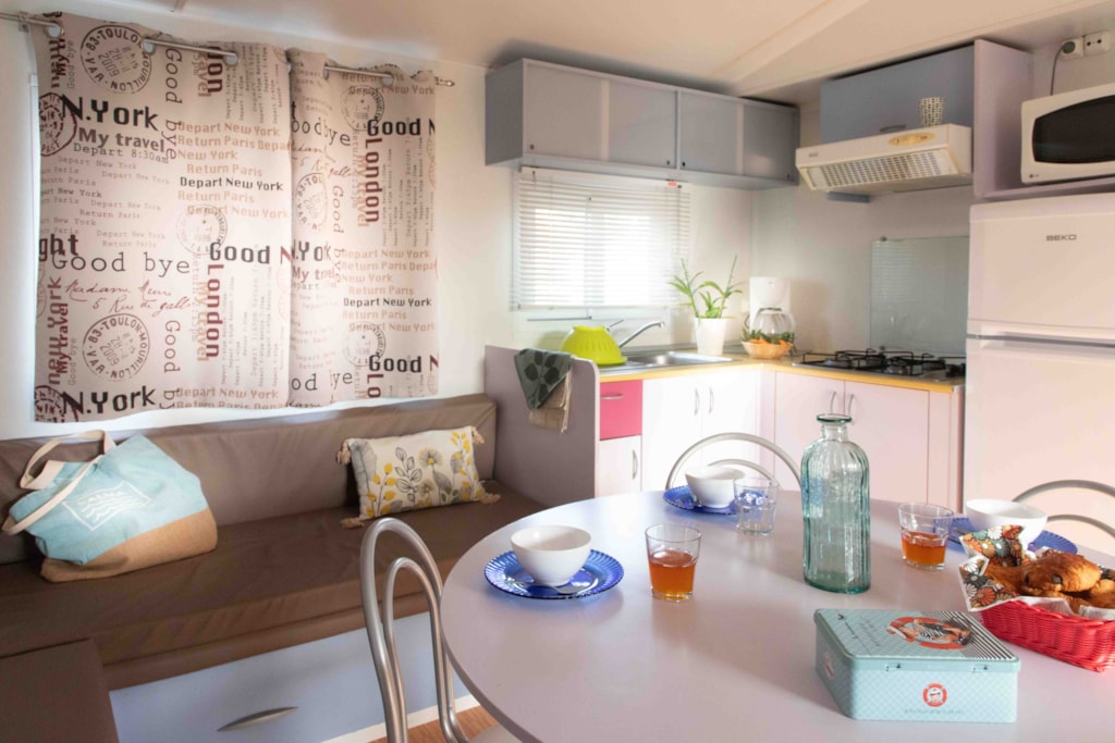 Surface : 25m². 1 chambre avec 1 grand lit, 1 chambre avec 2 lits jumeaux. Toilettes. Salle de bain comprenant: 1 cabine de douche, 1 lavabo. Coin séjour cuisine comprenant: 1 table + 2 tabourets+ banquette, 1 grand réfrigérateur congélateur, 1 plaque de cuisson, 1 cafetière électrique, , micro-onde, 1 évier eau chaude. Terrasse couverte incorporée avec salon de jardin.