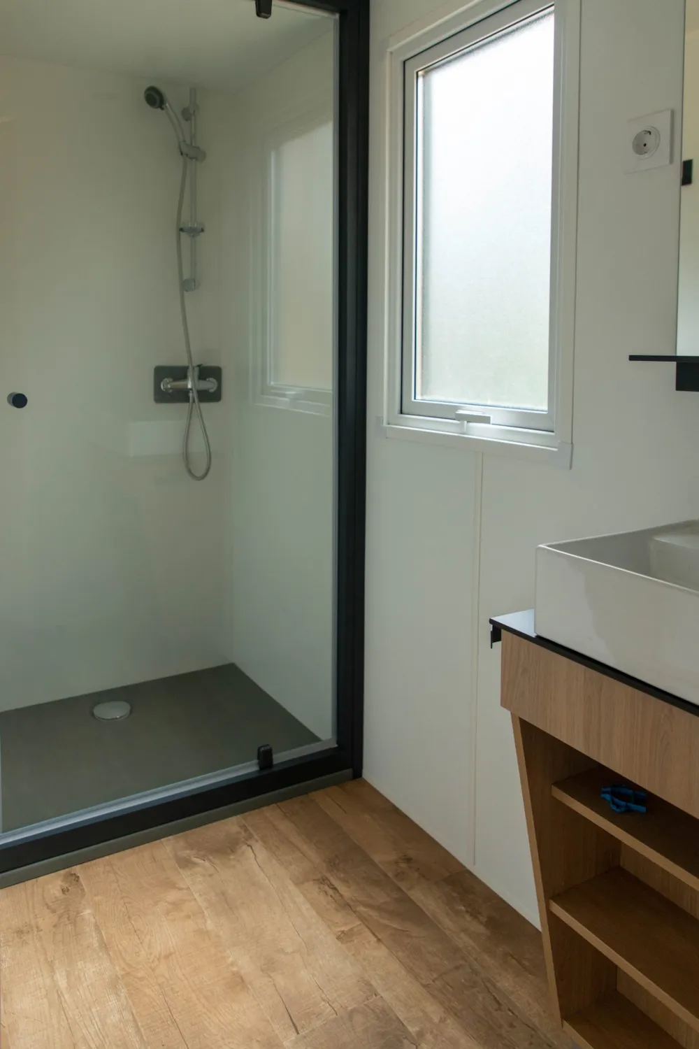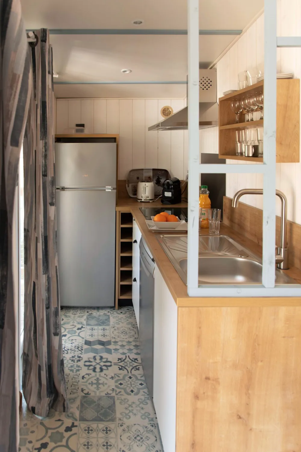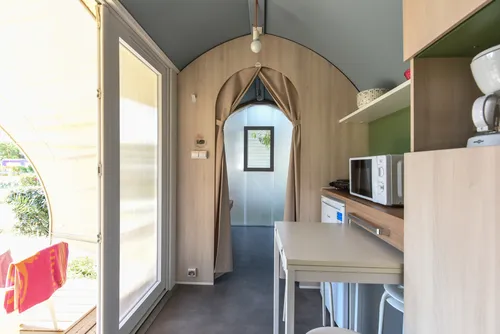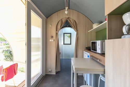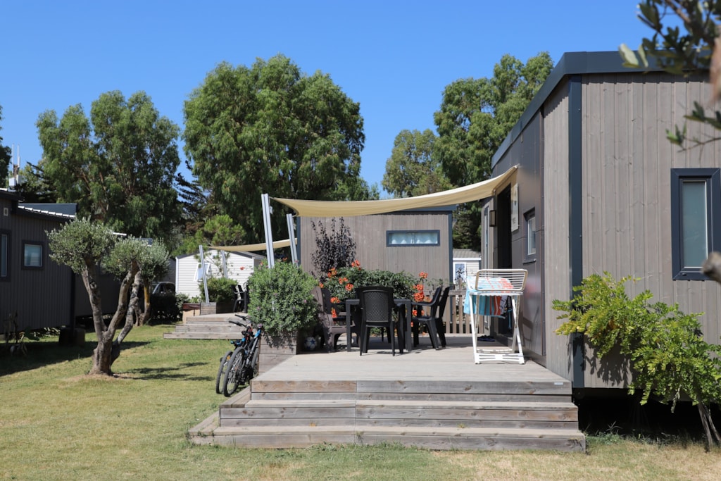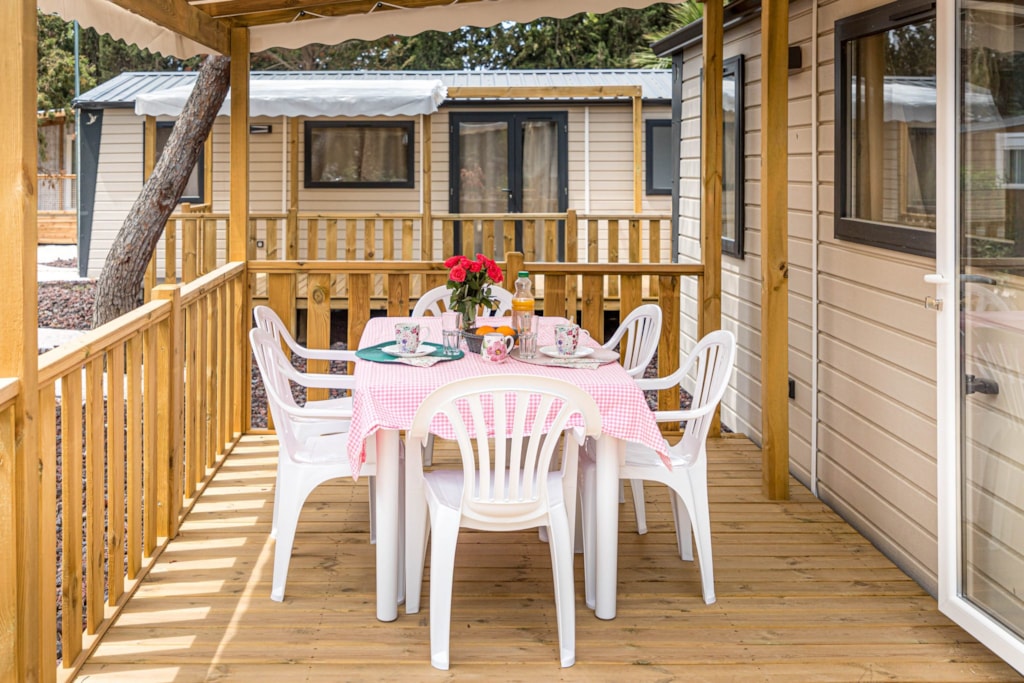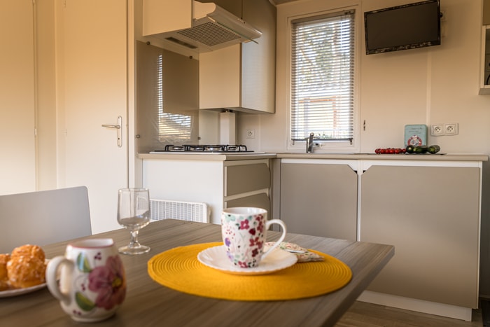 Surface : 25m². 1 chambre avec 1 grand lit, 1 chambre avec 2 lits jumeaux. Toilettes. Salle de bain comprenant: 1 cabine de douche, 1 lavabo. Coin séjour cuisine comprenant: 1 table + 2 tabourets+ banquette, 1 grand réfrigérateur congélateur, 1 plaque de cuisson, 1 cafetière électrique, , micro-onde, 1 évier eau chaude. Terrasse couverte incorporée avec salon de jardin.