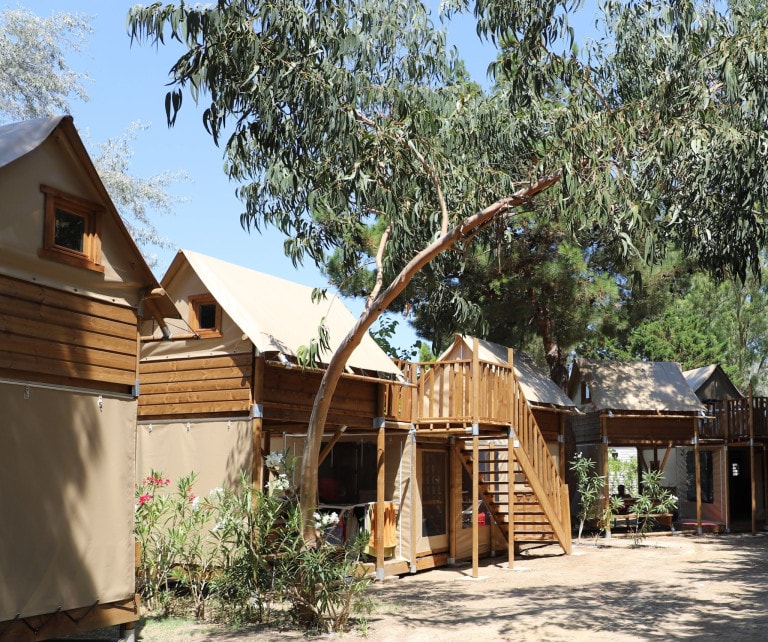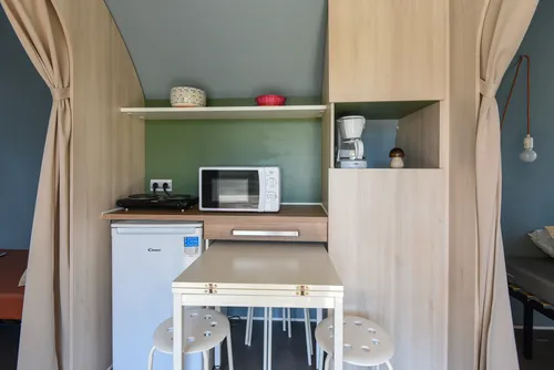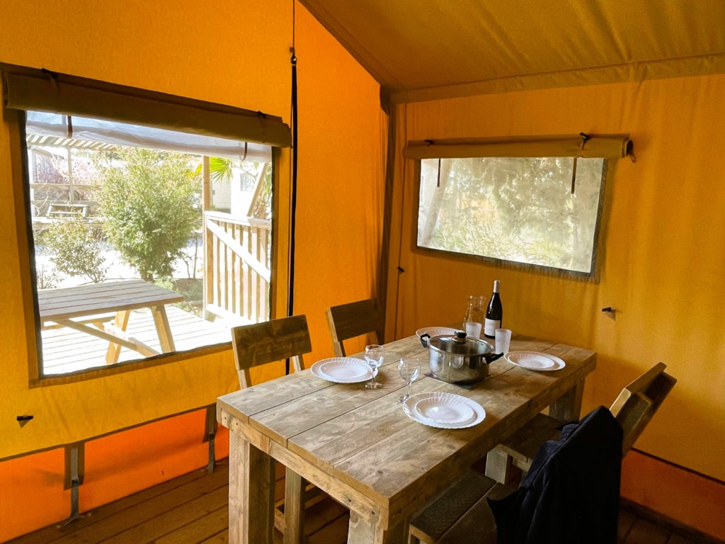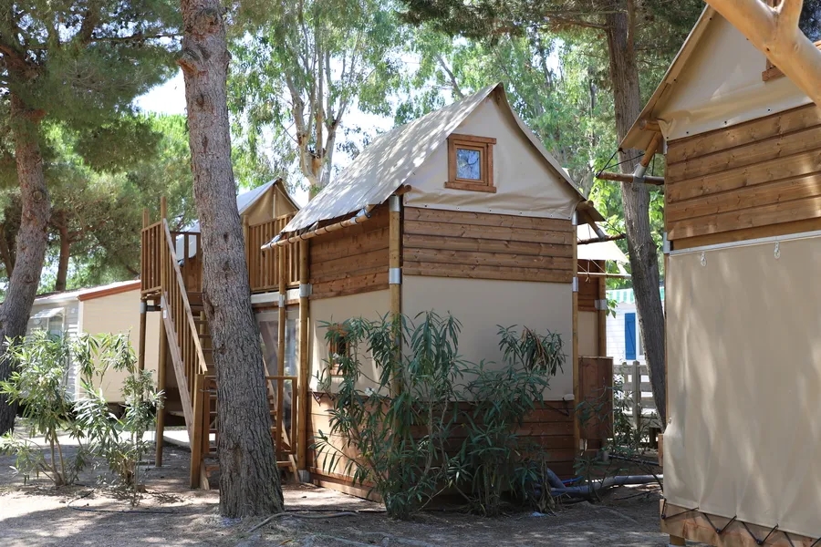 Cabane en bois et toile sur pilotis 27 m² + 19 m² terrasse A l’étage : 1 chambre lit double 2 chambres avec 2 lits simples Au rez de chaussée : espace repas avec table/ bancs et cloison amovible cuisine équipée (évier, plan de travail, réchaud 2 feux électriques, rangements, frigo) salle de bain (cabine de douche, lavabo, étagères, wc) Murs & cloisons en bois massif. Toiles polyester.