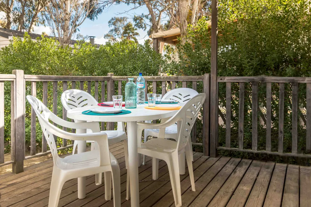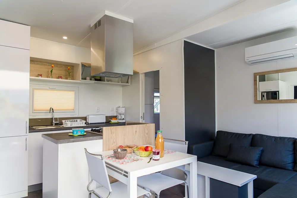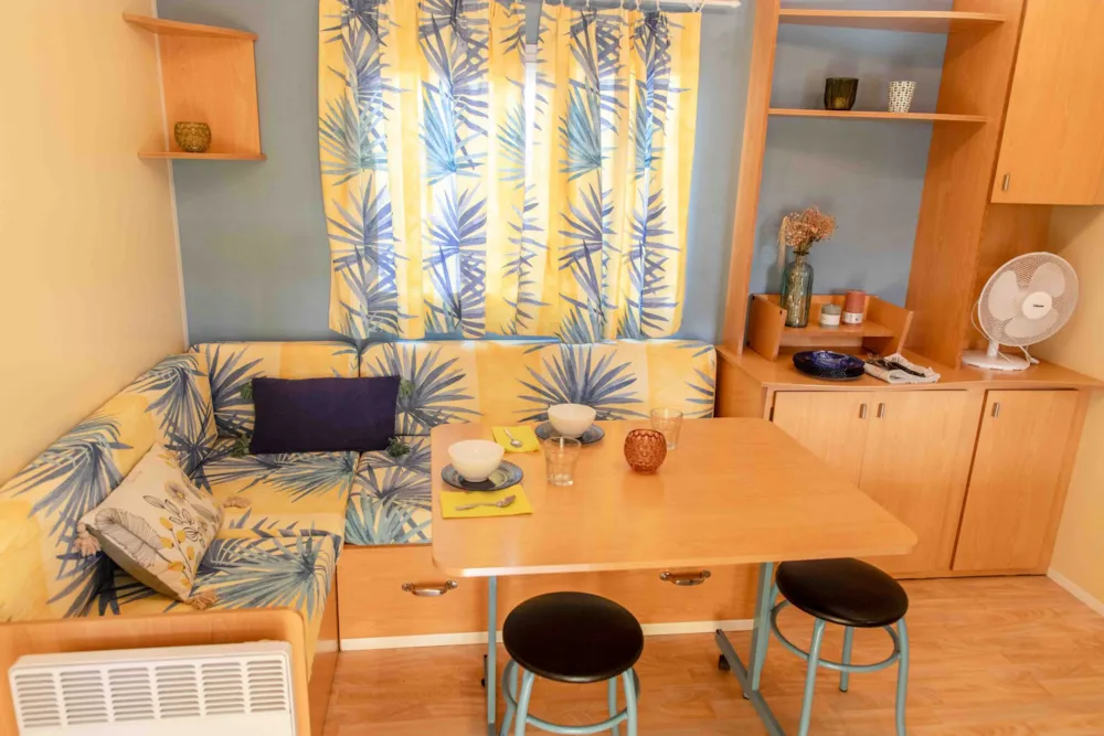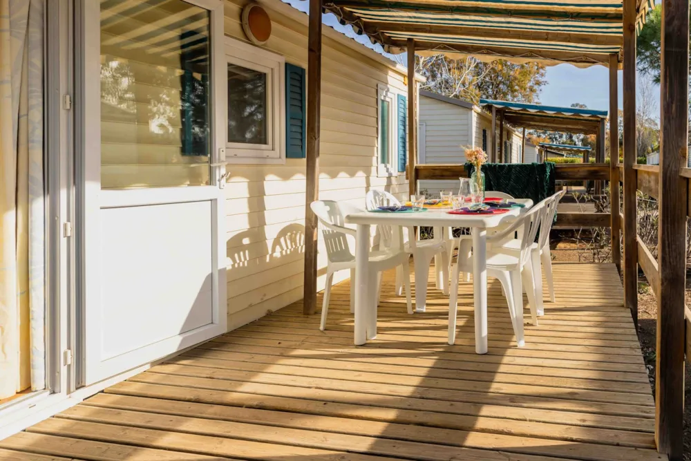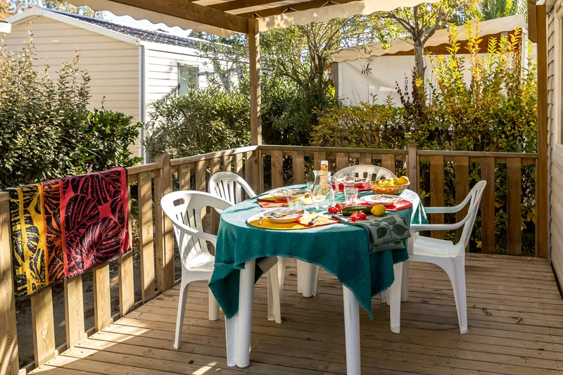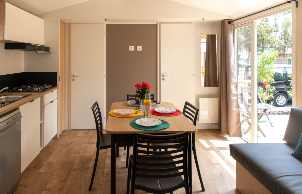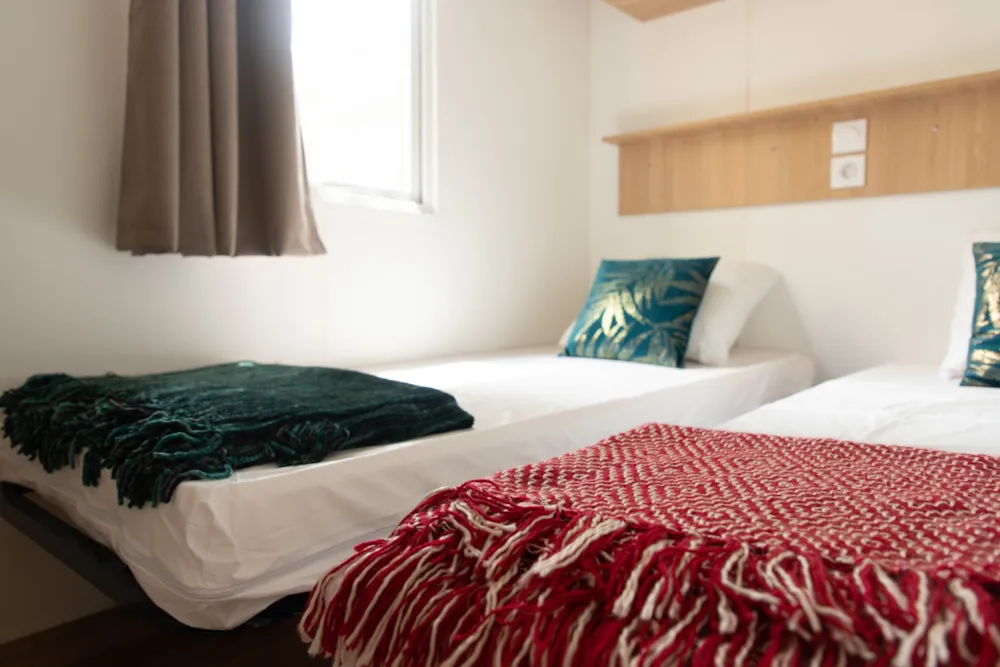Dimensions : 25m² + terrasse 2 chambres : 1 chambre avec 1 grand lit, 1 chambre avec 3 lits dont 1 superposé Salle de bain avec douche, lavabo et WC Frigo avec freezer, micro-ondes, vaisselles, plaques de cuisson, cafetière électrique, rangements… Terrasse couverte avec mobilier de jardin en teck 2 transats Ancienneté : 5 à 10 ans
