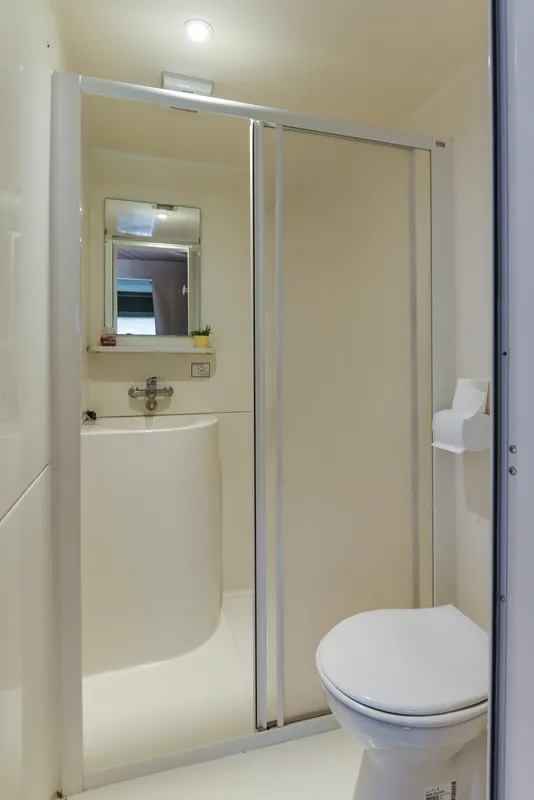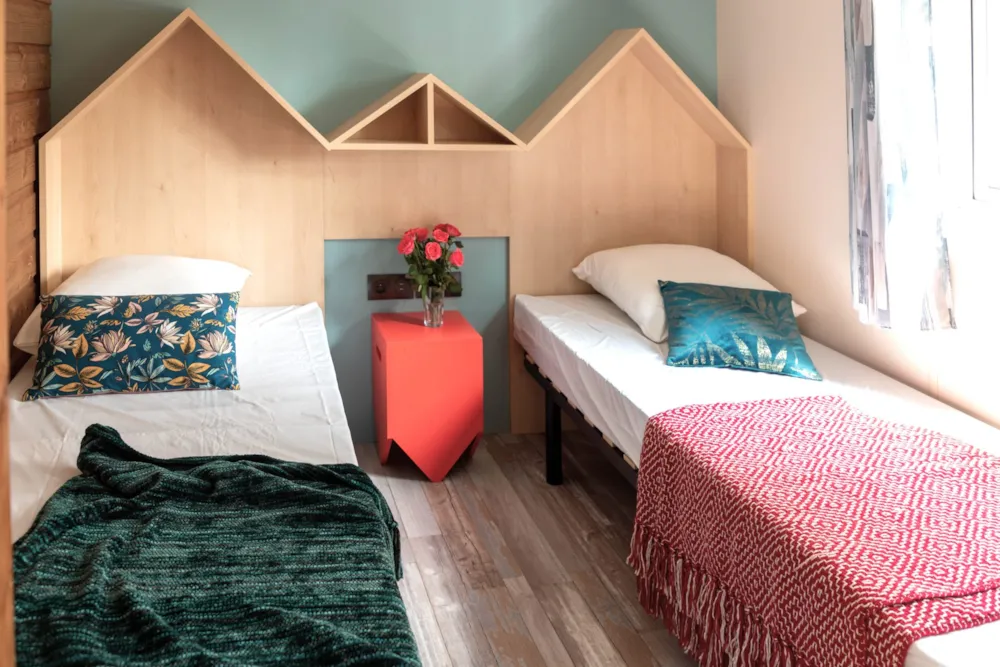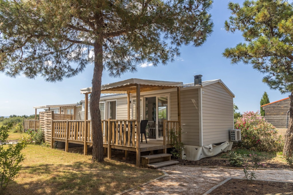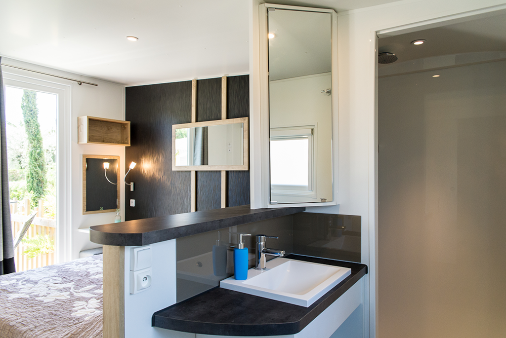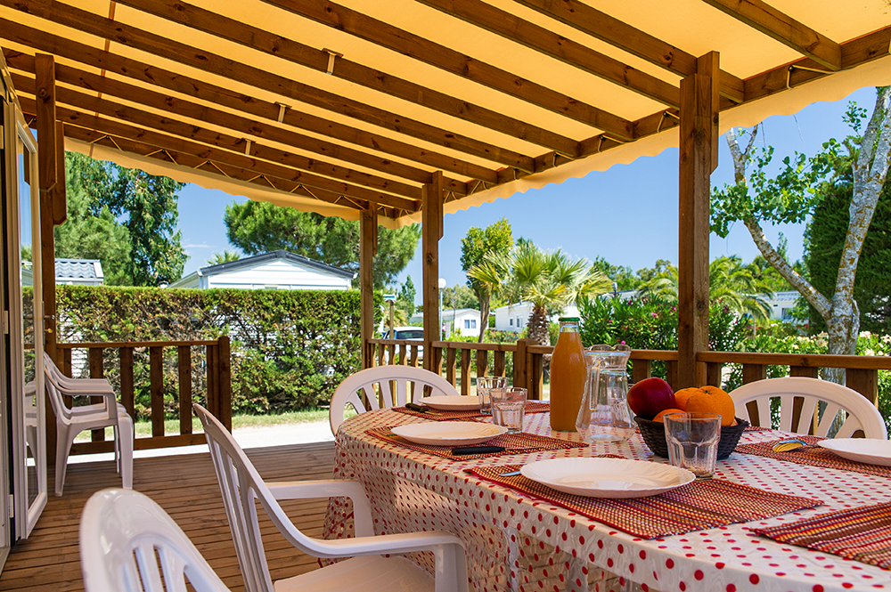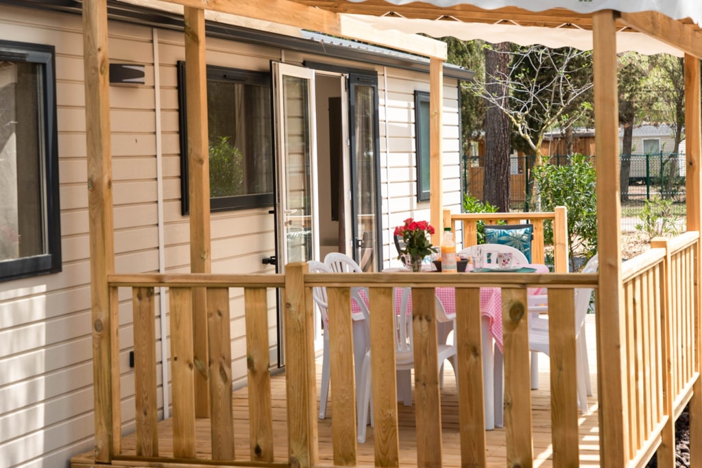 Dimensions : 25m² + terrasse 2 chambres : 1 chambre avec 1 grand lit, 1 chambre avec 3 lits dont 1 superposé Salle de bain avec douche, lavabo et WC Frigo avec freezer, micro-ondes, vaisselles, plaques de cuisson, cafetière électrique, rangements… Terrasse couverte avec mobilier de jardin en teck 2 transats Ancienneté : 5 à 10 ans