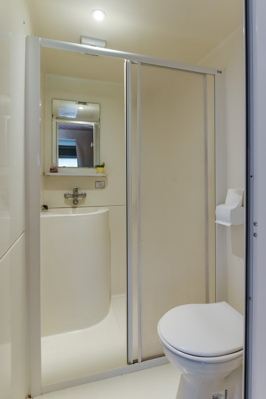 1 chambre avec 2 lits, une salle d'eau avec une cabine de douche, un meuble vasque.