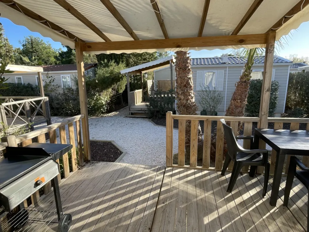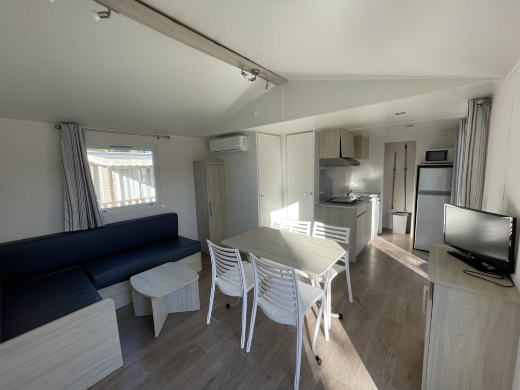 1 chambre avec 1 grand lit 1 chambre avec 2 lits Toilettes Salle de bain comprenant: 1 cabine de douche, 1 lavabo Coin séjour cuisine comprenant: 1 table + 2 chaises+ banquette, 1 grand réfrigérateur congélateur, 1 plaque de cuisson, 1 micro-onde, 1 cafetière électrique,1 évier eau chaude. Terrasse couverte incorporée avec salon de jardin. Clim et TV incluses. Surface :25m².