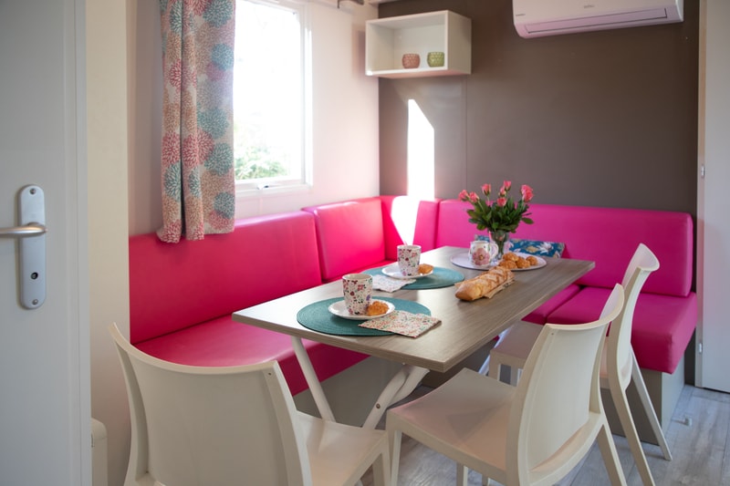 Coin salon-séjour comprenant 1 table + chaises, une banquette.