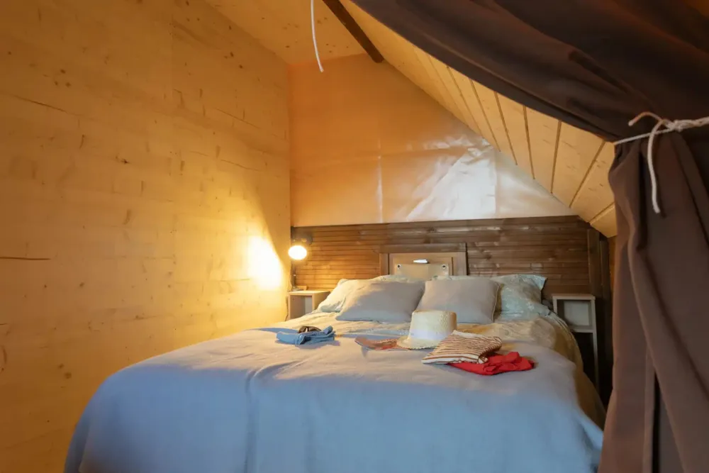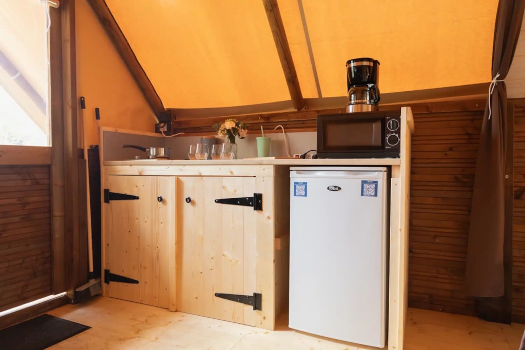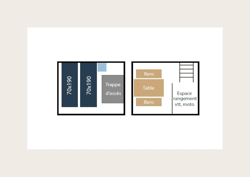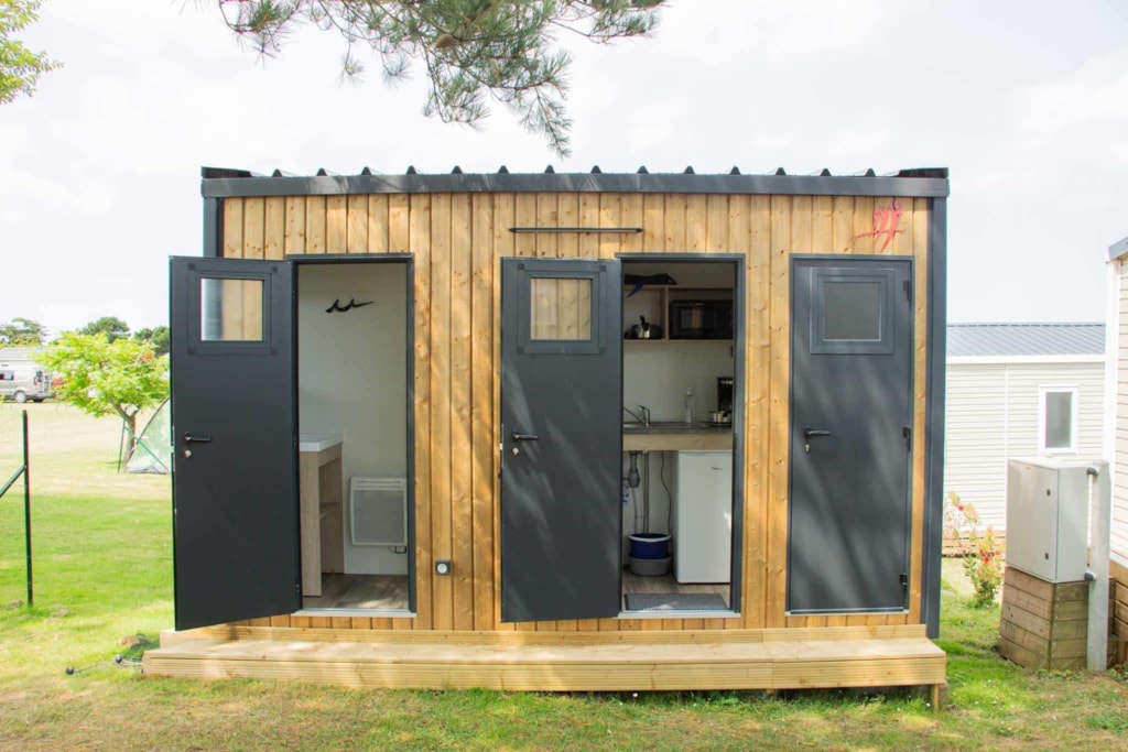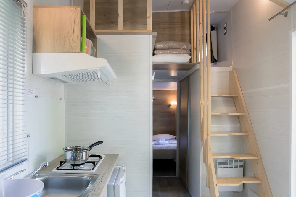 Unsere Tiny Home-Unterkunft ist ein echtes kleines Haus auf Rädern. Ein gemütliches Ambiente, kombiniert mit einem gut eingerichteten und optimierten Raum. Im Erdgeschoss finden Sie ein Wohnzimmer mit ausgestatteter Küchenzeile und Badezimmer. Im Obergeschoss befindet sich das Schlafzimmer im Zwischengeschoss, das mit zwei Einzelbetten ausgestattet ist und die Kinder glücklich machen wird.